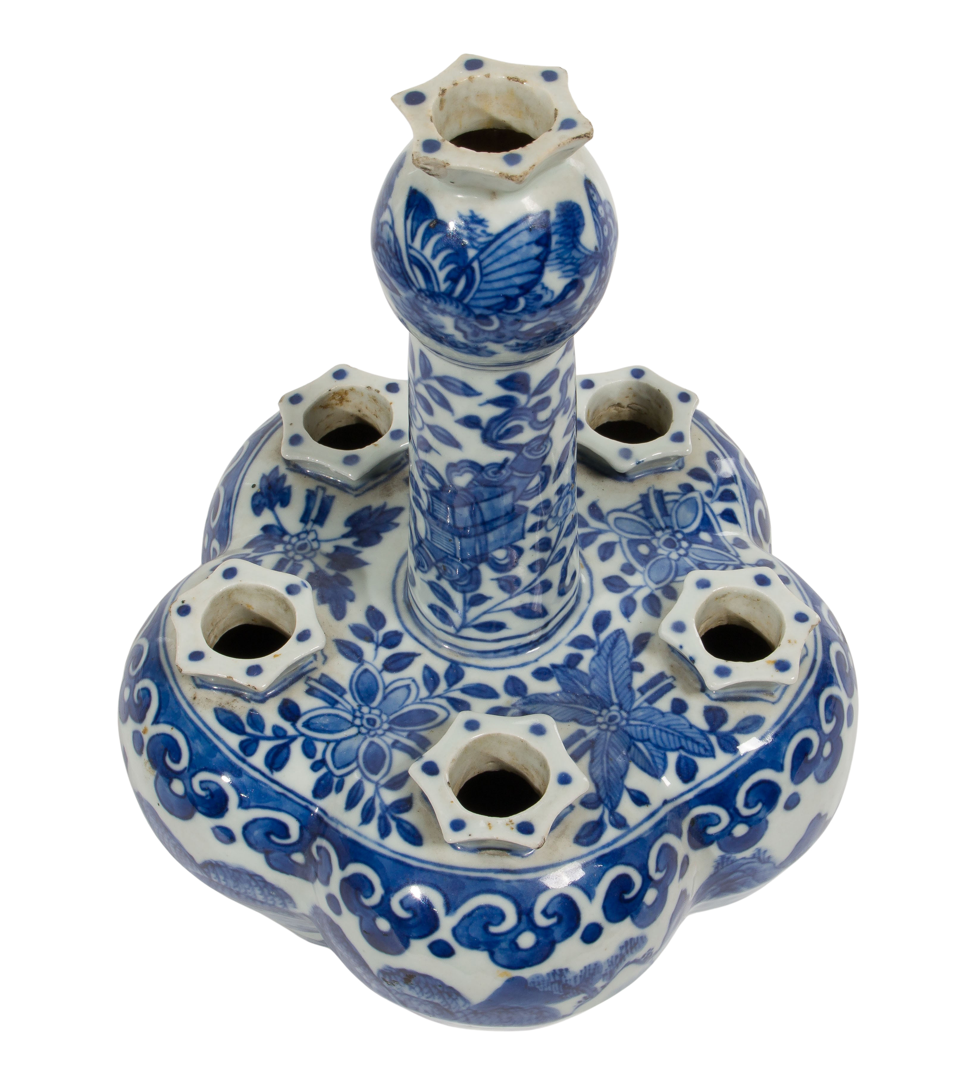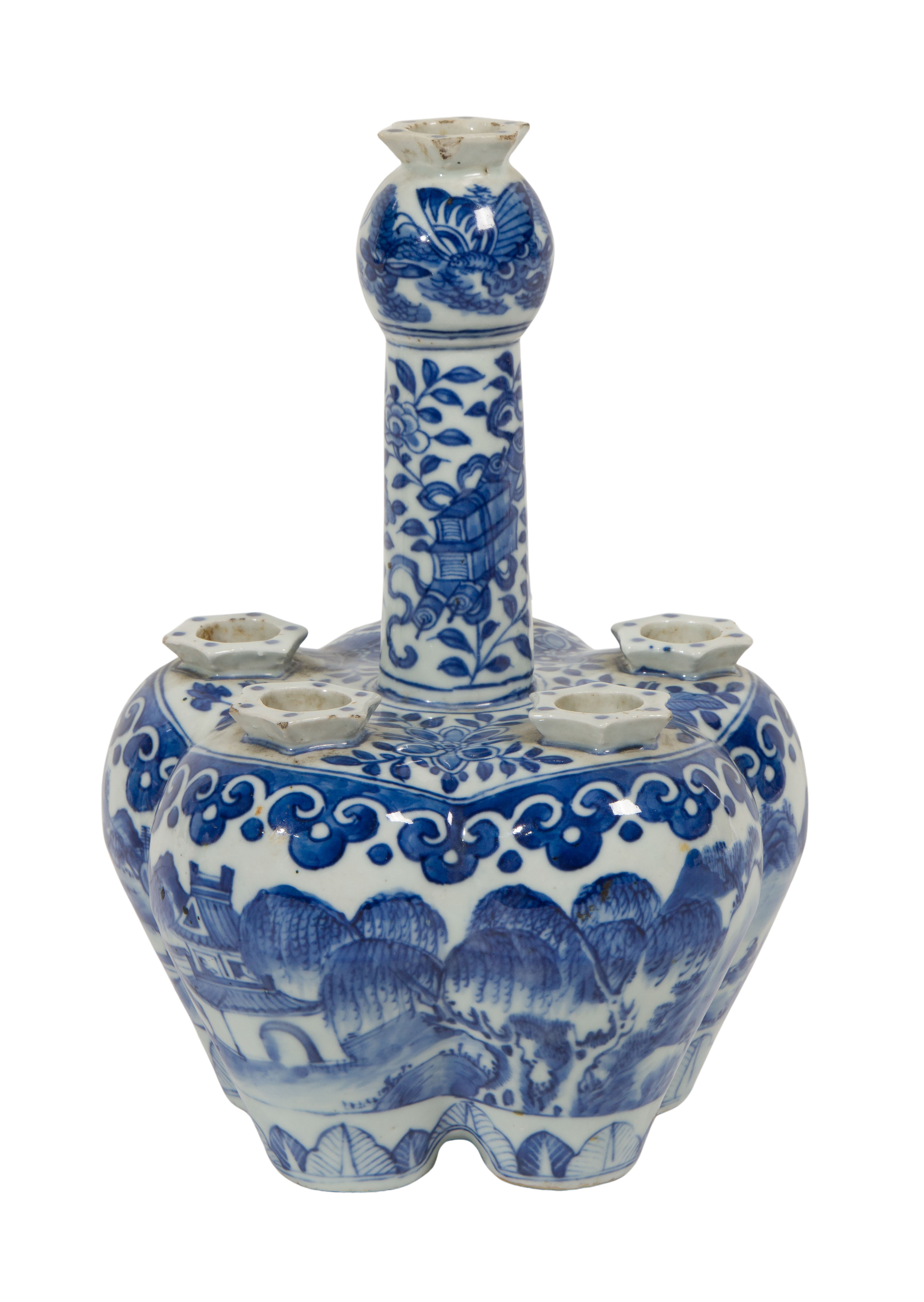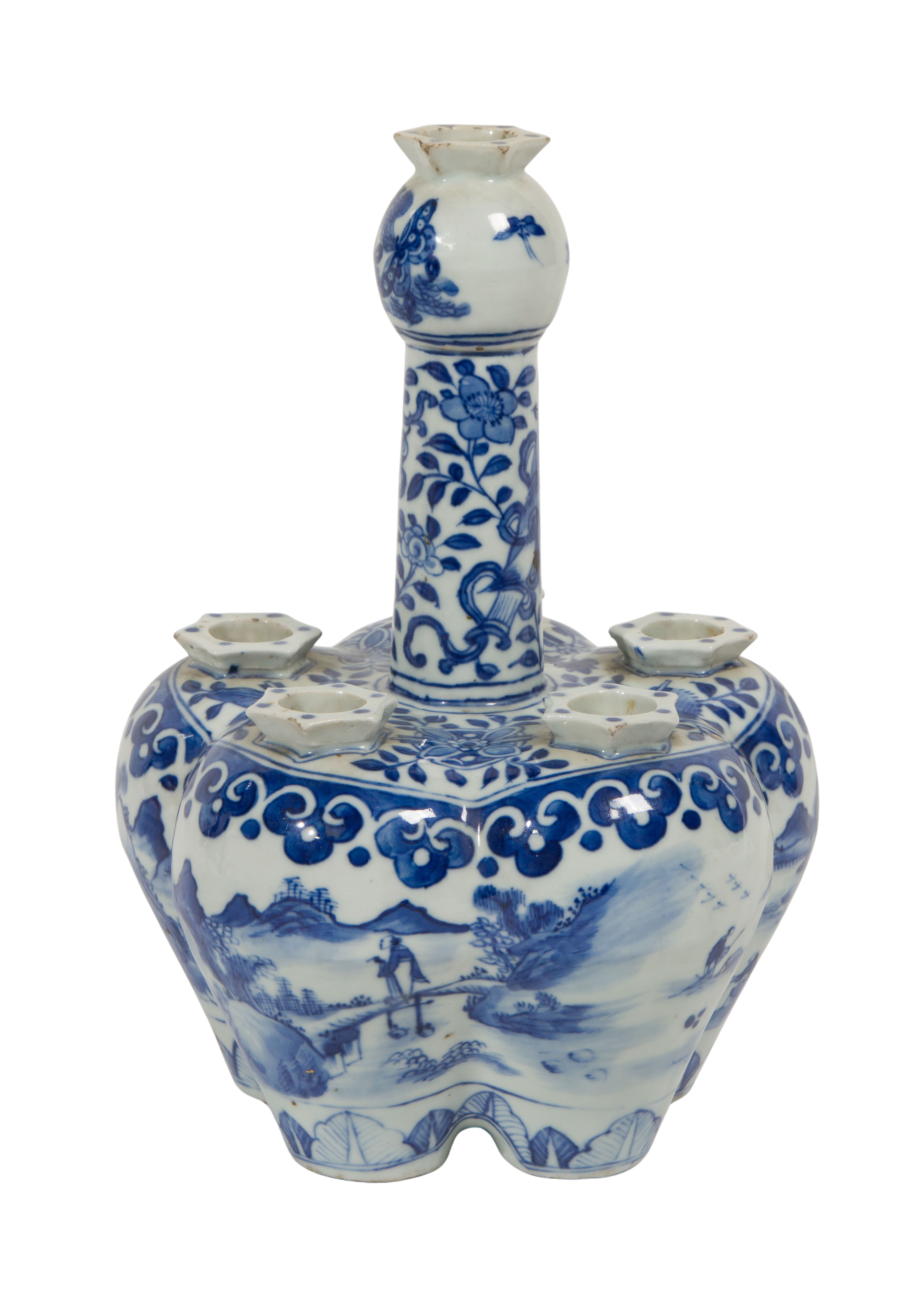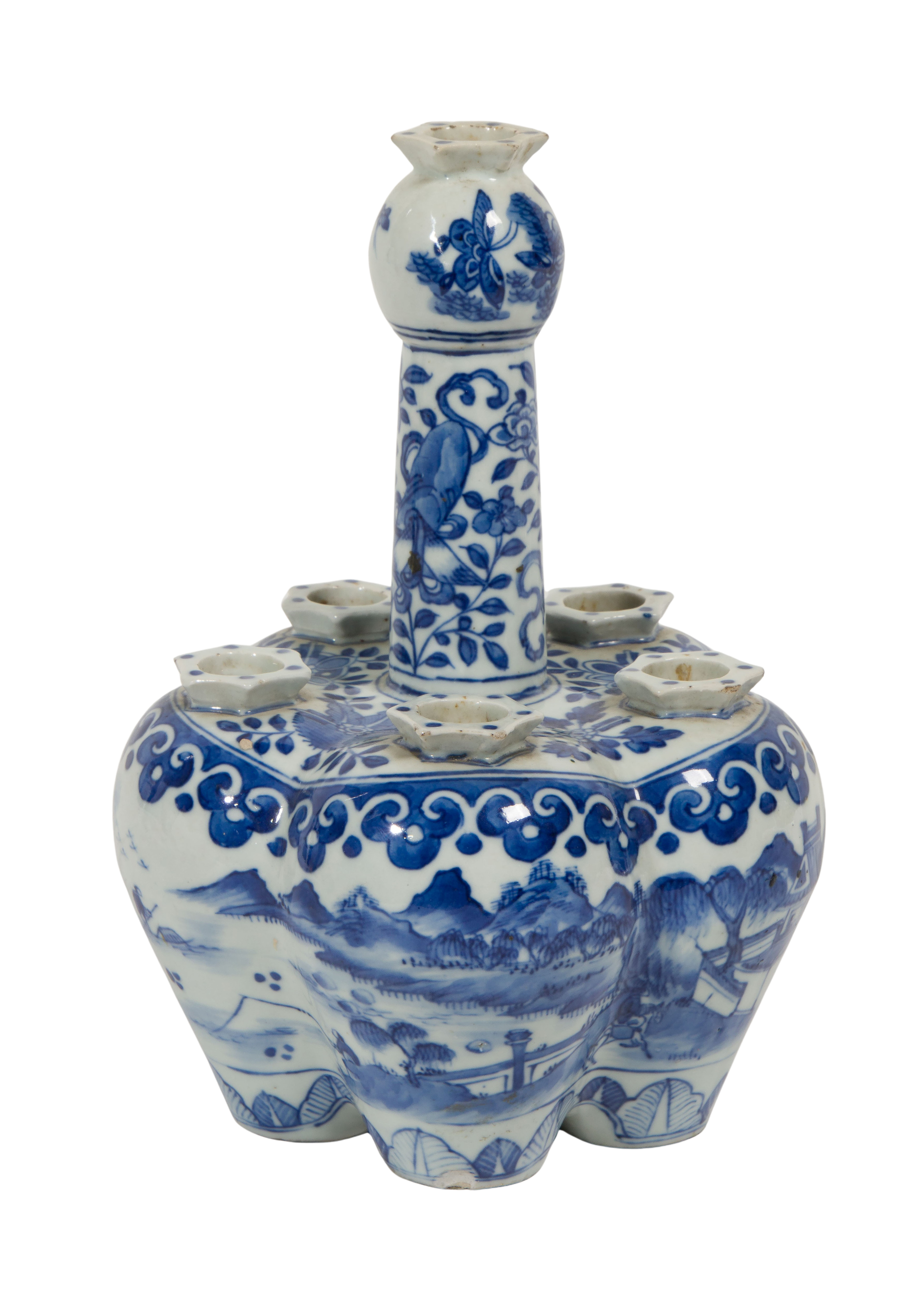 Having a long neck and five bulb holders, floral and landscape motif throughout
