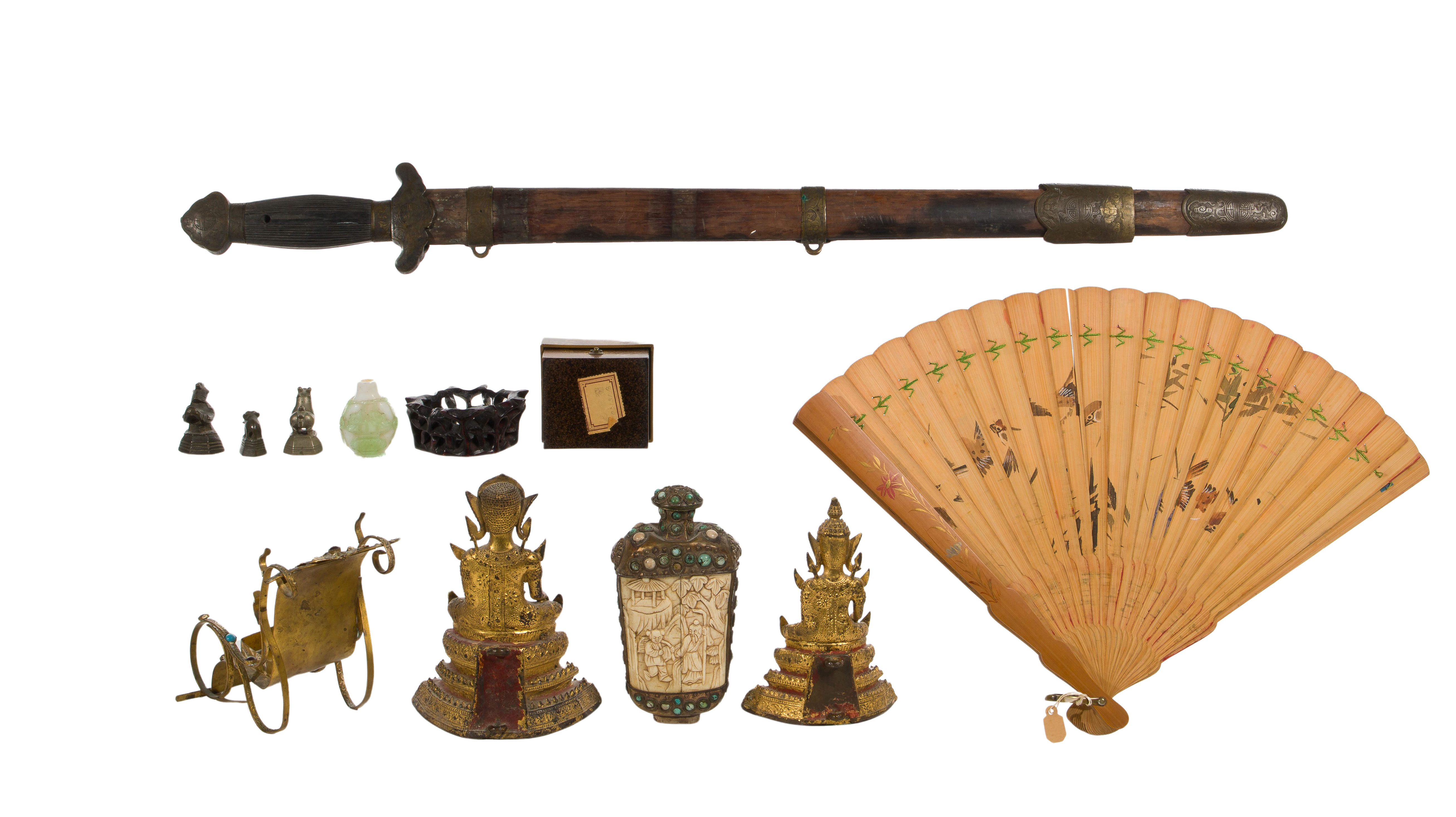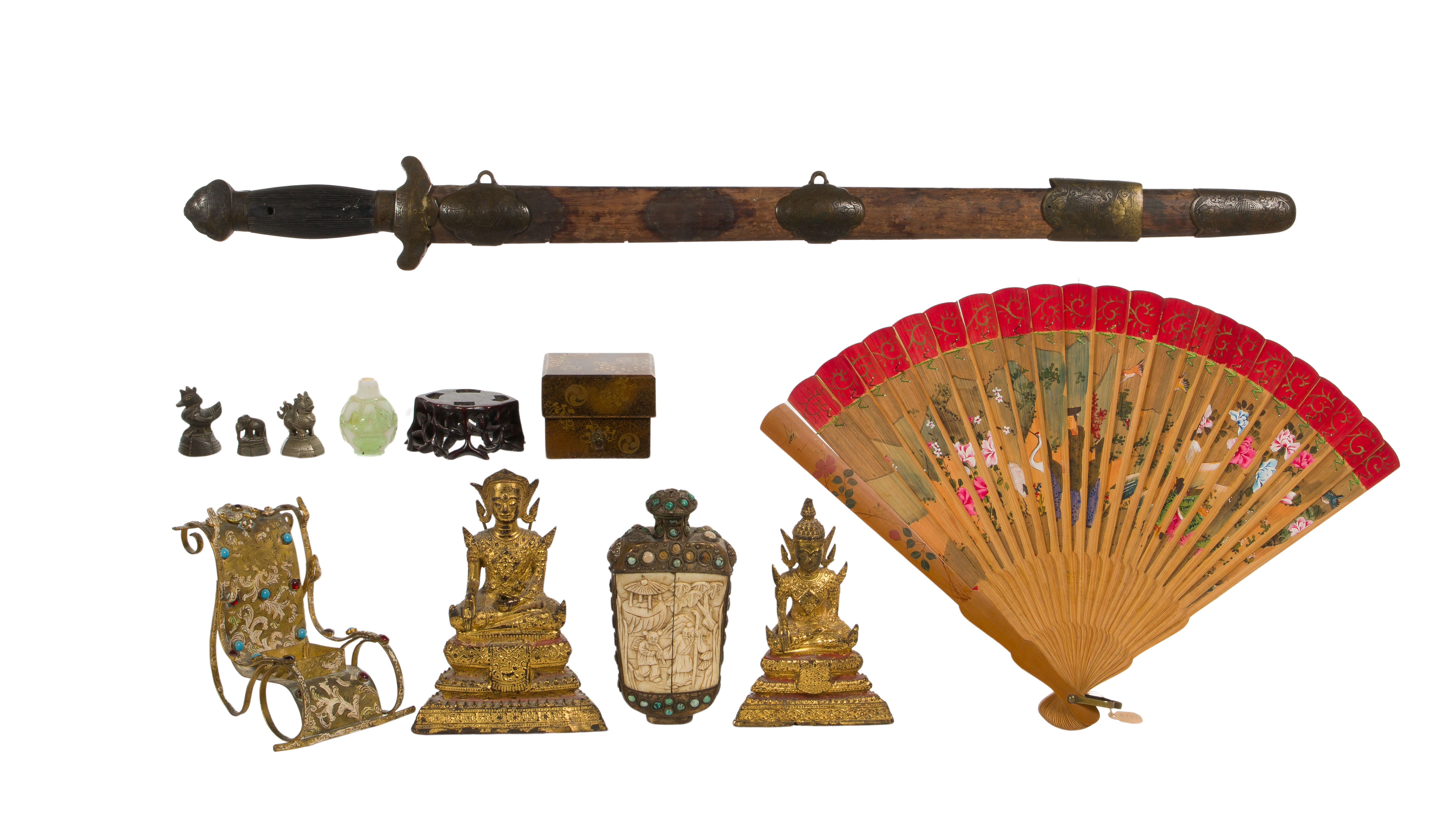 (12) total items including the double-edged straight sword and bronze mounted wood scabbard, a Japanese maki-e lacquer box, a Sino-Tibetan style metal lime container having carved bone panels, multi-color cabochons and spoon / stopper, a carved wood stand (possibly for the lime container), (2) Thai Rattanakosin style gilt bronze Buddha statues, (3) South East Asian bronze animal form opium weights, a painted palm leaf and bamboo folding fan in box and a glass snuff bottle; together with a brass representation of a bentwood armchair having painted and cabochon decoration
