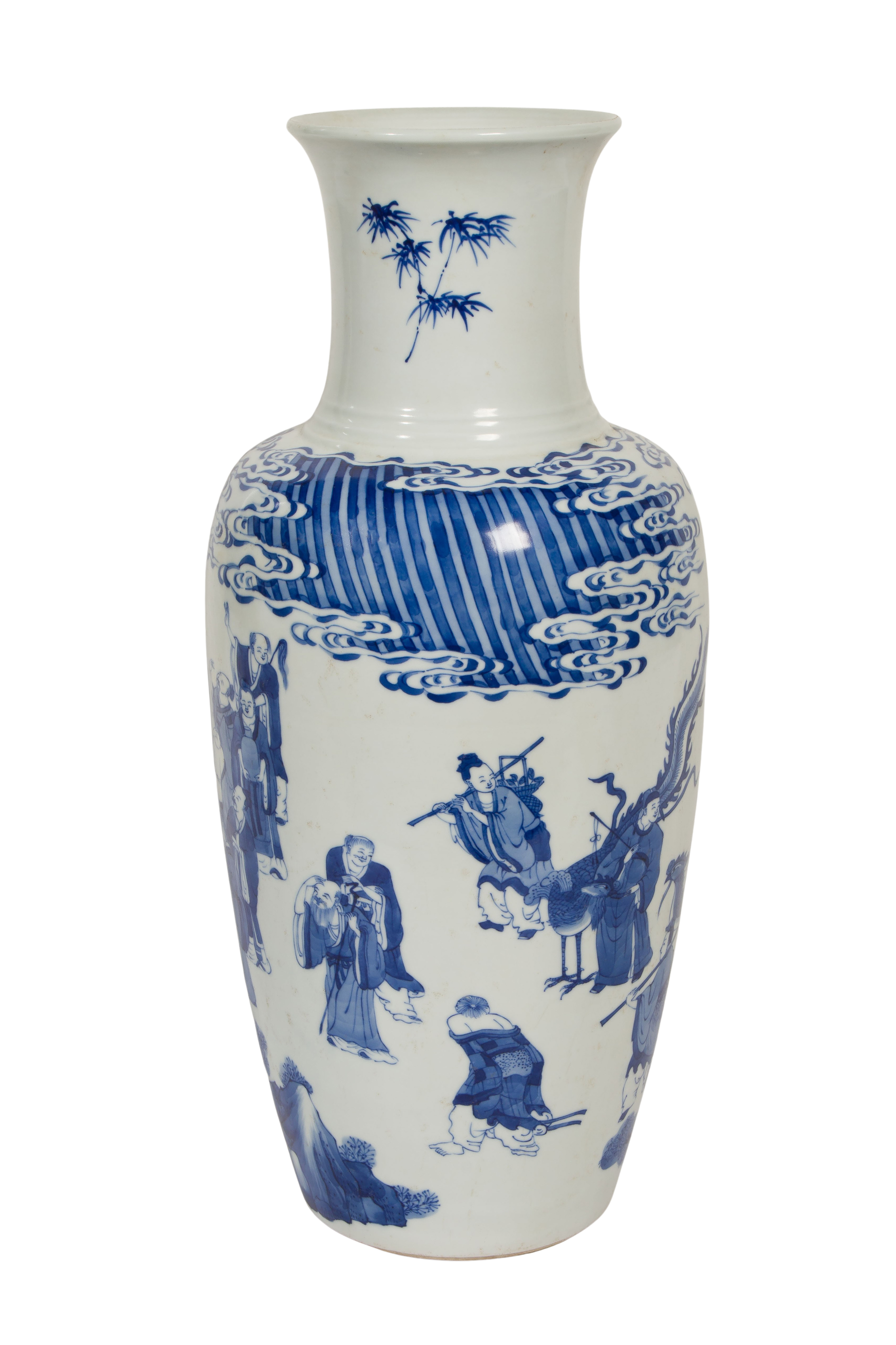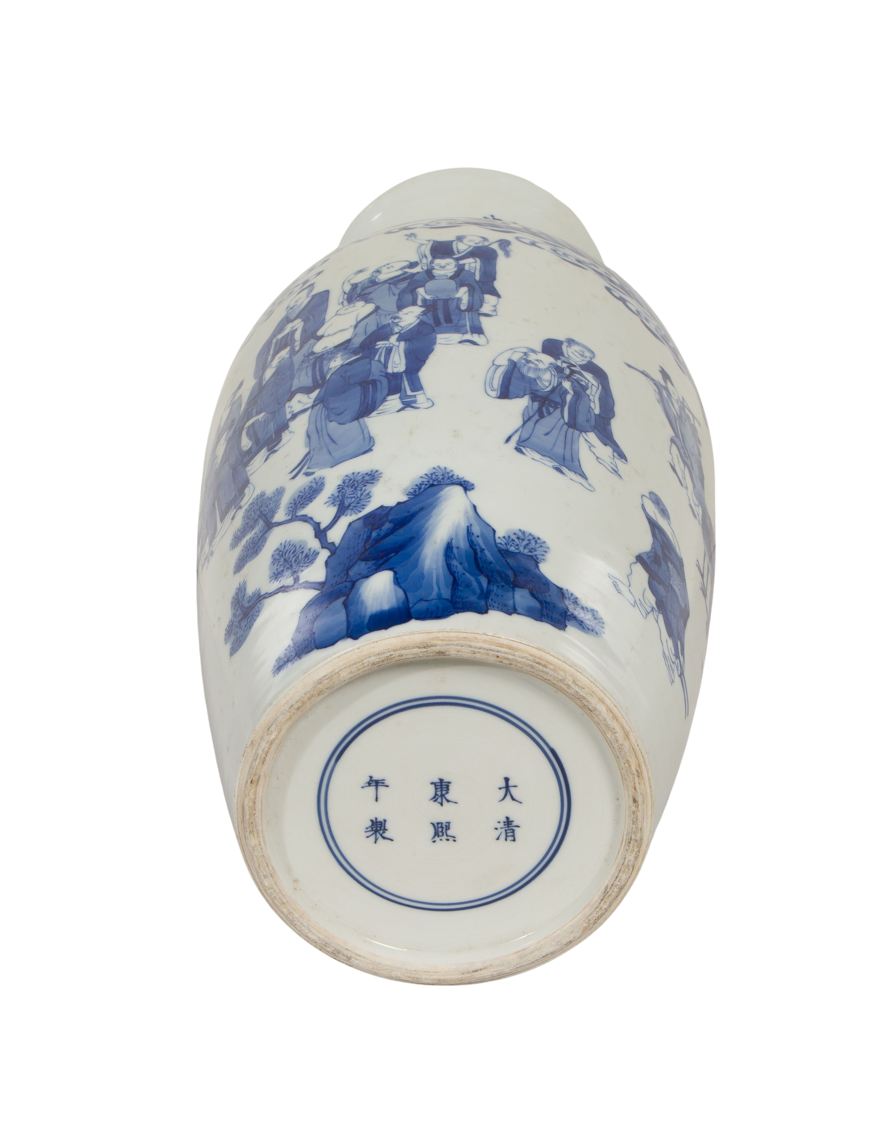 Having an underglaze blue depiction of numerous figures observing an immortal having dragons emanating from his mouth, an underglaze blue 6-character Kangxi mark within concentric circles underside
