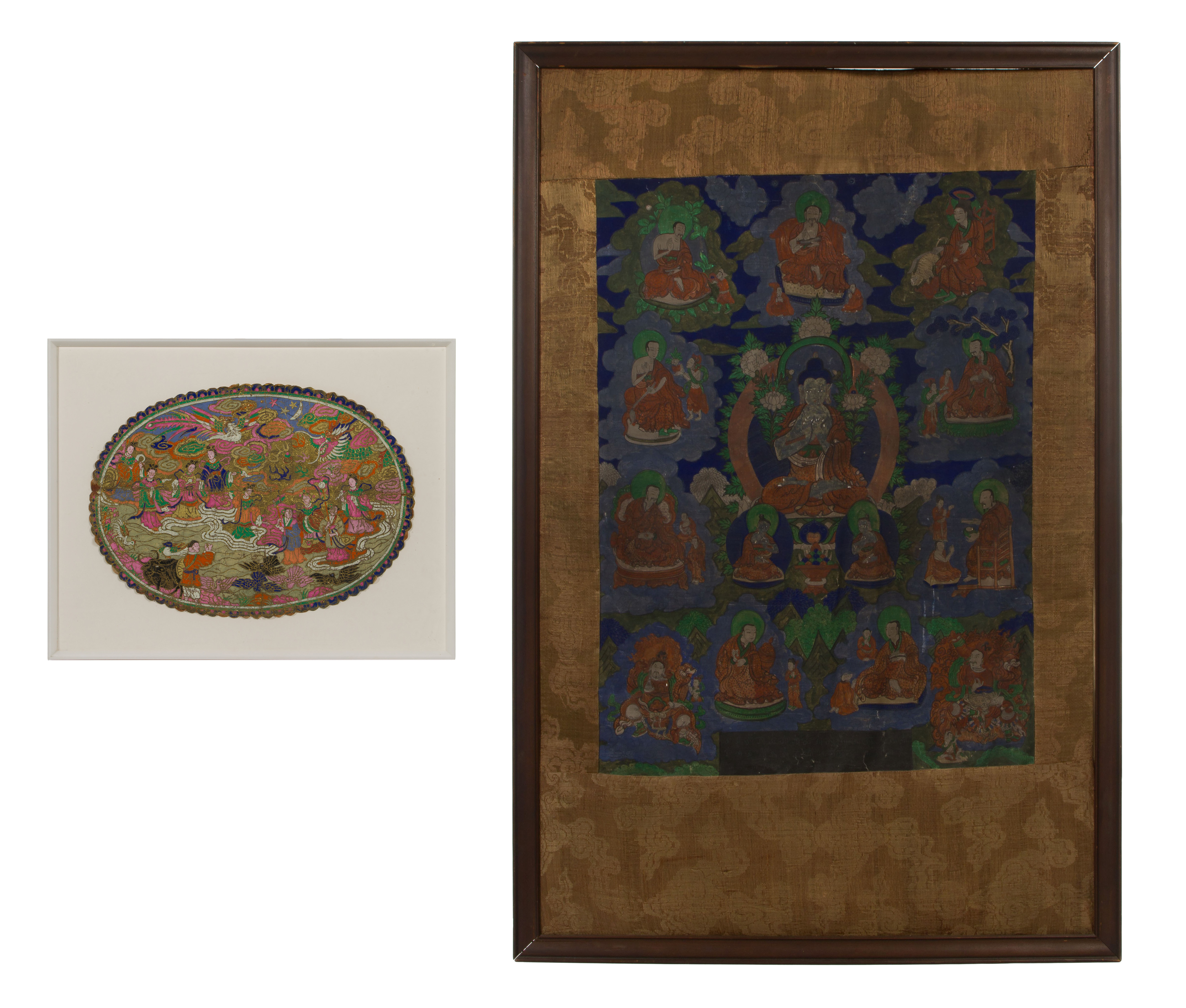 (2) total items including a Tibetan thangka painting on linen depicting deities; together with a painted and gold-tone embellished paper mat, both having frames