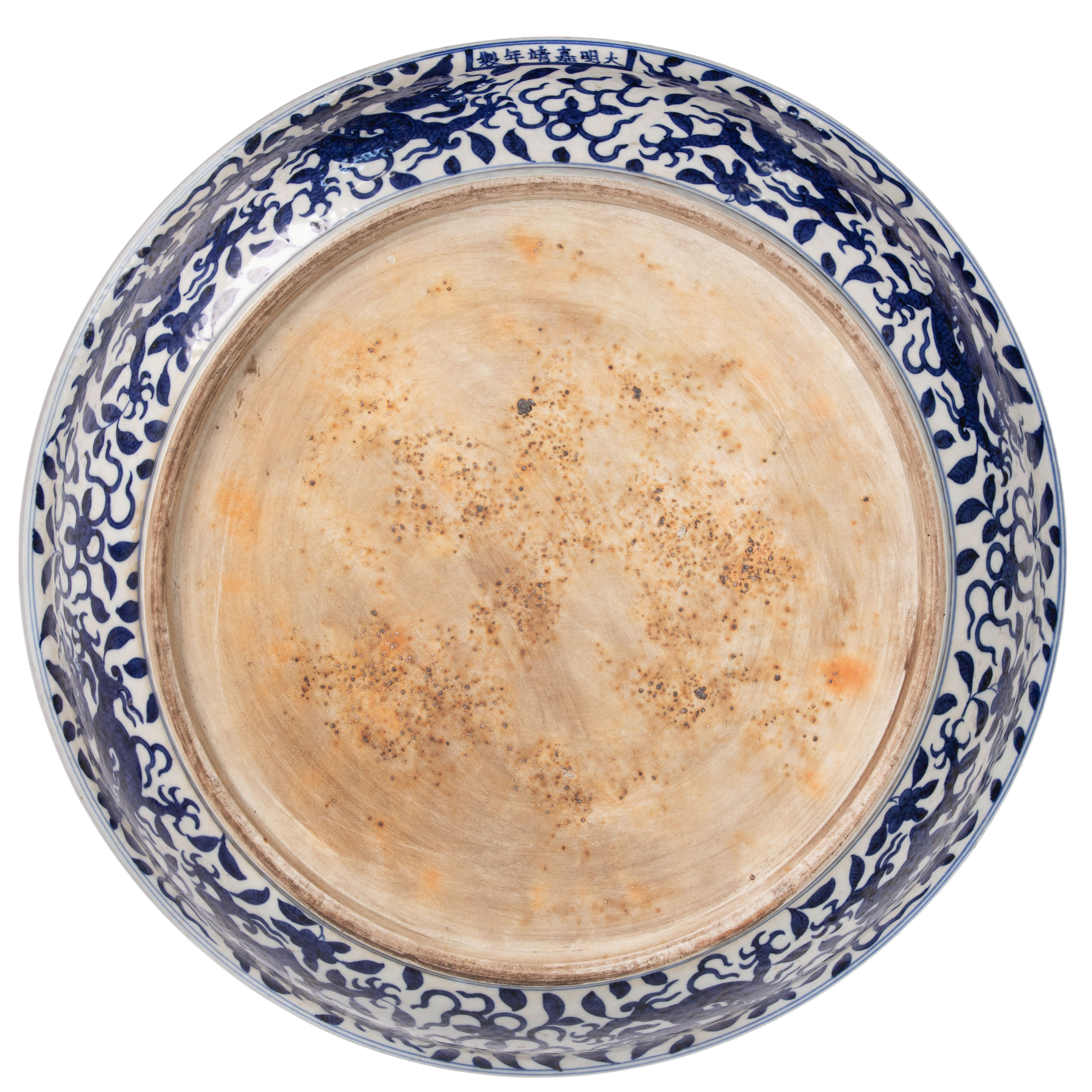 Blue and white dragon charger, the interior and exterior having five-toed dragons, a floral motif and six-character Jiajing mark on the side in underglaze blue, unglazed underside and foot ring