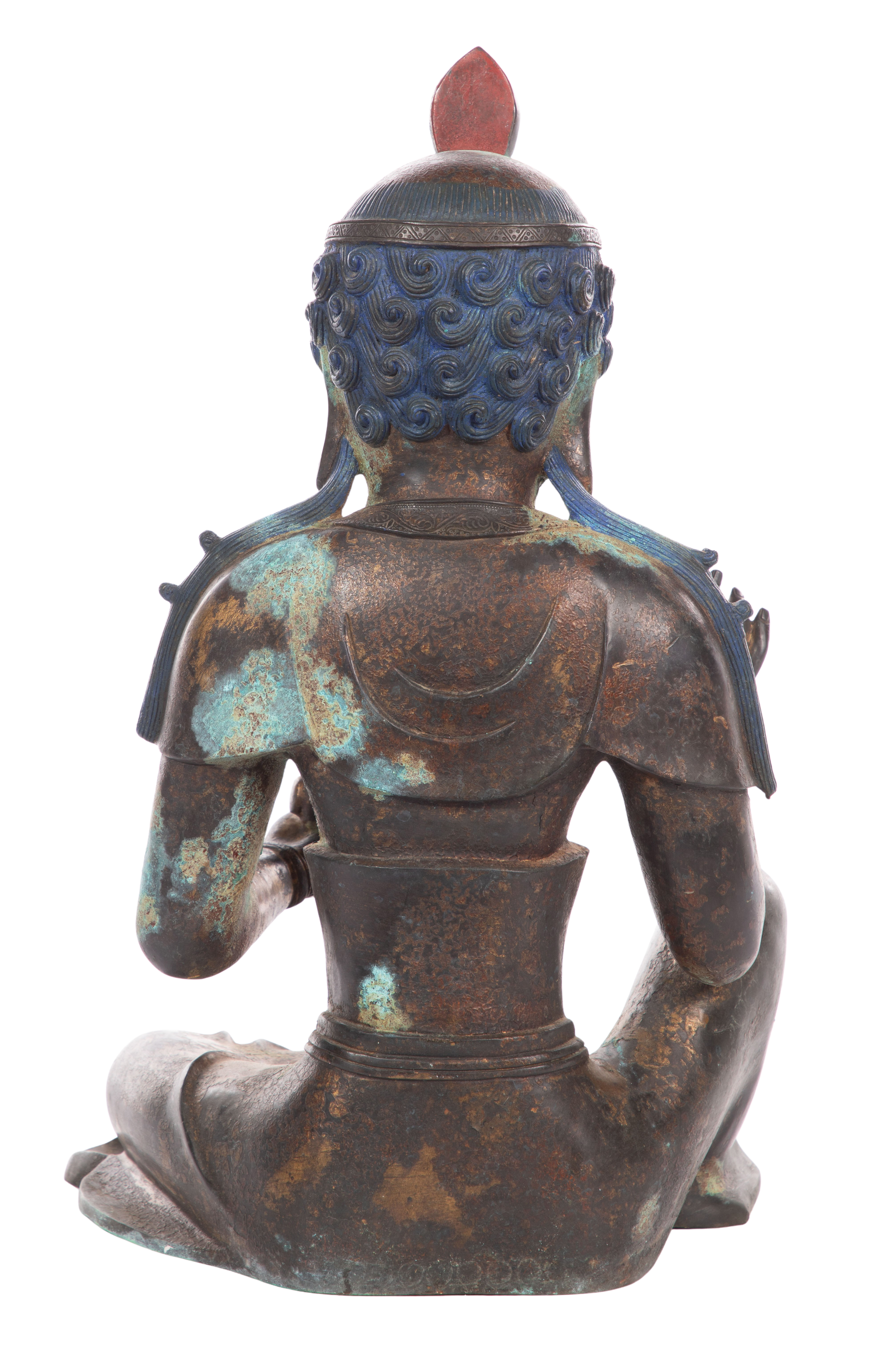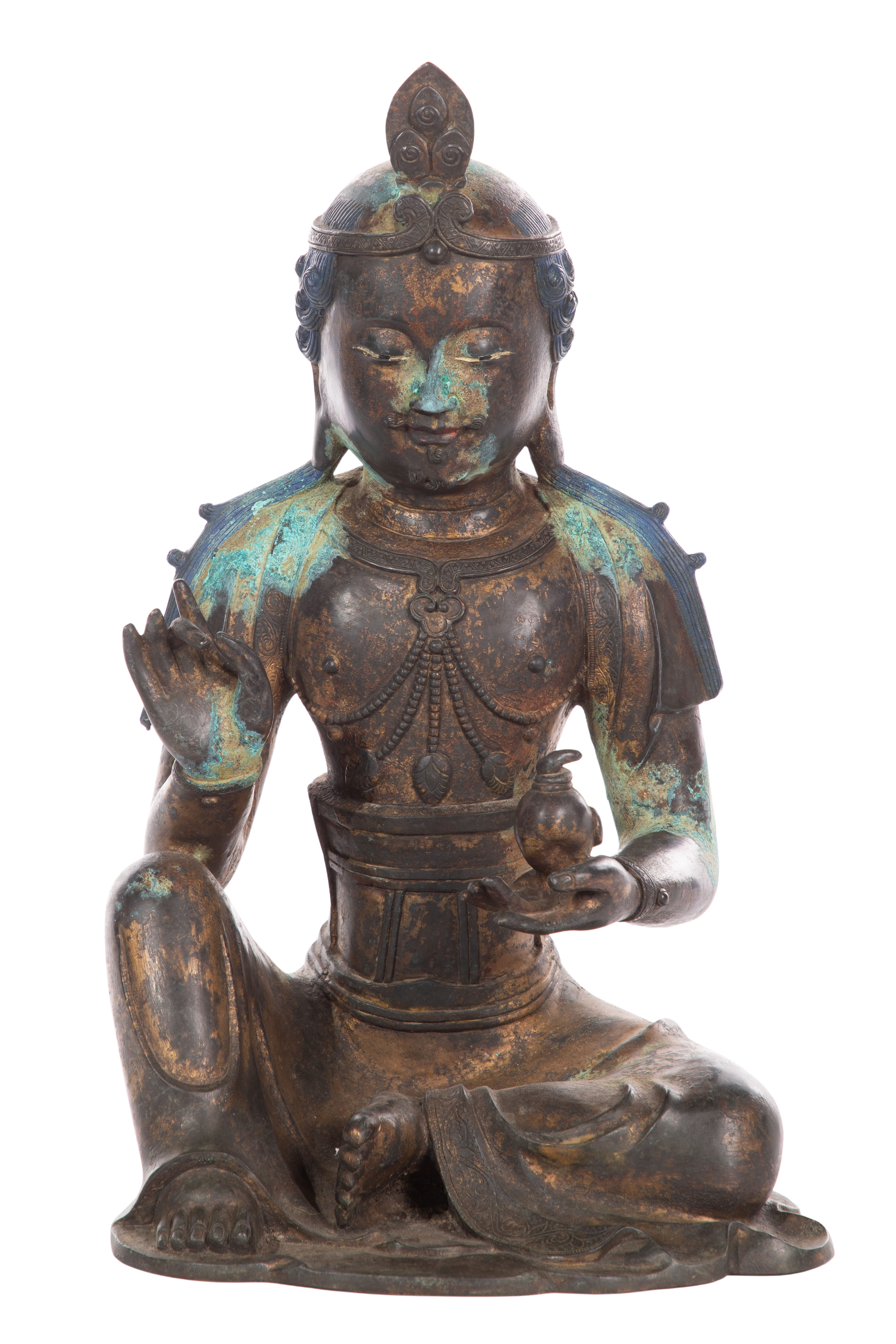 Depicted seated, holding a kundika bottle, retaining paint on eyes, dark patination to hair and traces of gilding throughout, having a stamped crossed vajra mark to sheet underside