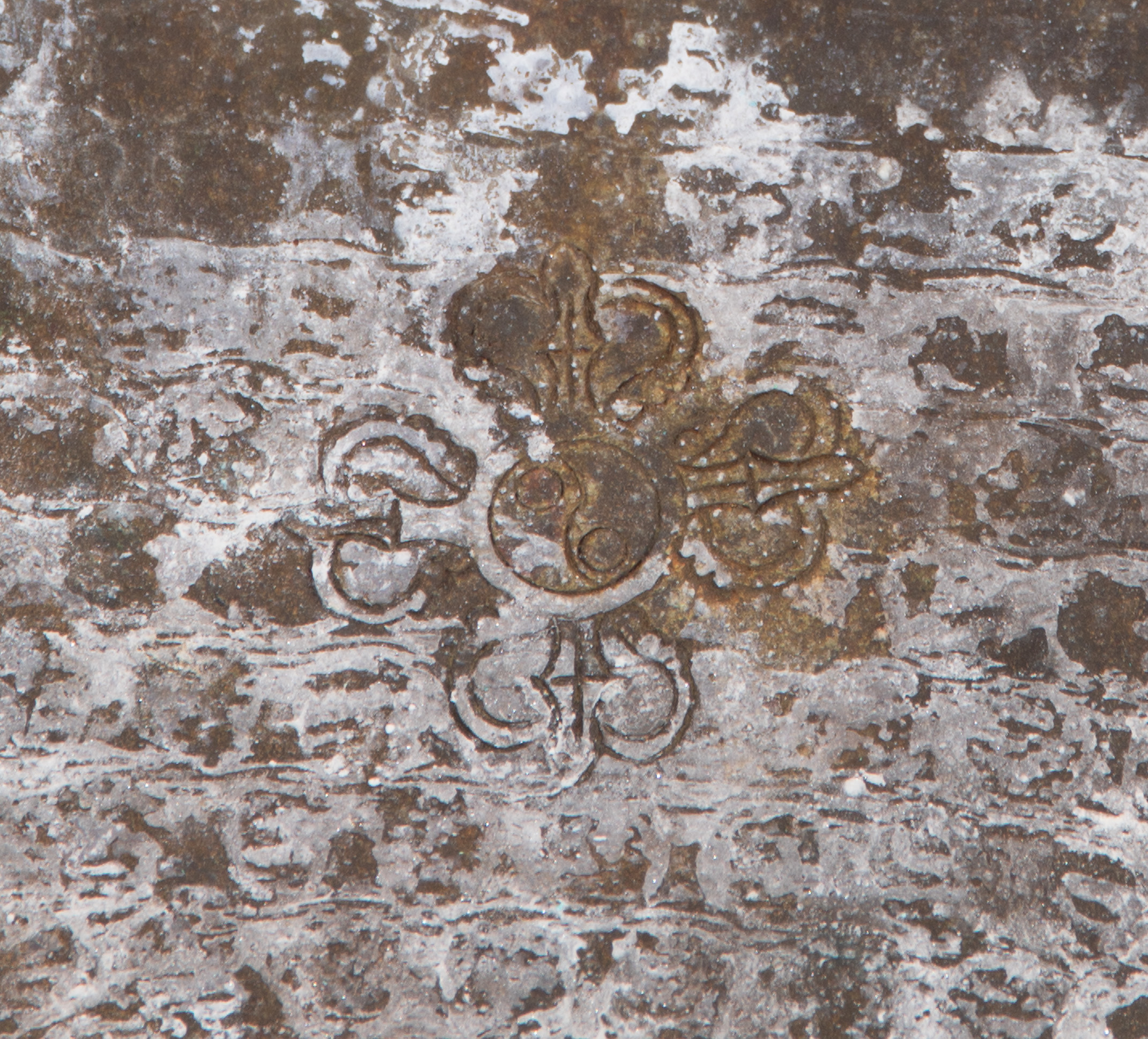 Condition: overall light to moderate wear consistent with normal use, gilt mostly lost, oxidation, verdigris on top of head, face, shoulders, back, elbow and underside causing occasional light pitting