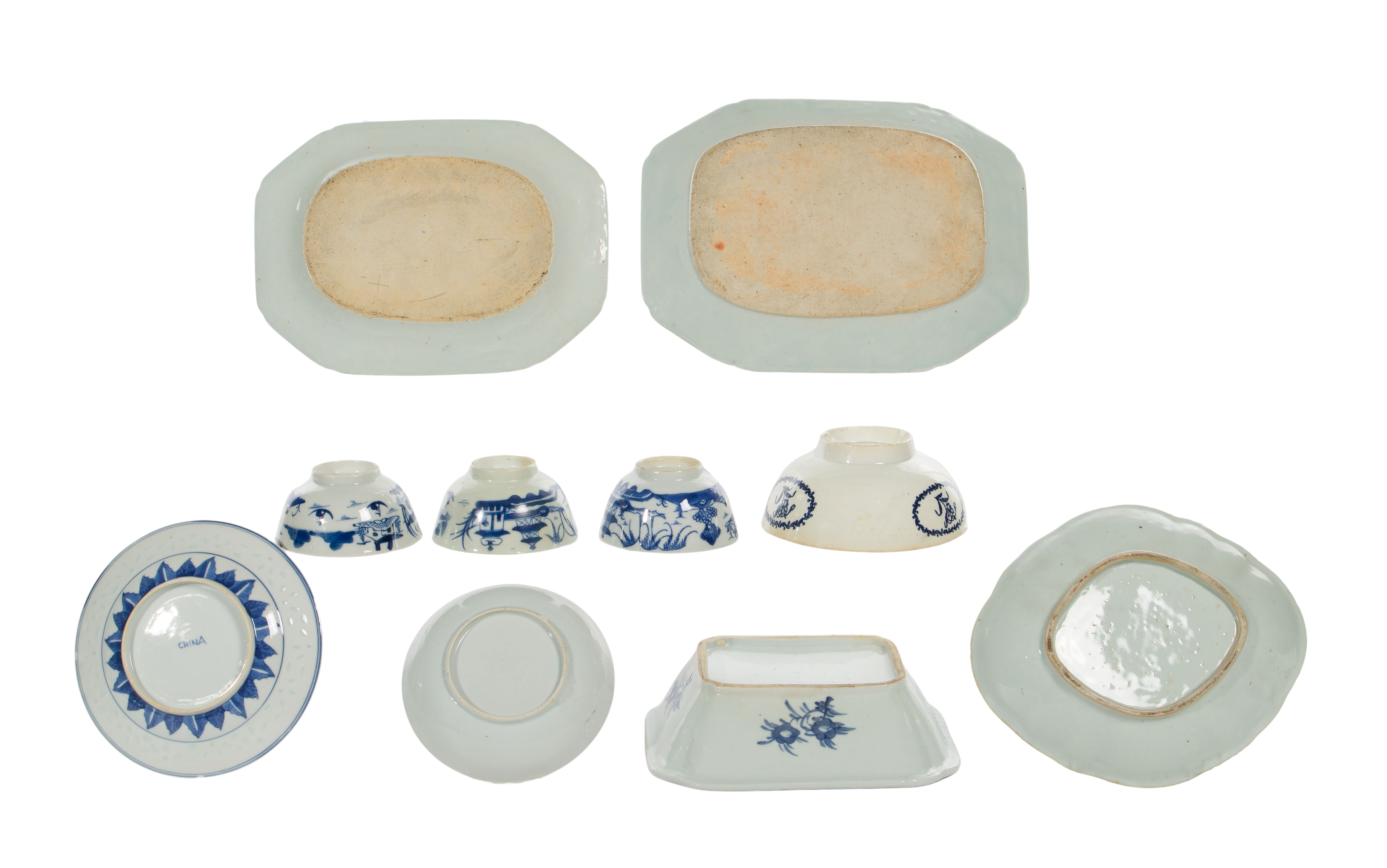 (10) total items having underglaze blue decoration including a covered serving bowl, (3) oblong platters, a shallow bowl and (3) rice bowls, all unmarked and having hand painted decoration; together with a Canton ware style plate having color enamels and transfer blue decoration marked ‘China’ underside and a transfer decorated bowl having floral decoration