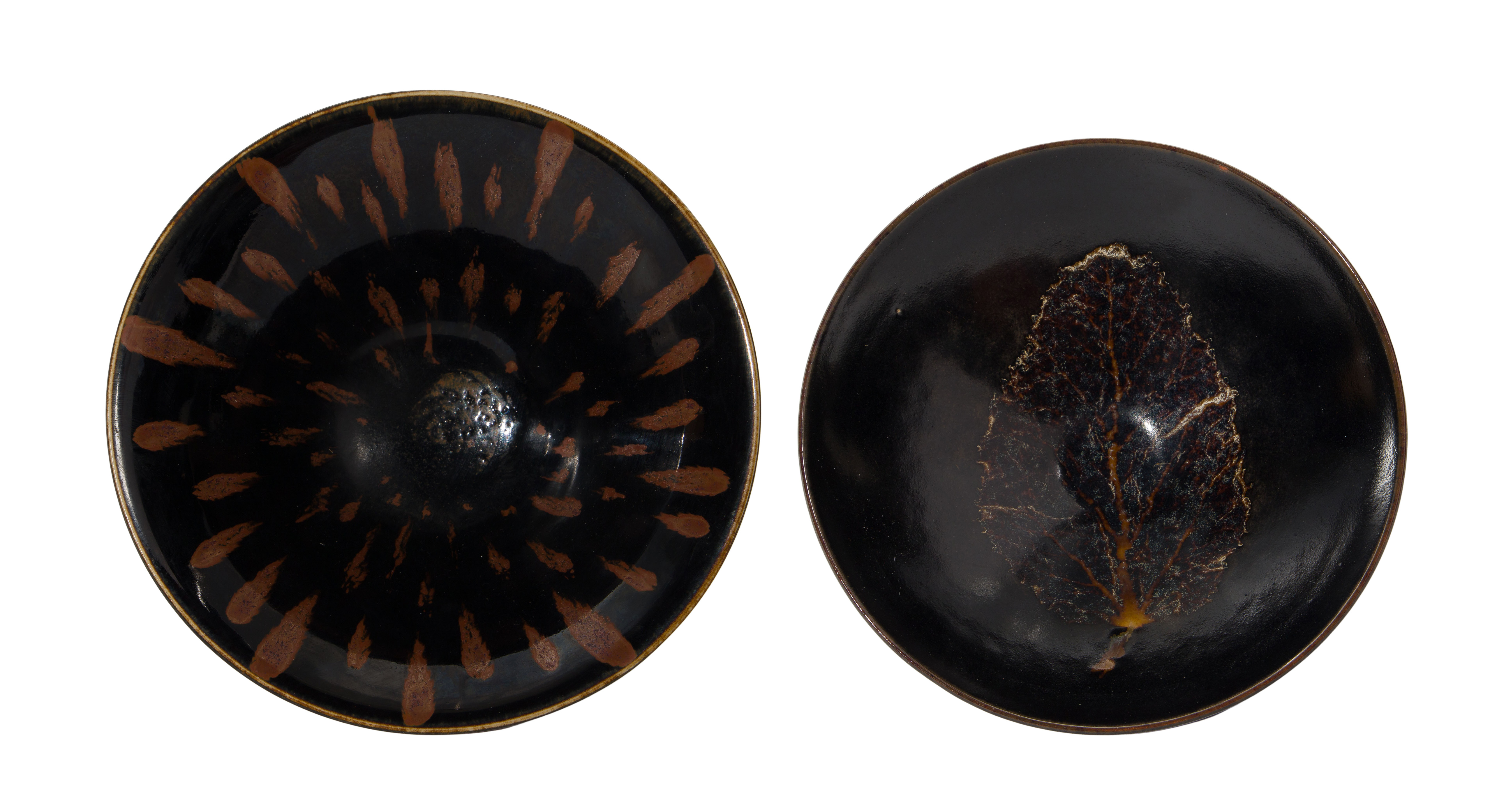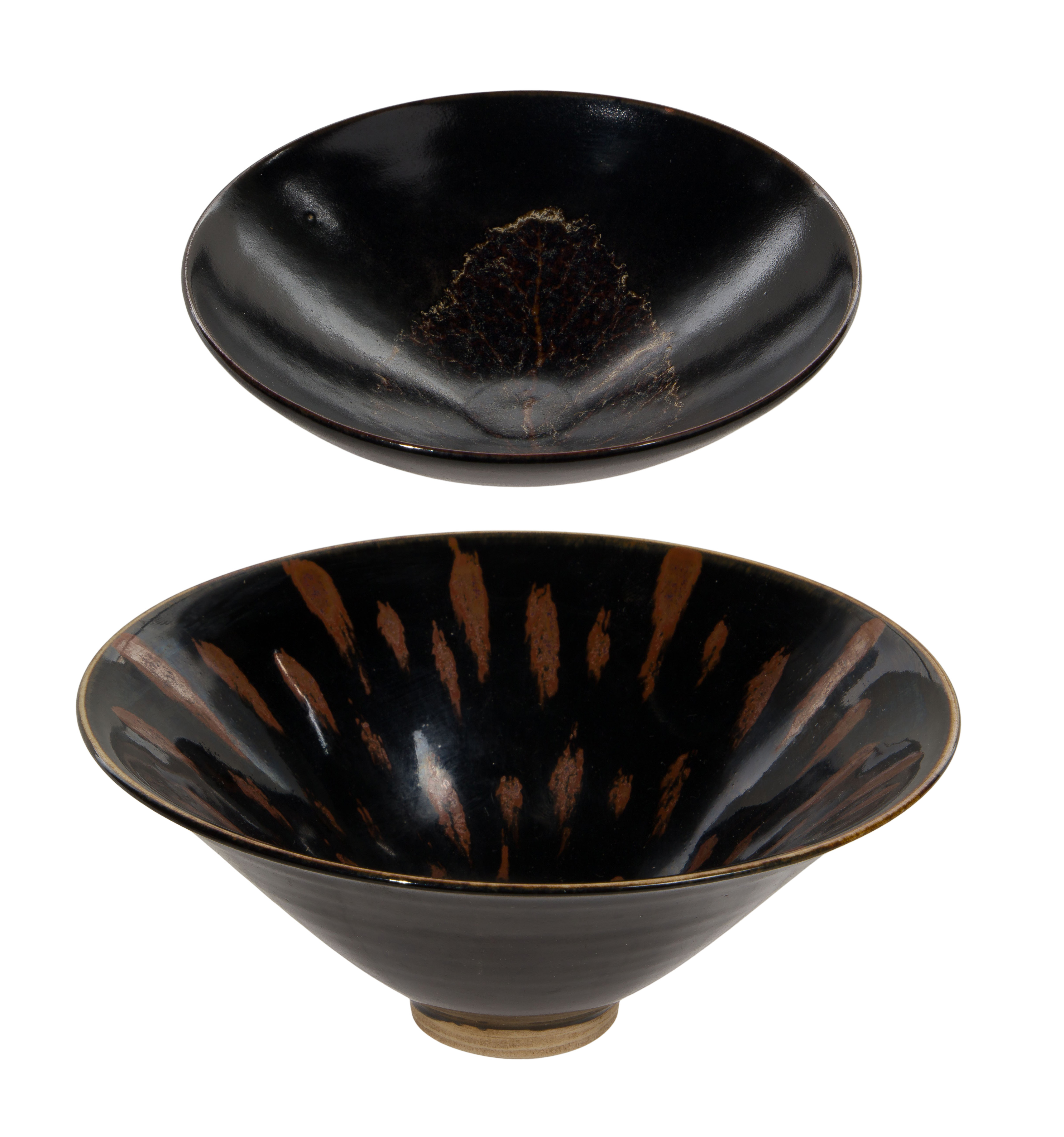 (2) items including a falling leaf tea bowl and a spotted bowl, both having black glaze, unmarked