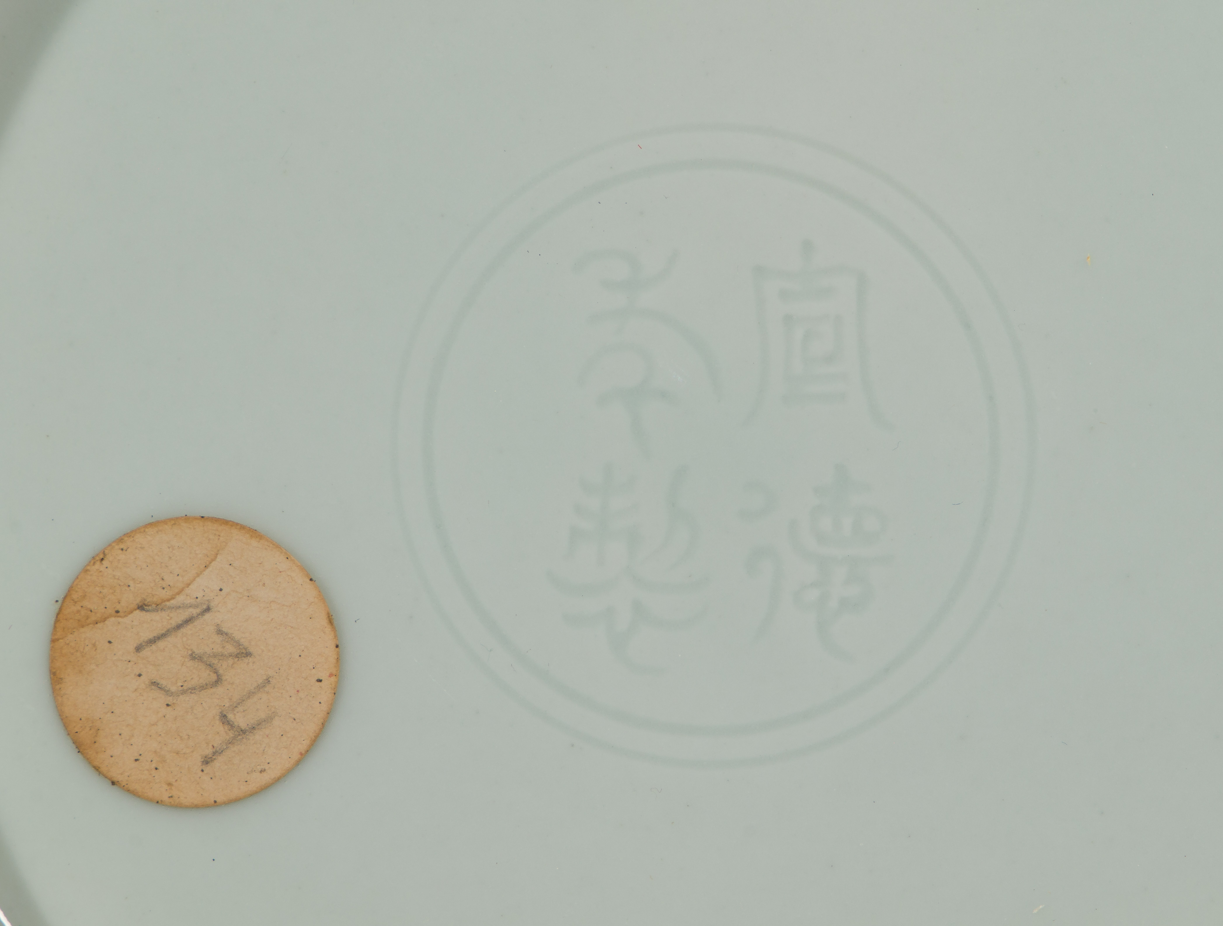 (2) items including an unmarked vase and a footed bowl having an impressed four-character mark within concentric circles and numeric collection label on glazed underside