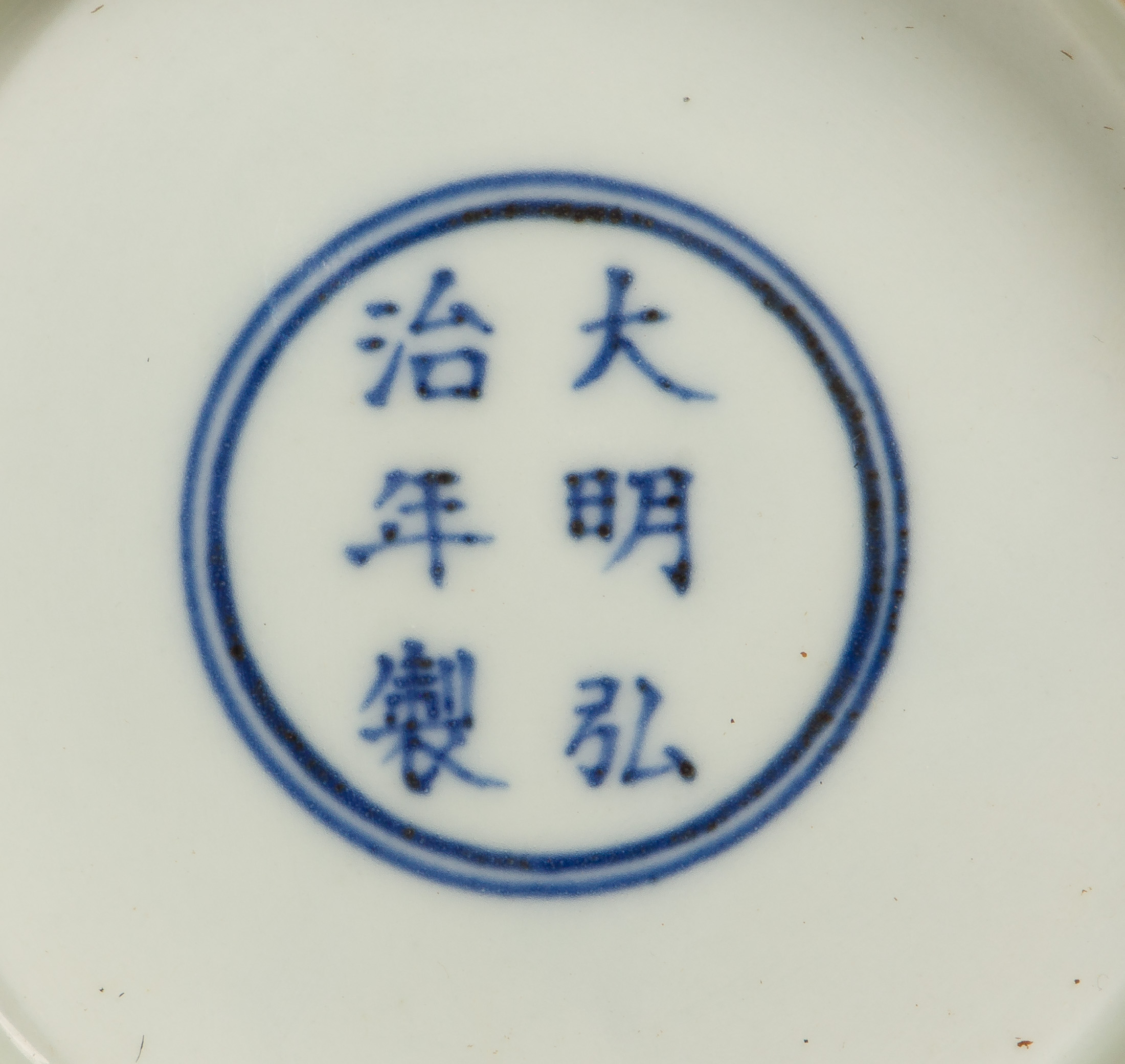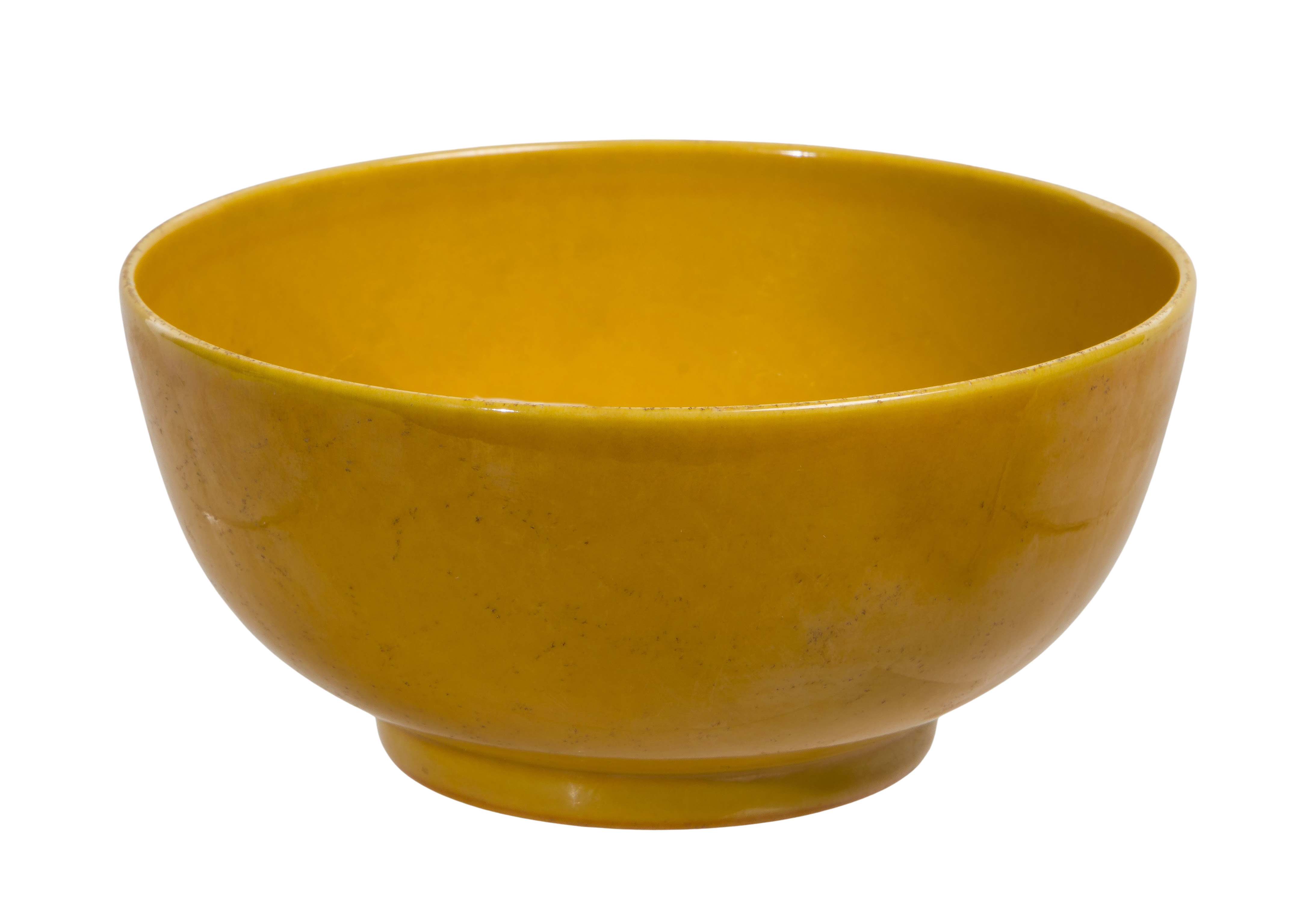 A bowl having an egg yolk colored glaze with a blue underglaze six-character mark within concentric circles on a white base translates to ‘Made during the Hongzhi reign of the great Ming Dynasty’