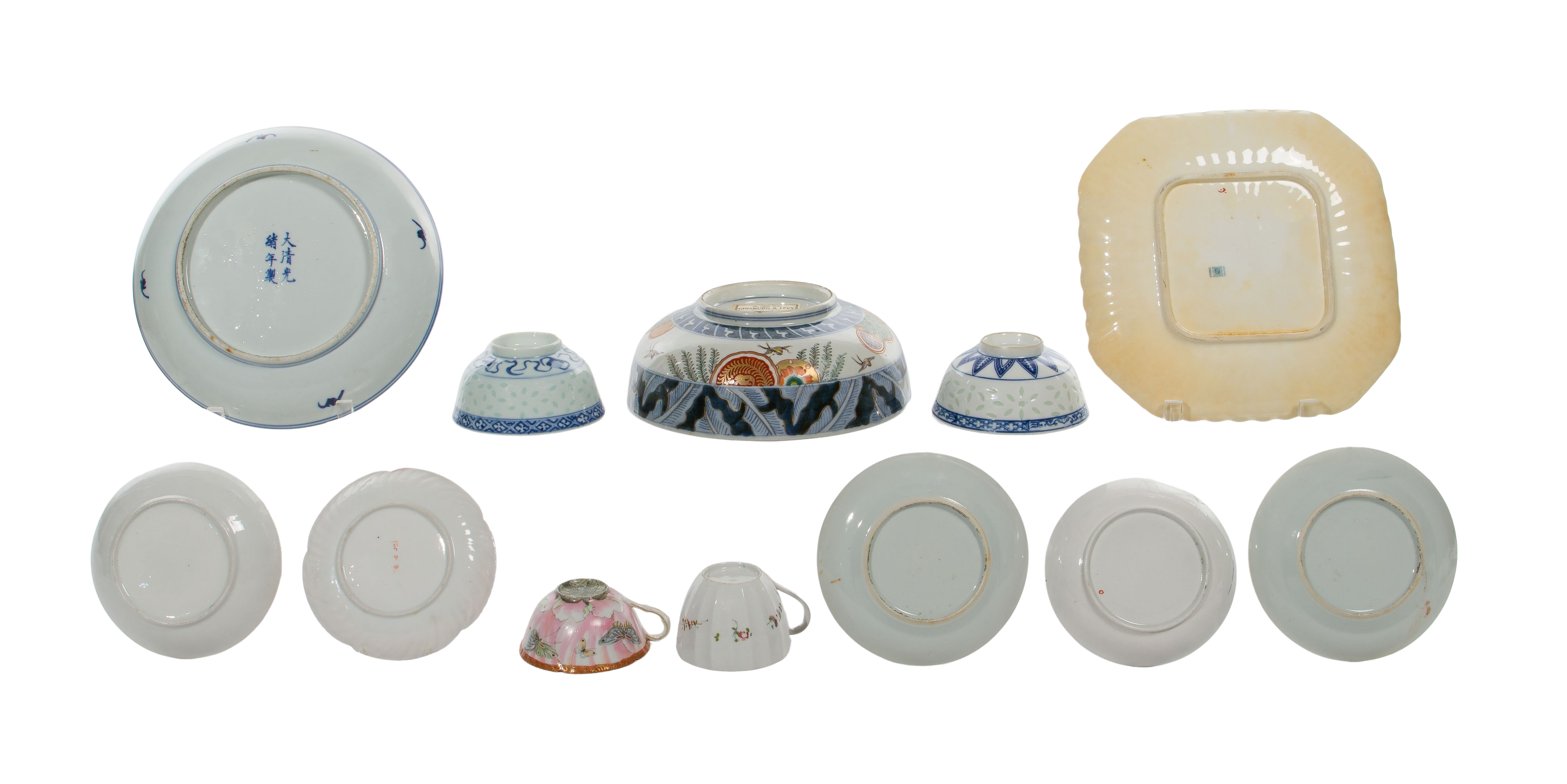 (12) total items including a Kutani cup with saucer, (2) export saucers, an export cup, (2) plates having dragon motif, (2) footed blue and white bowls having stamped character mark to the underside, an Imari footed bowl and a plate having character marks on the underside; together with a Copeland Spode plate
