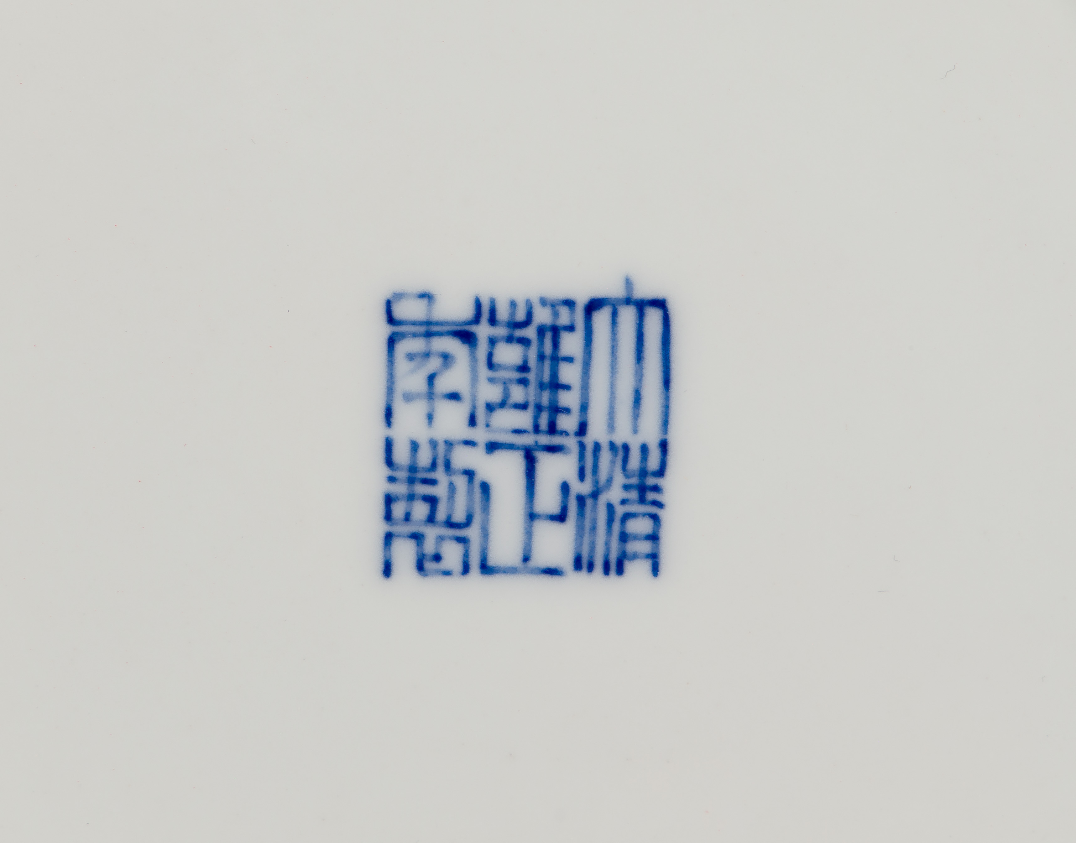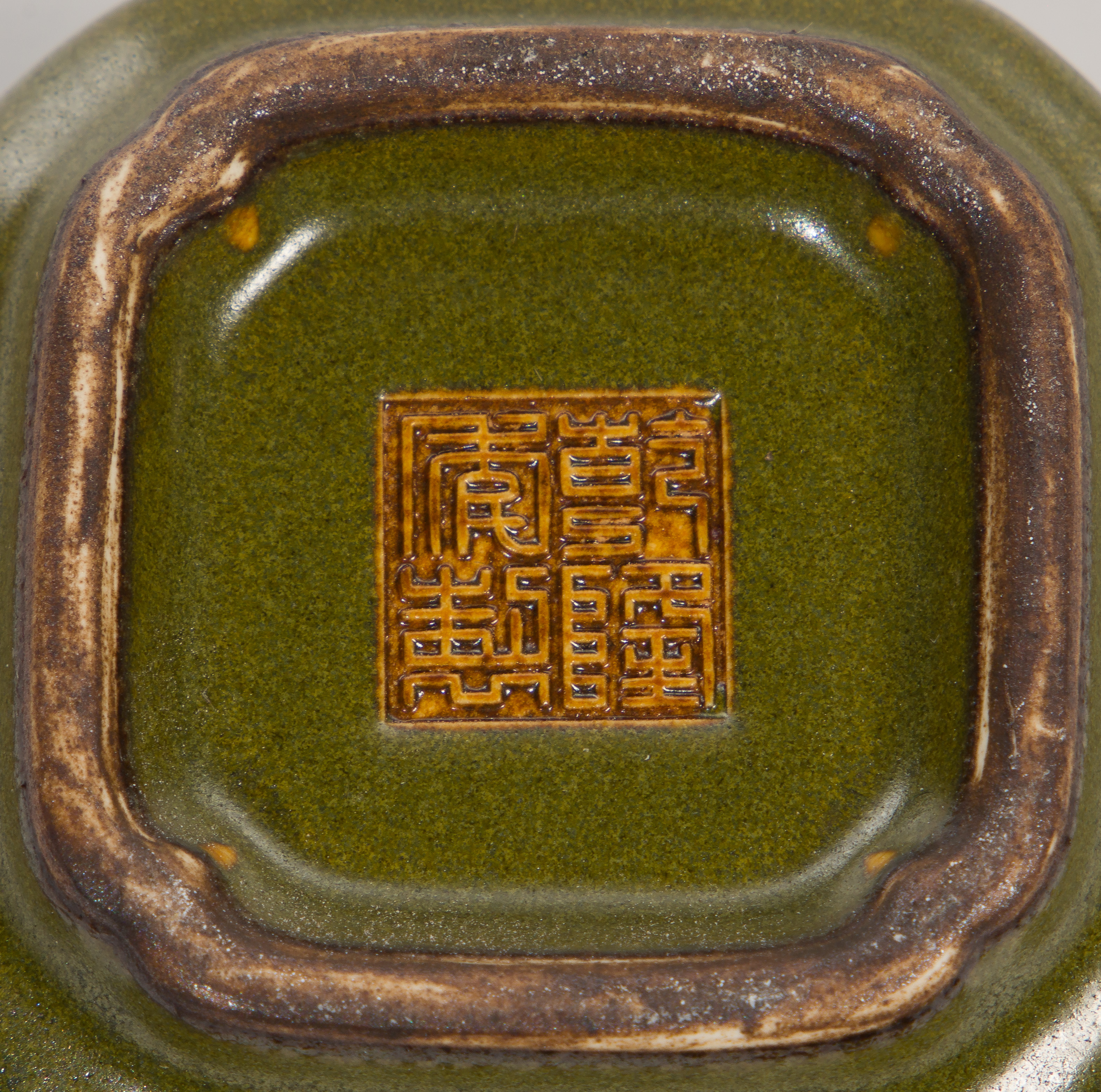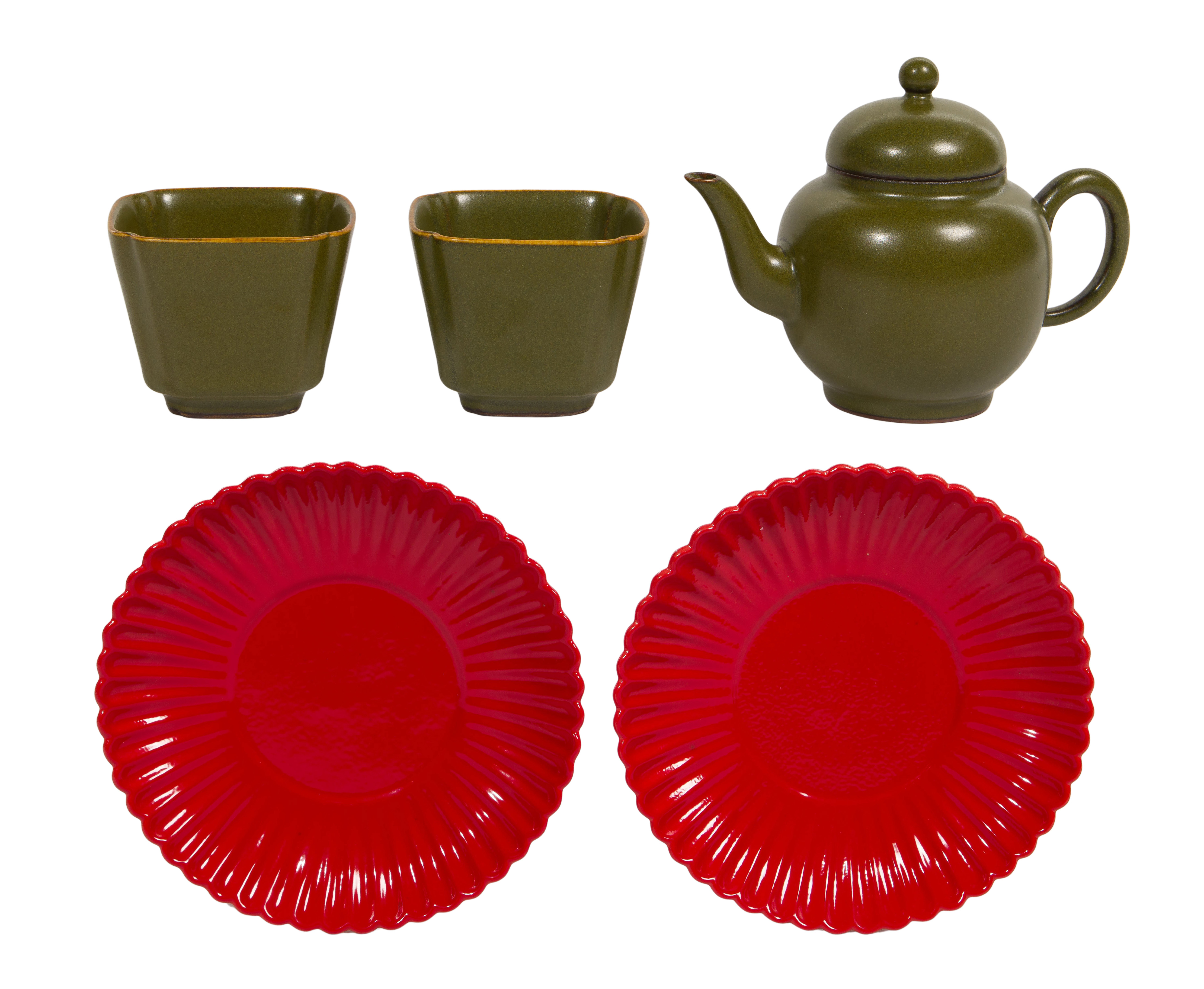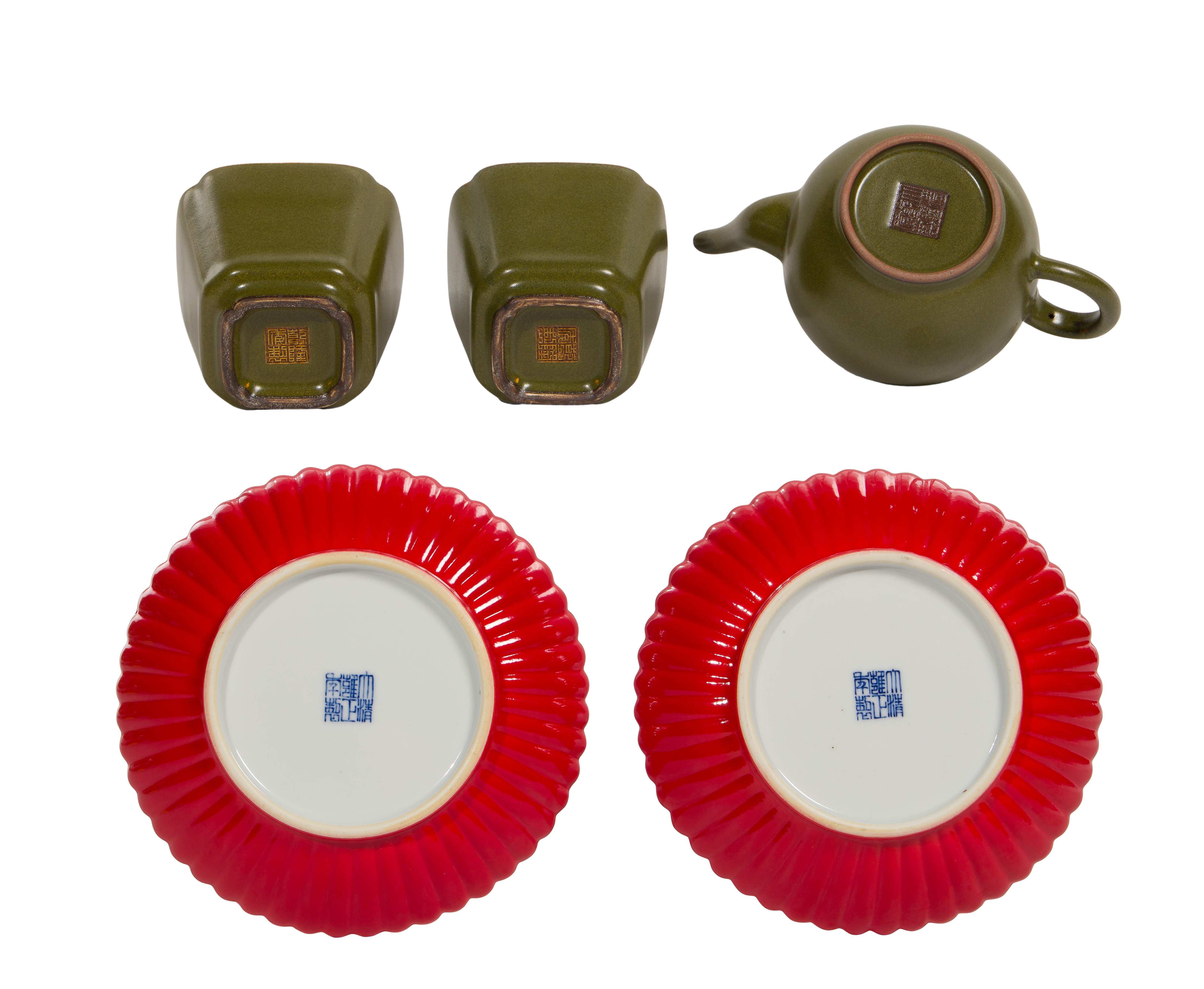 (5) items including a pair of red chrysanthemum plates having underglaze blue six-character Yongzheng marks and a pair of teadust glazed cups and a teapot having impressed Qianlong marks