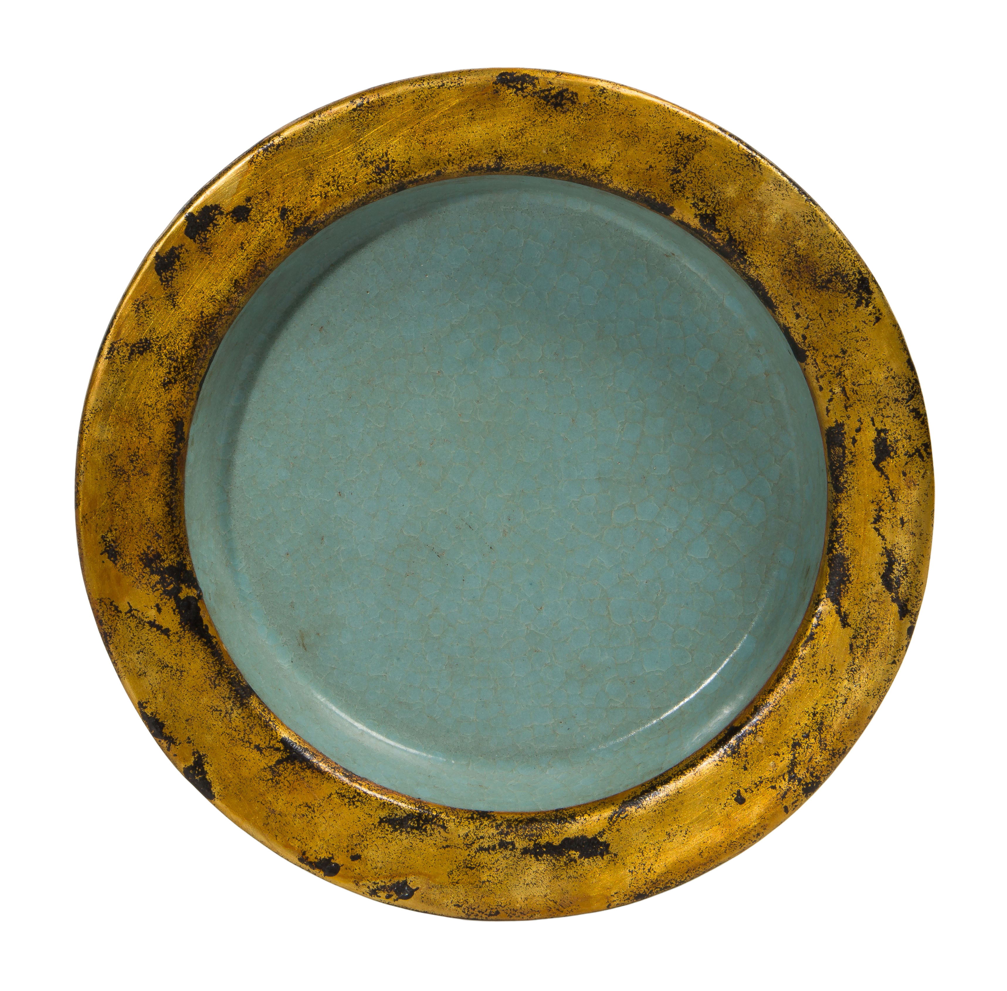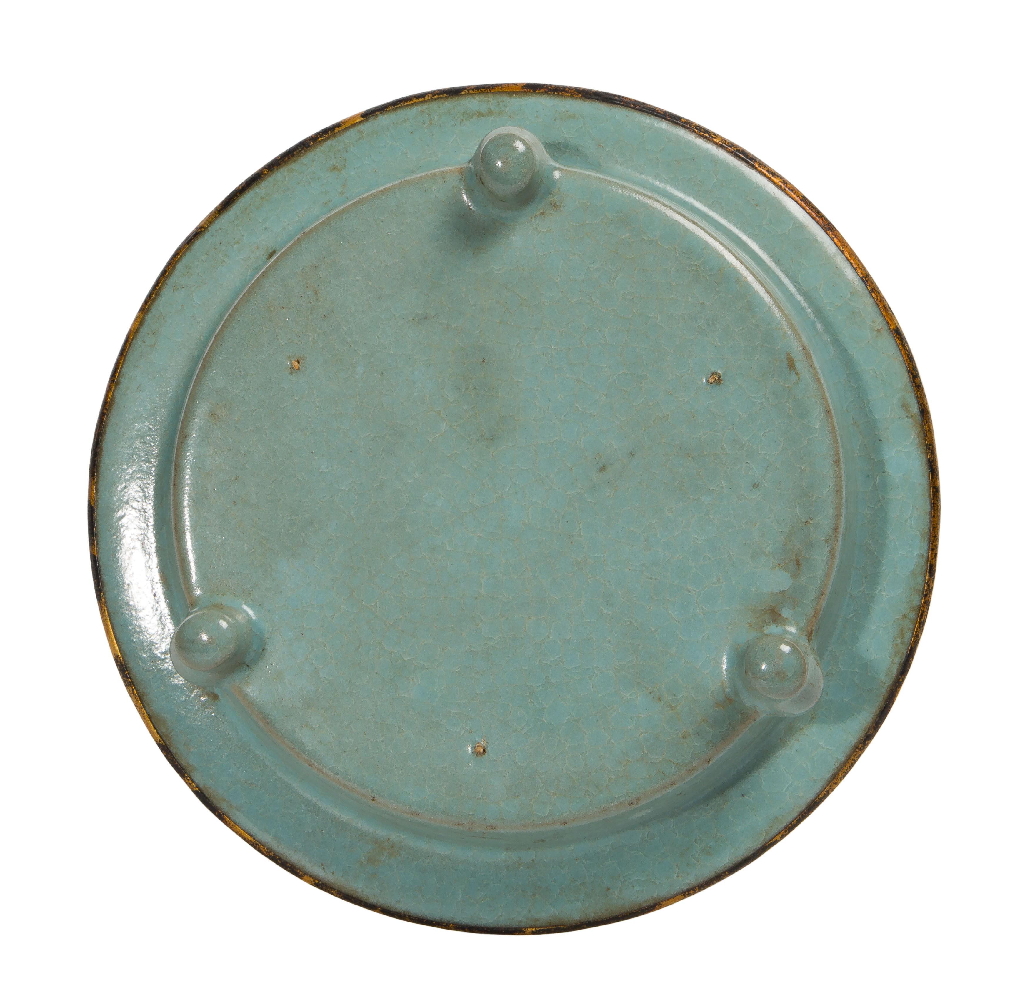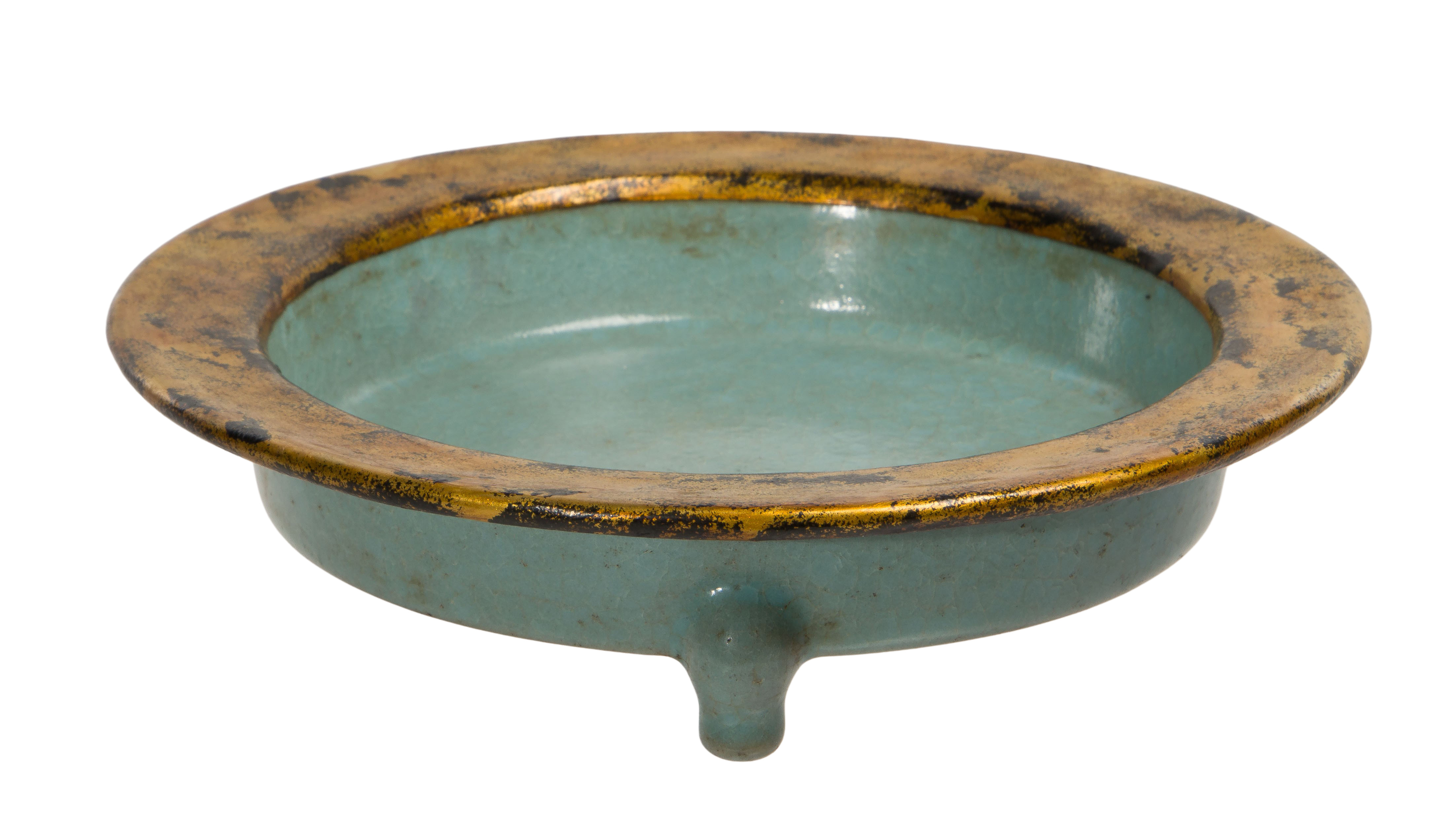 A tripod brush washer having a gilt flat rim and a soft crackle glaze, unmarked