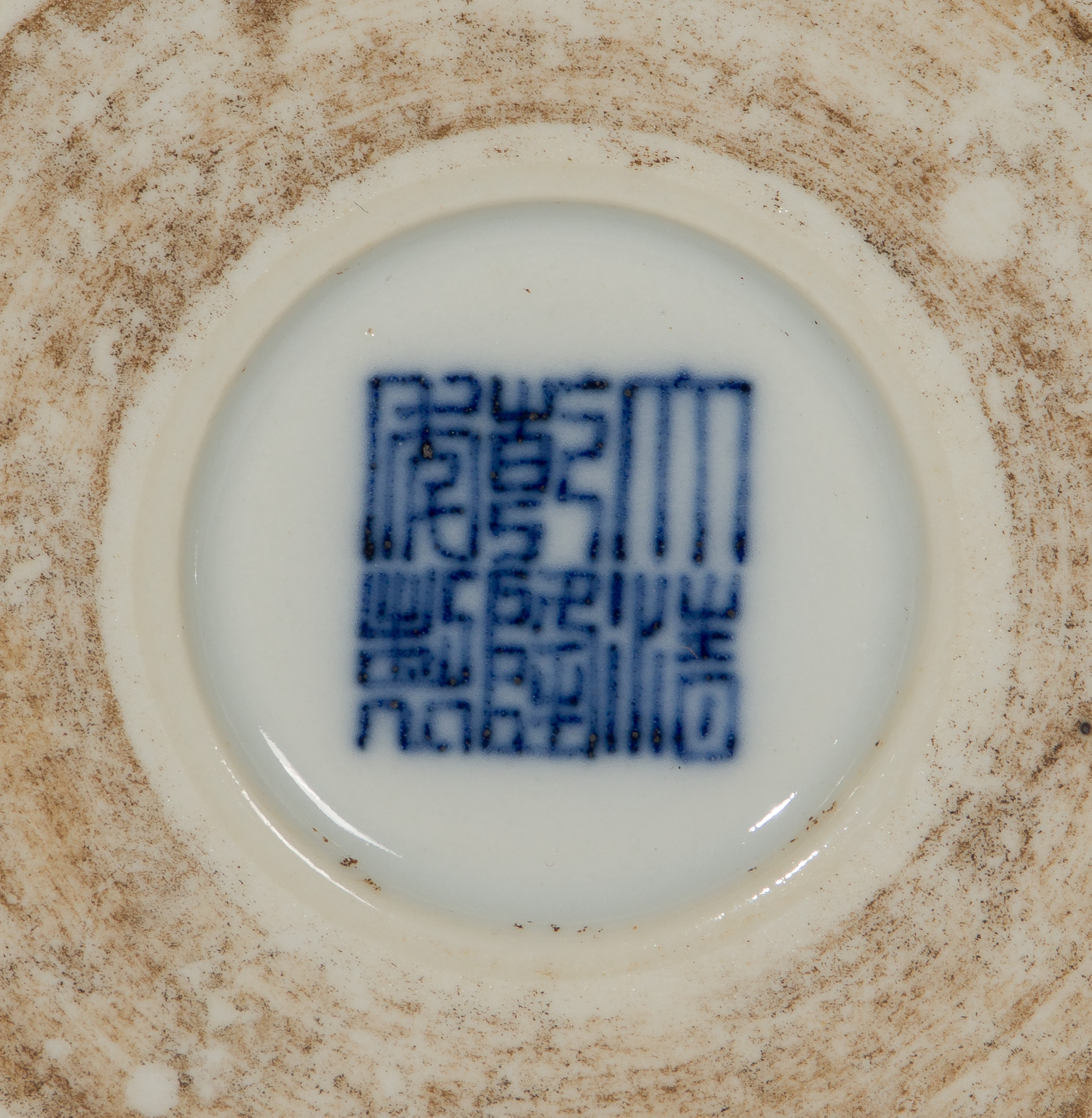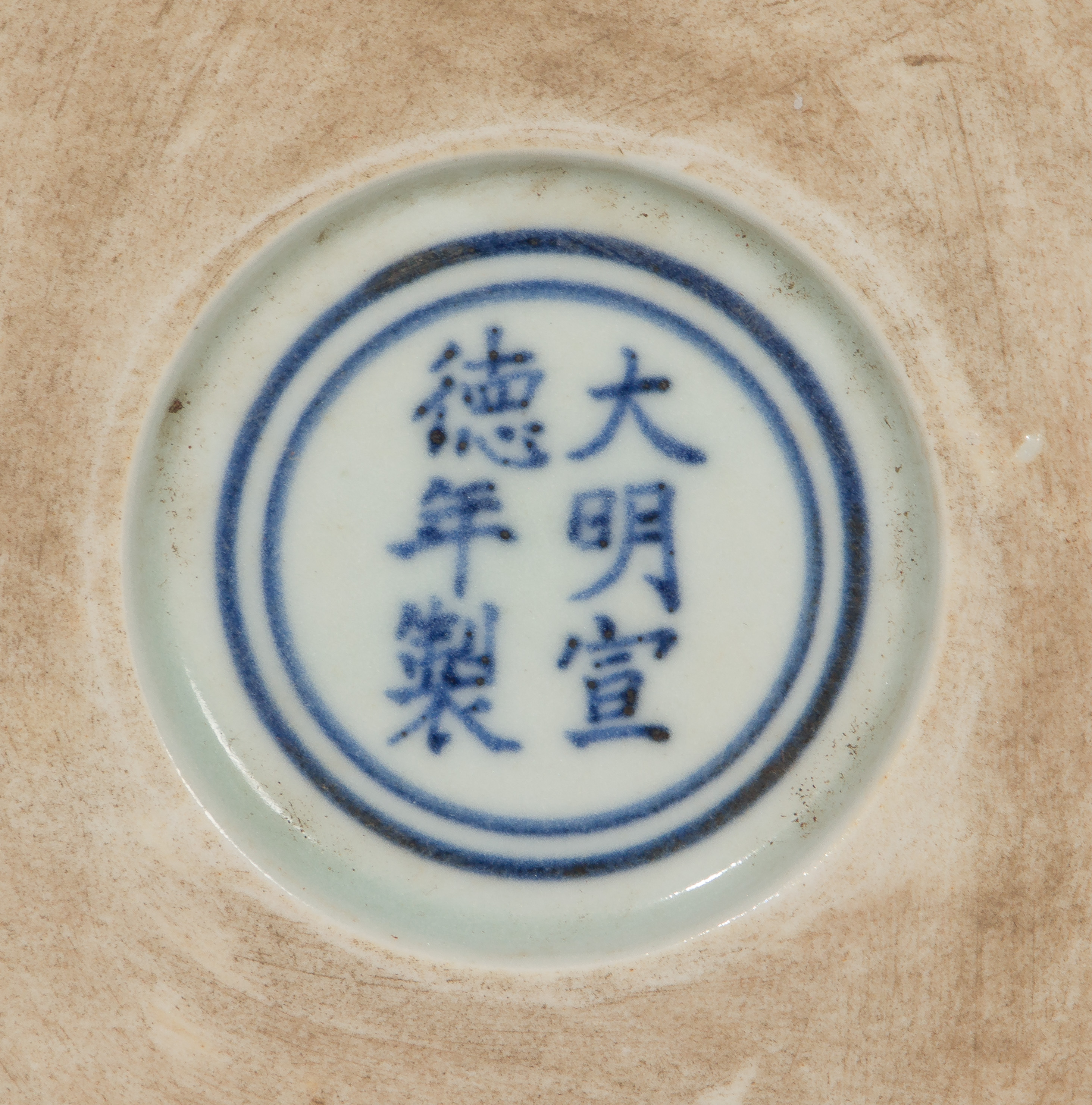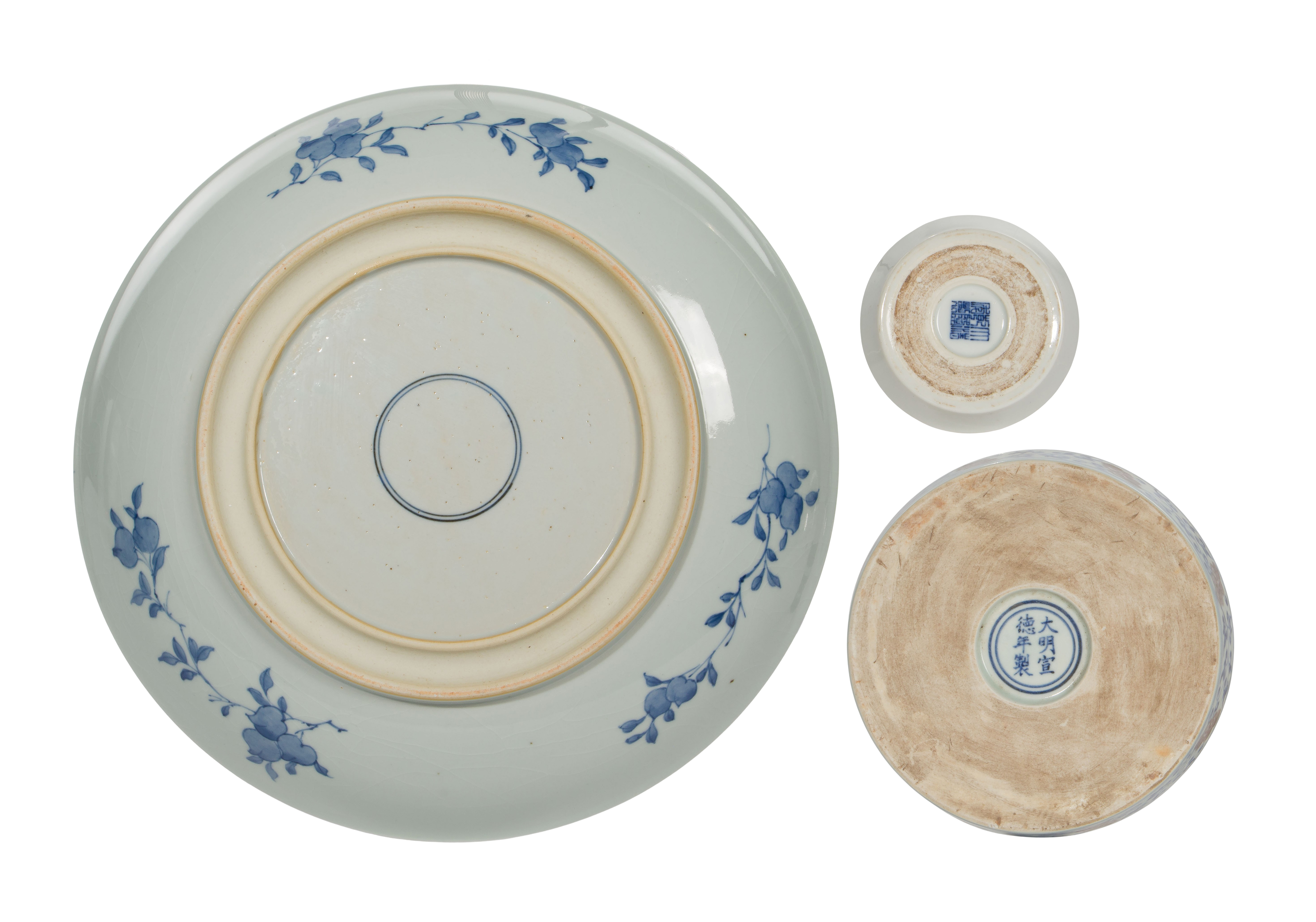 (3) items including a blue and white charger having a landscape scene, blue concentric circles underside, a trinket dish having a fish on the interior, an underglaze blue archaic style Qianlong mark underside and a blue and white dish having iron red pomegranates to the interior, an underglaze blue six-character mark within concentric circles underside