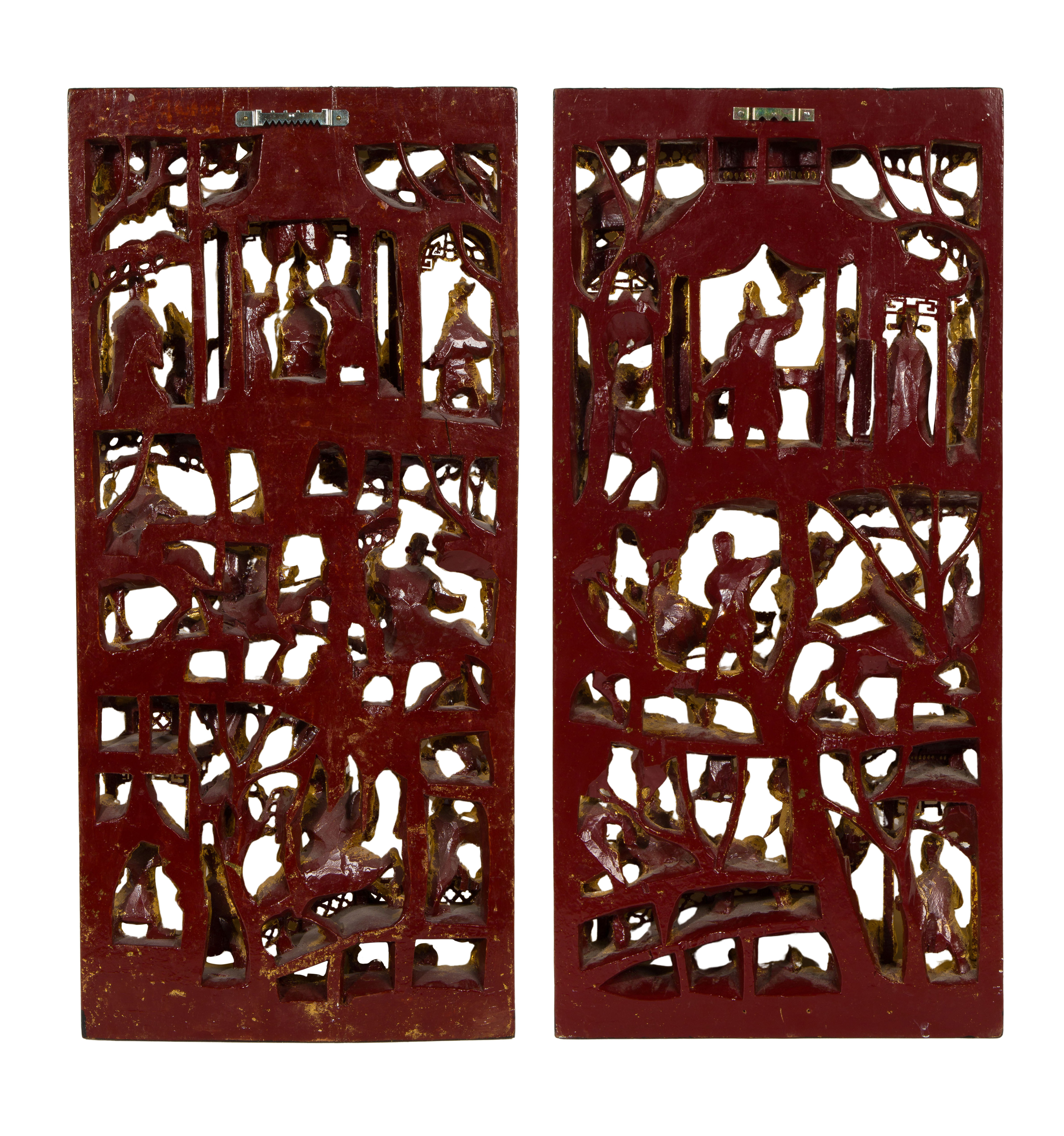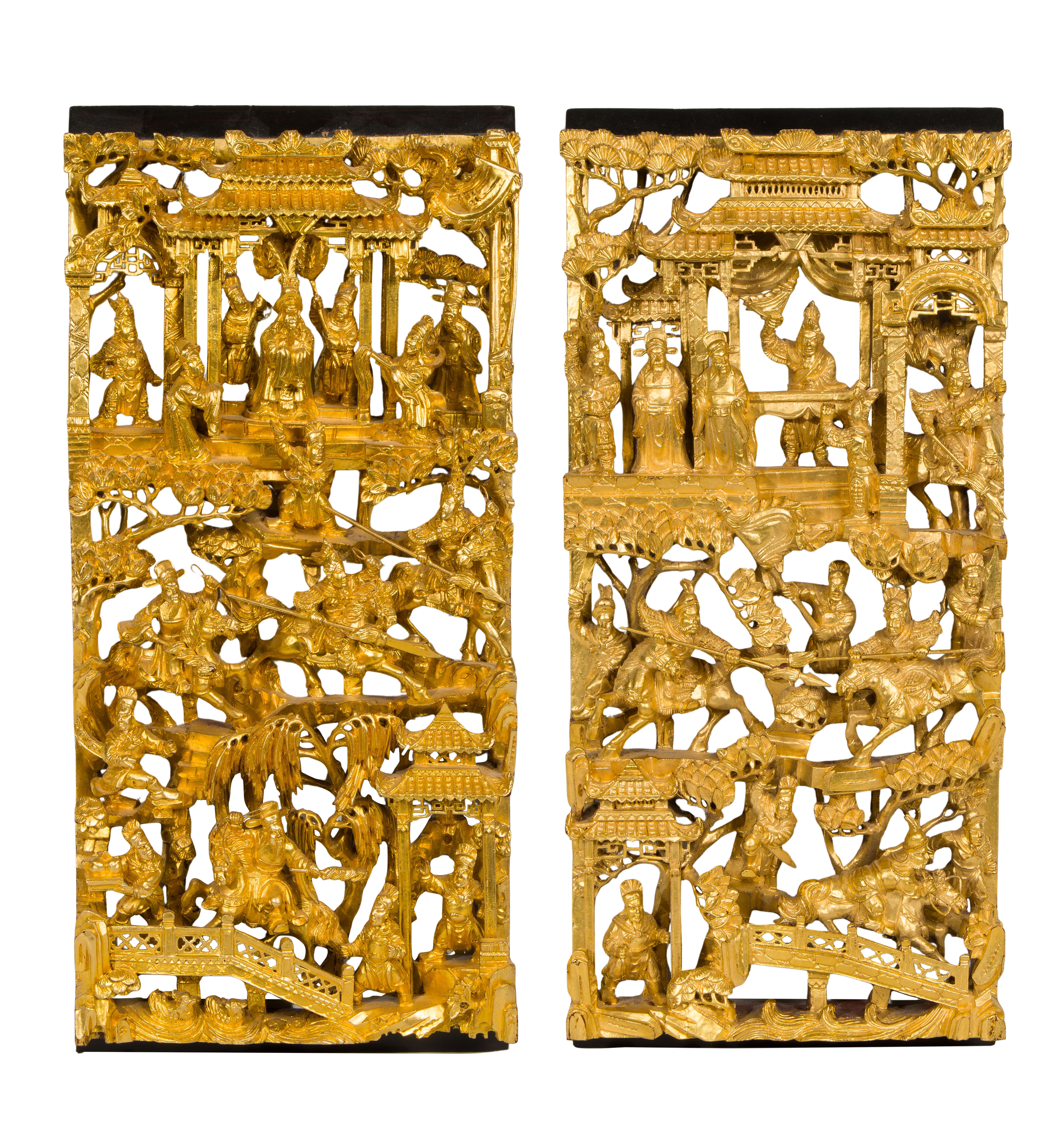 A similar pair of intricate wood wall hangings, depicting a battle scene