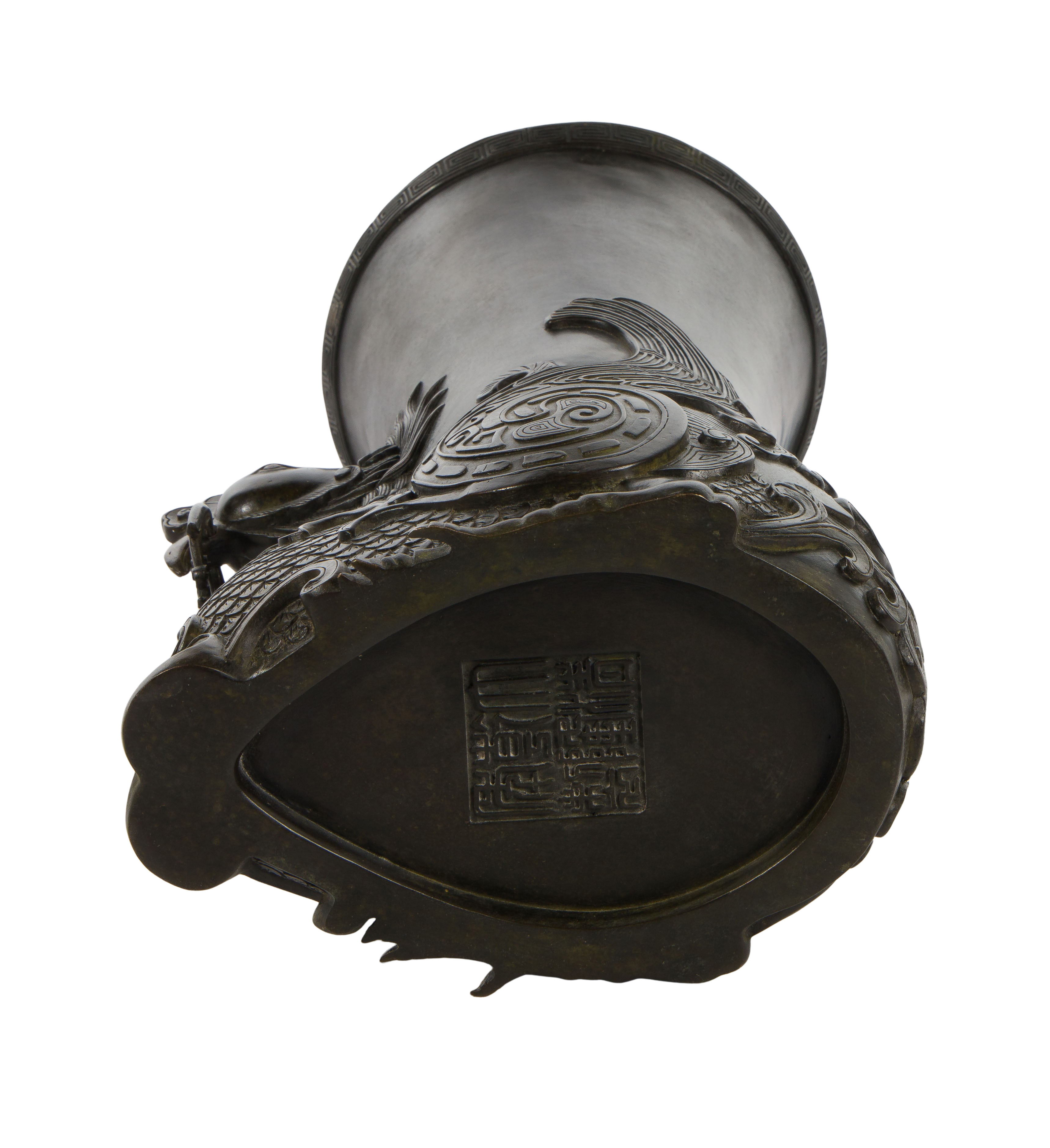 Depicting an ornate bird having a ring in its beak, six-character Qianlong archaic seal stamped underside