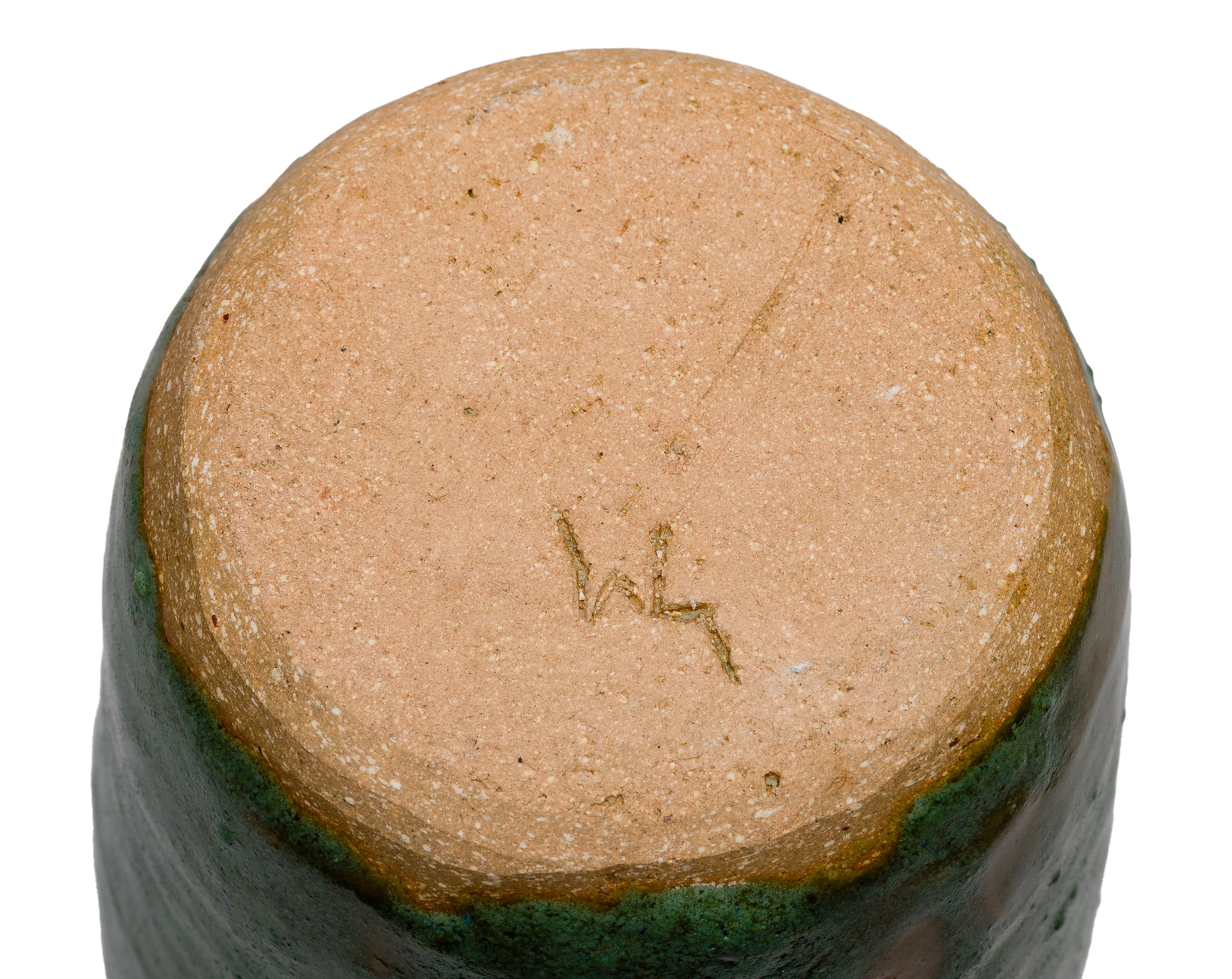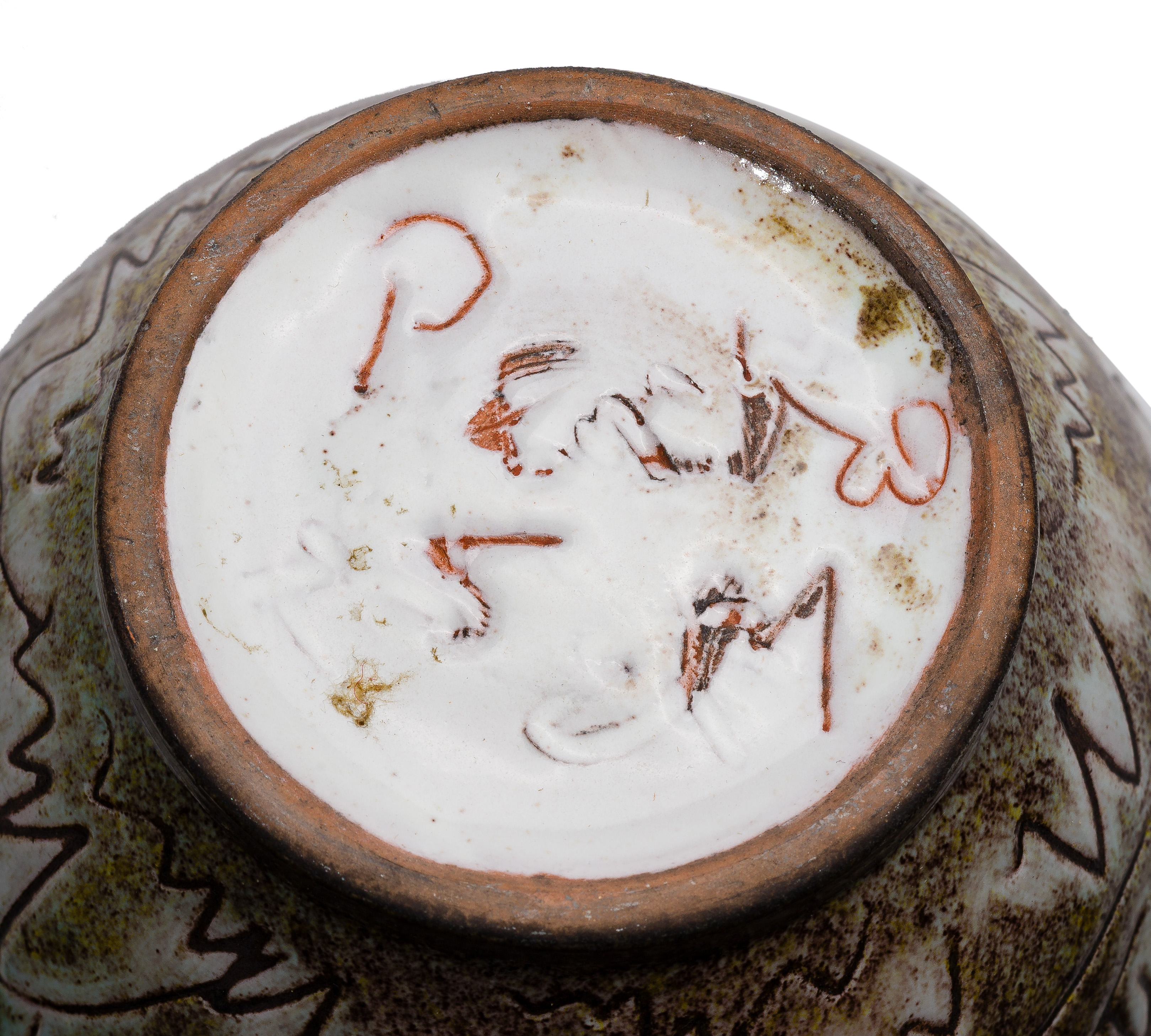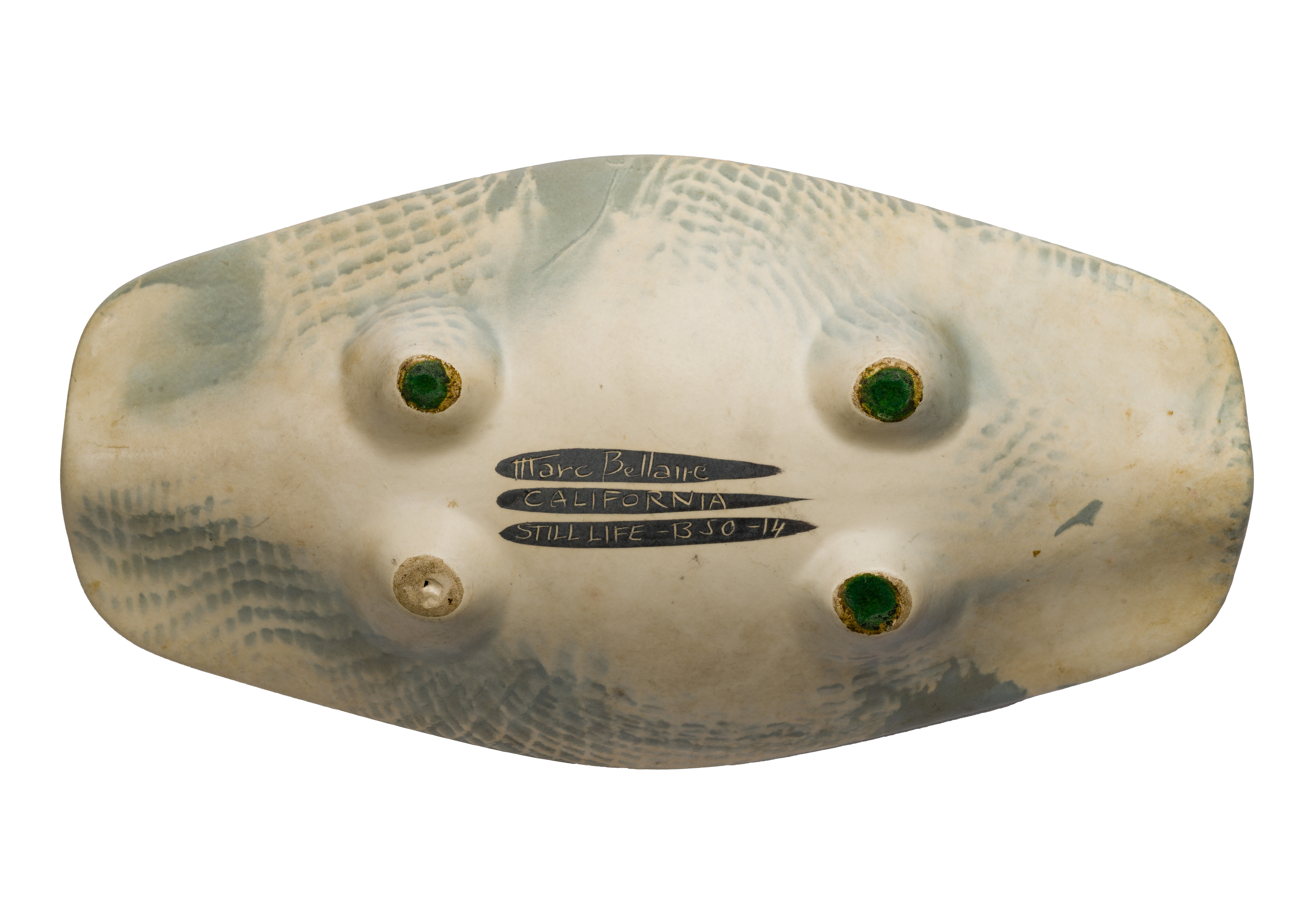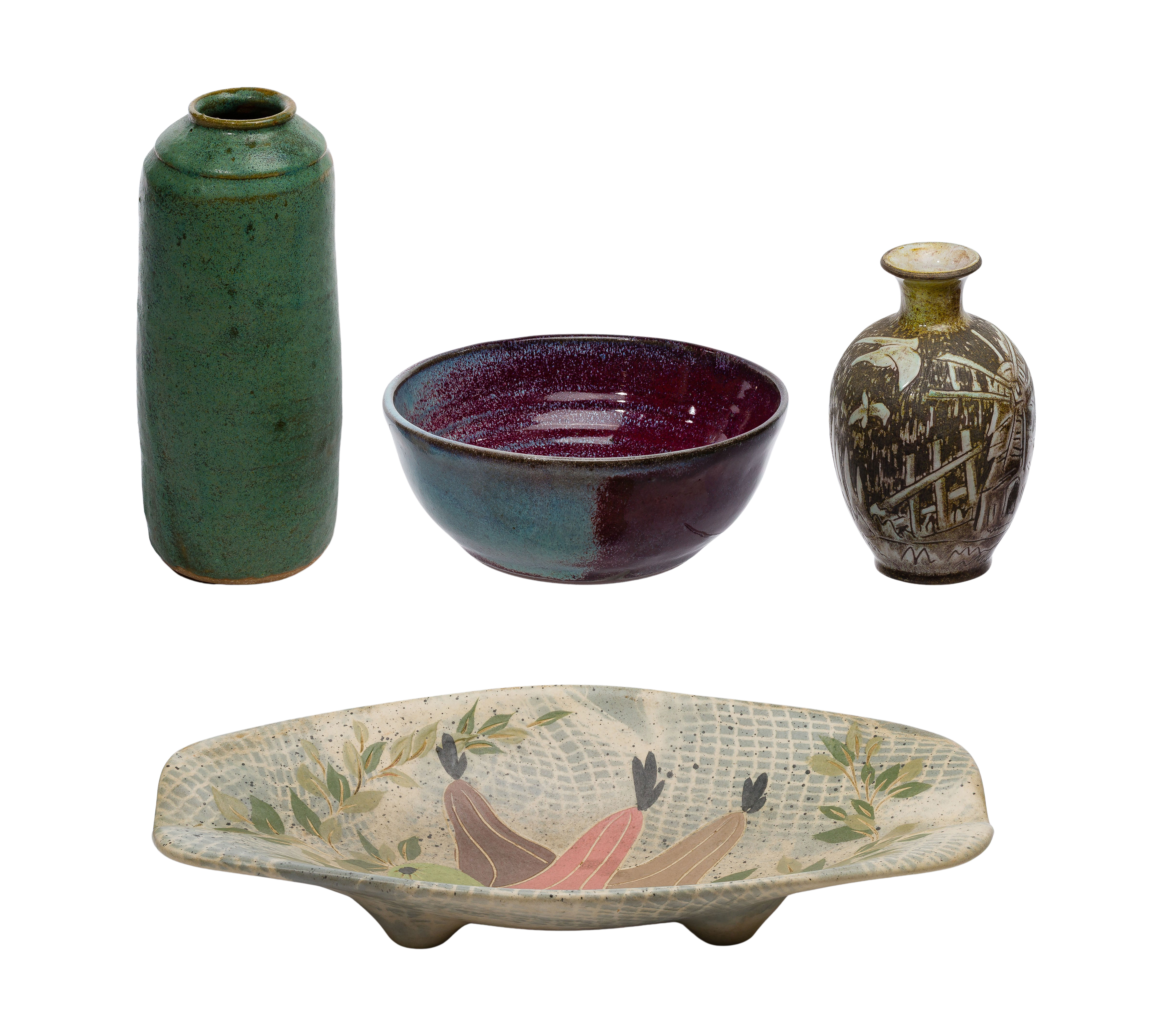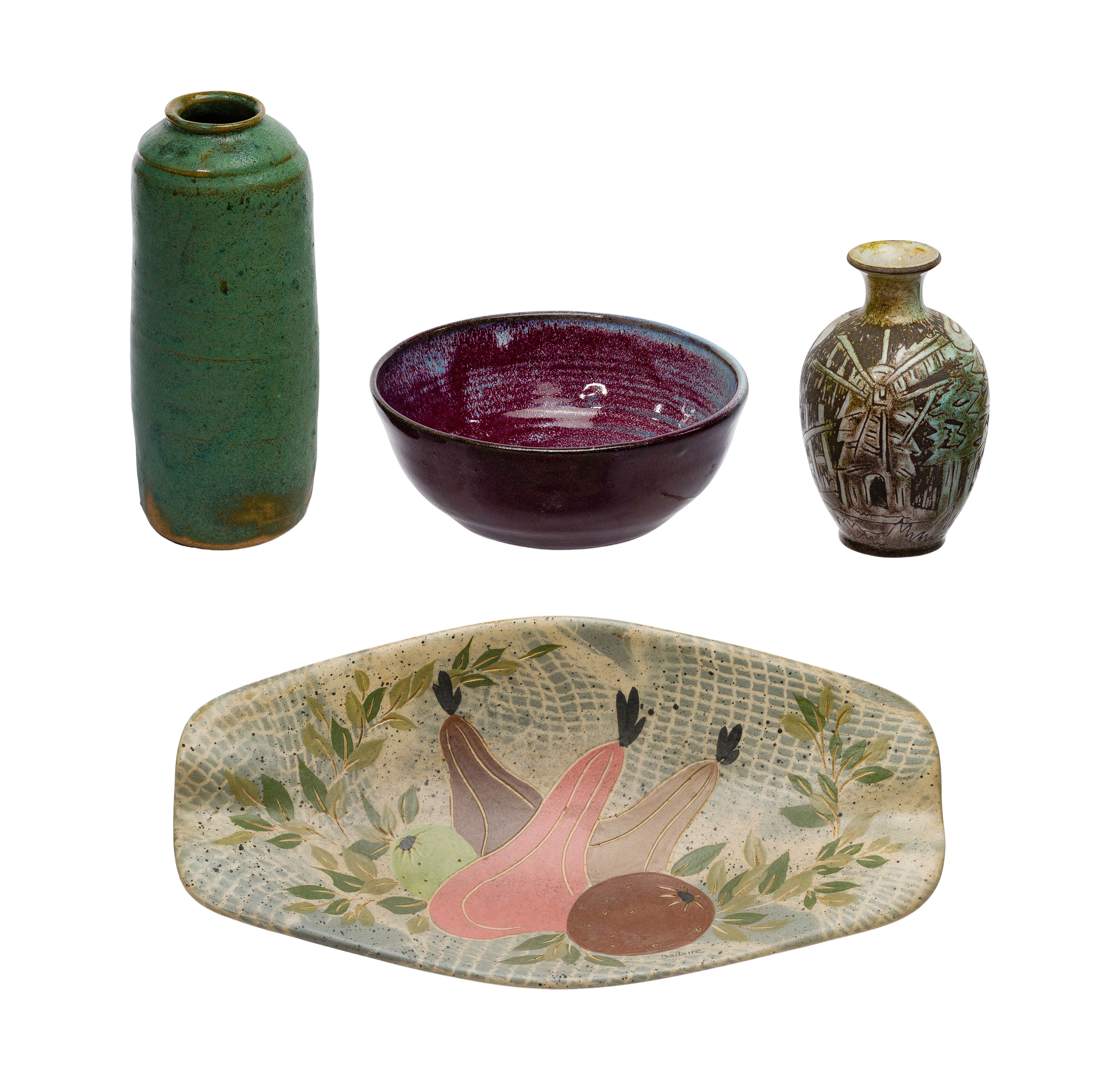 (4) items including a Marc Bellaire ‘Still Life’ centerpiece bowl having sgraffito fruit motif, incised signature and title underside, a jun glazed bowl signed ‘Marsi’ as well as a bottle vase having pictorial windmill motif and a matte green vase, both indistinctly signed