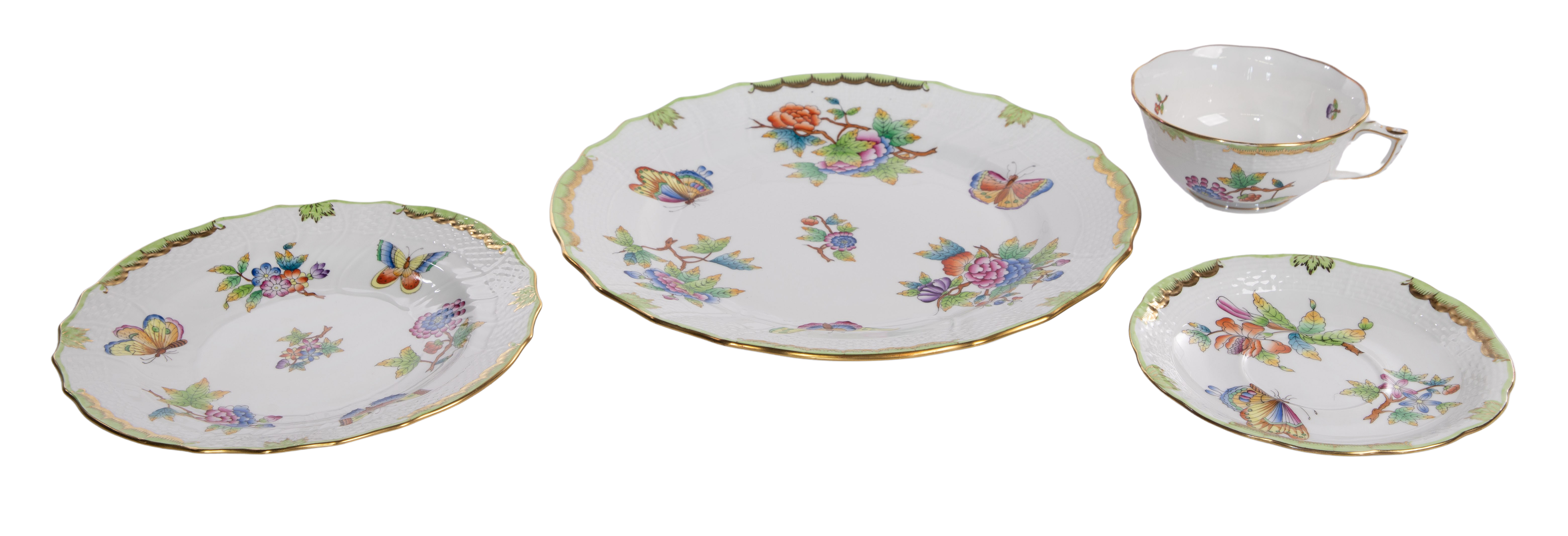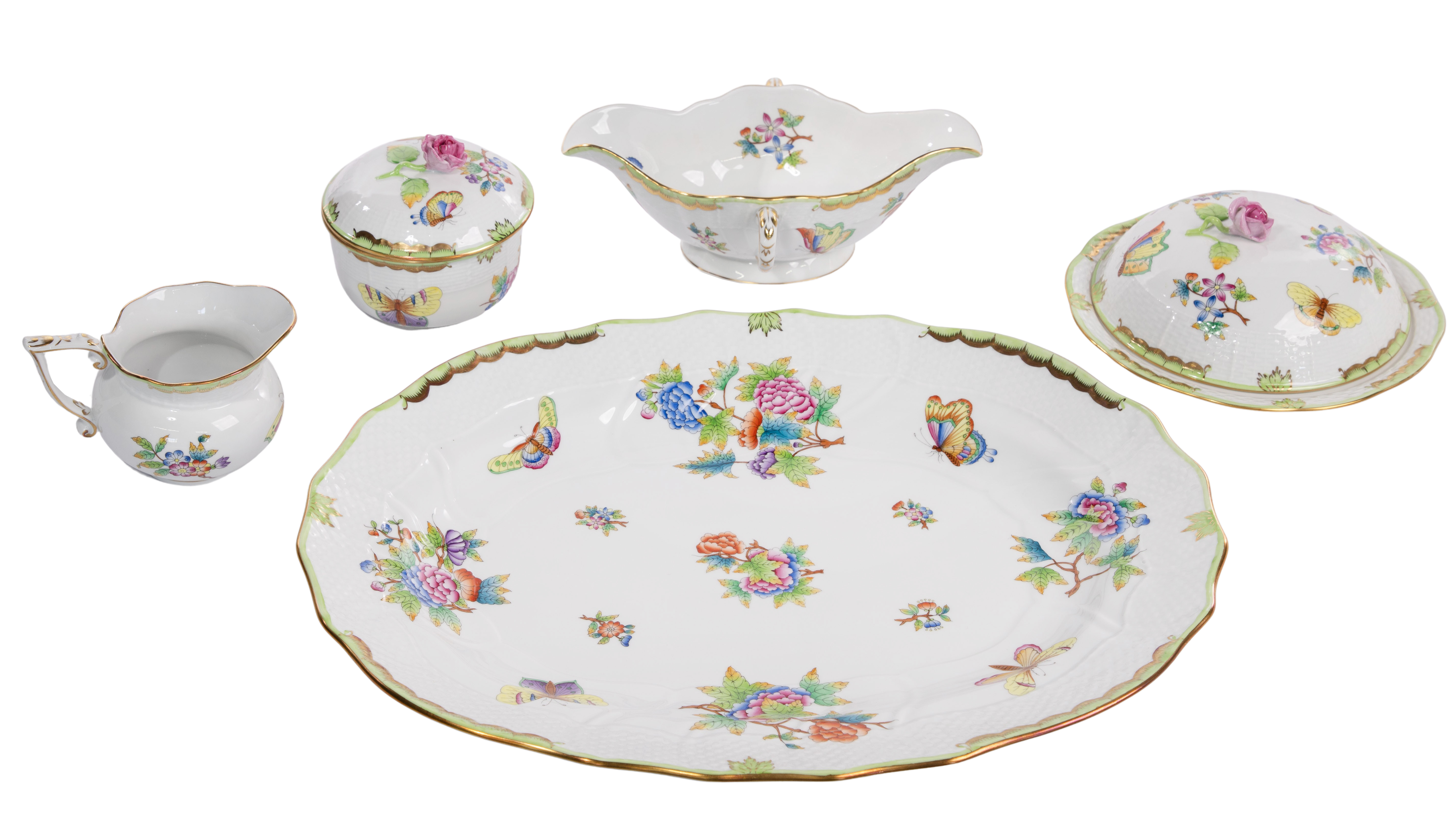 (35) items including in pink (6) 10-inch dinner plates, (6) 7 1/2-inch bread and butter plates, (6) 2 1/2-inch coffee cups, (6) 5 3/4-inch tea saucers, (6) 10-inch rimmed soup bowls, an oval platter, a gravy boat, a lidded sugar, a creamer and a lidded butter dish, all marked on underside