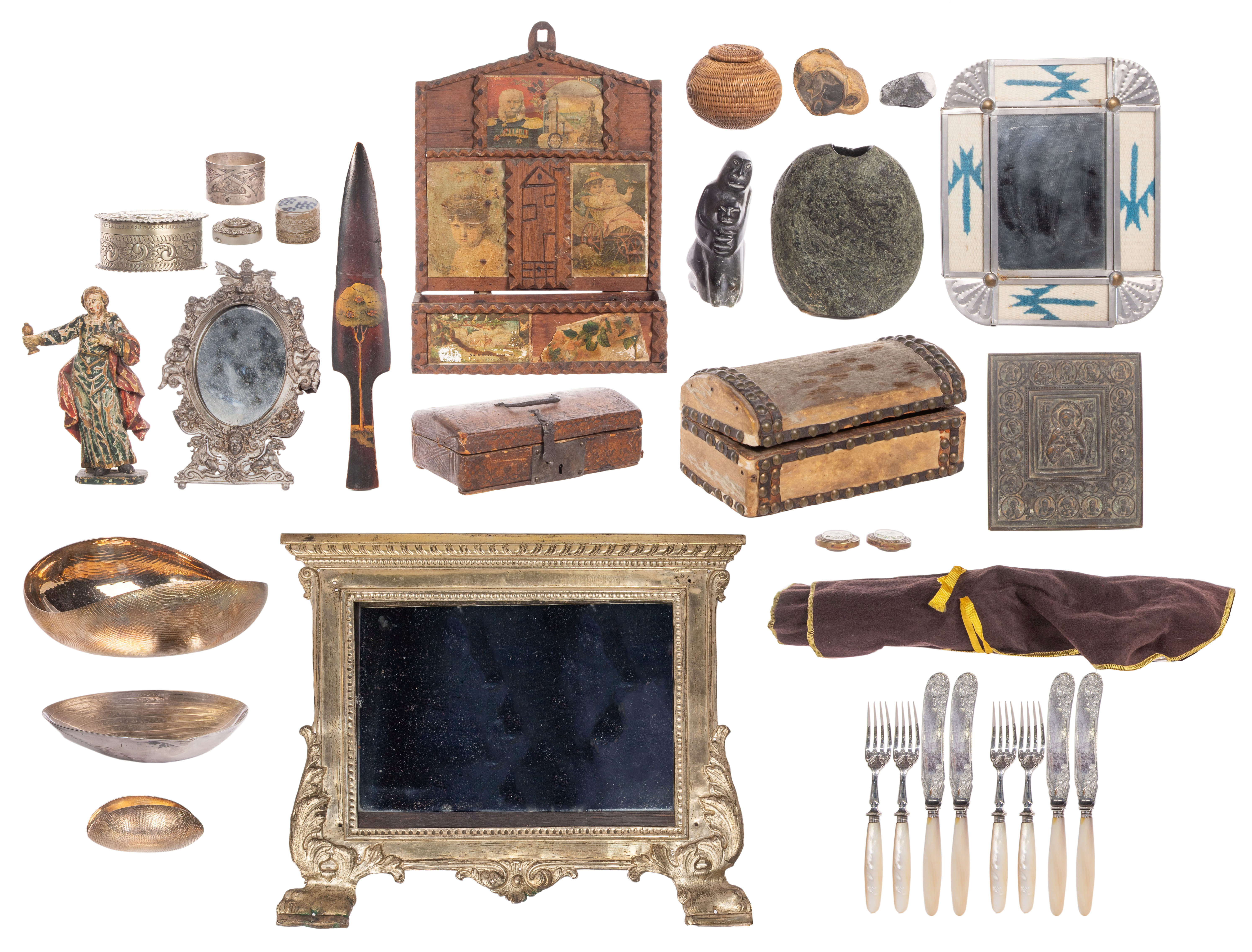 Over (40) items including silverplate objects and utensils, Inuit carved figure, religious items, frames and boxes
