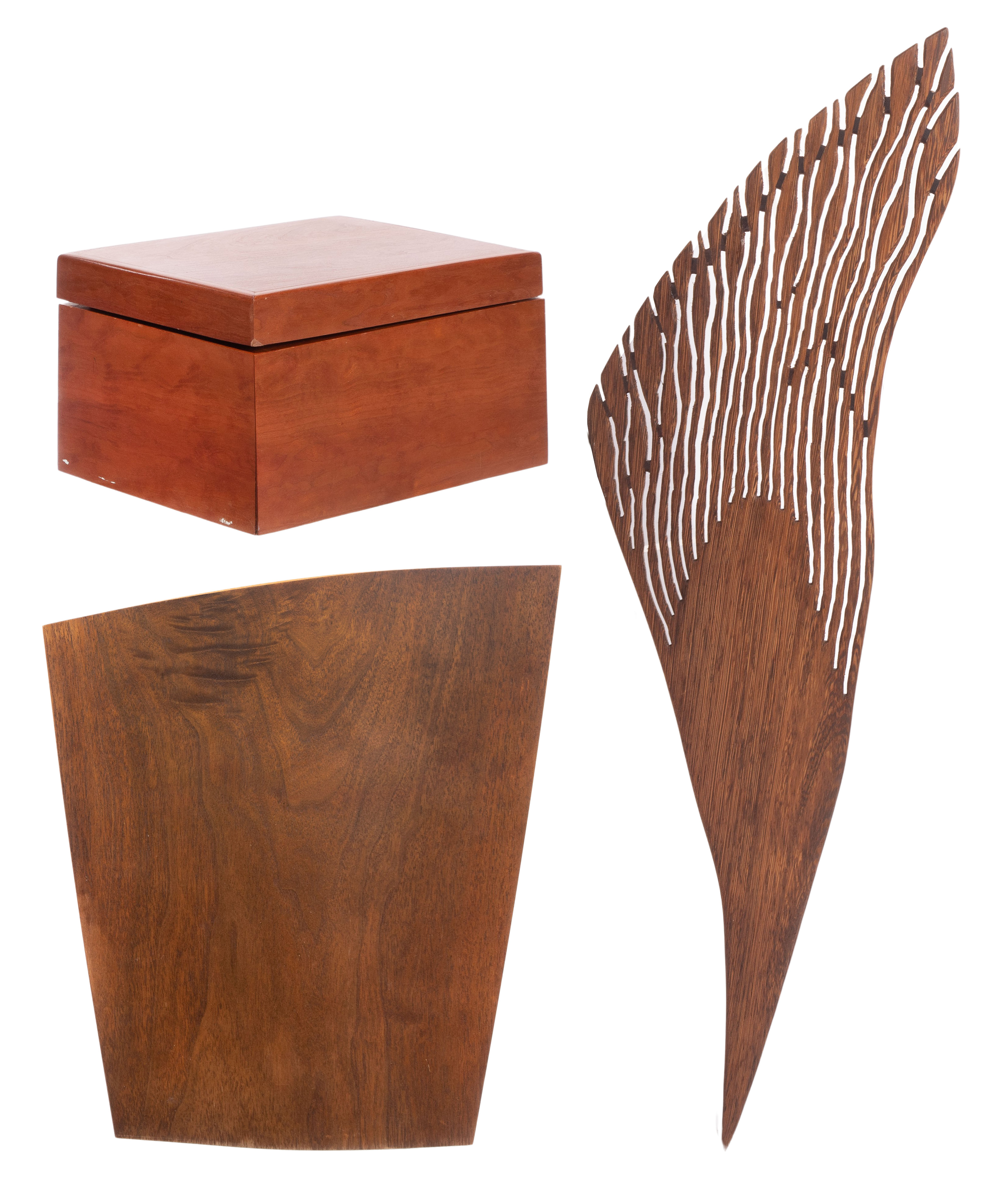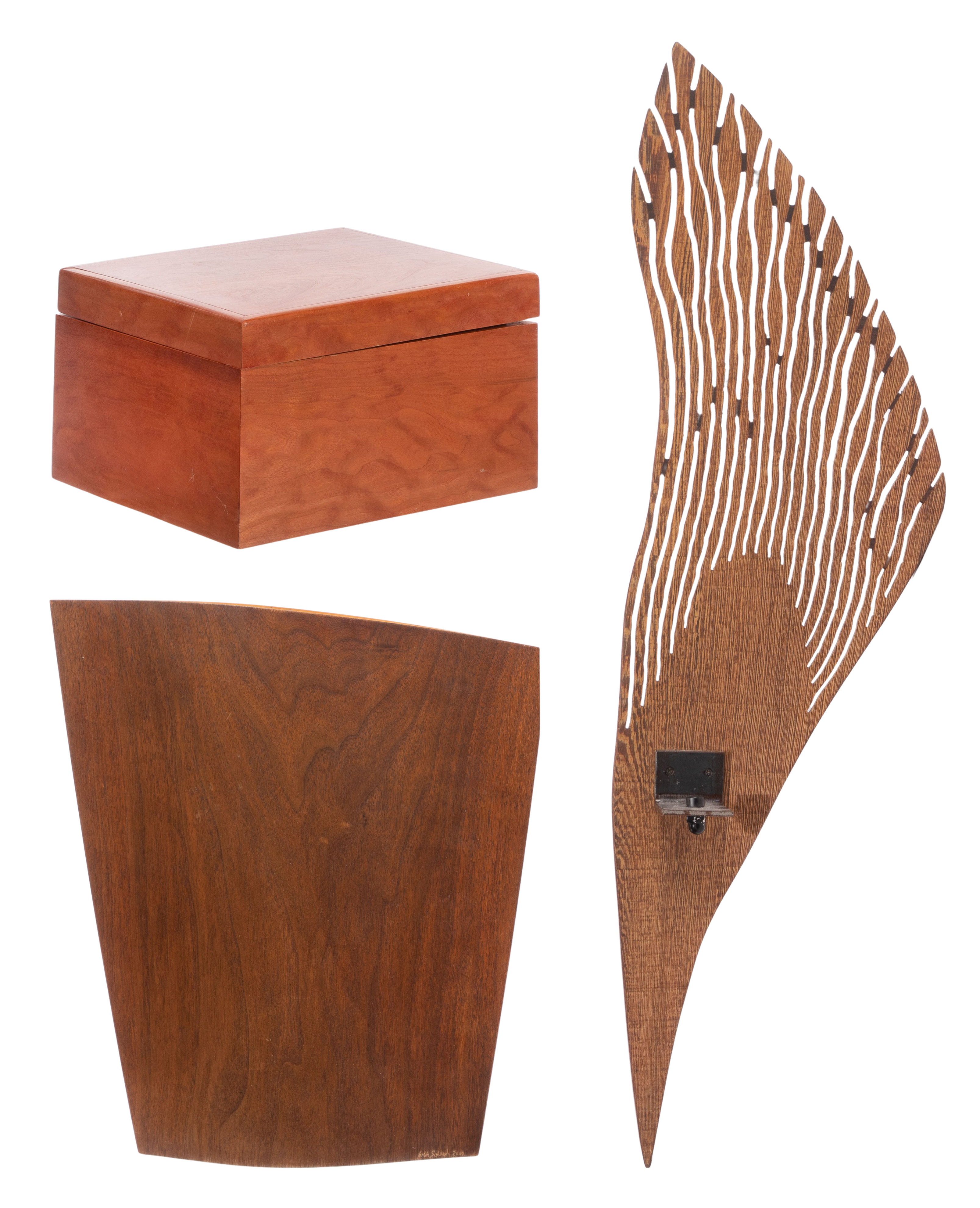 (3) items including a walnut vessel, inscribed signature ‘Colin Schleeh 2002’ and original label on underside, a wood box marked ‘Thomas Freeburg 2013’ and a wall plaque in a torch motif