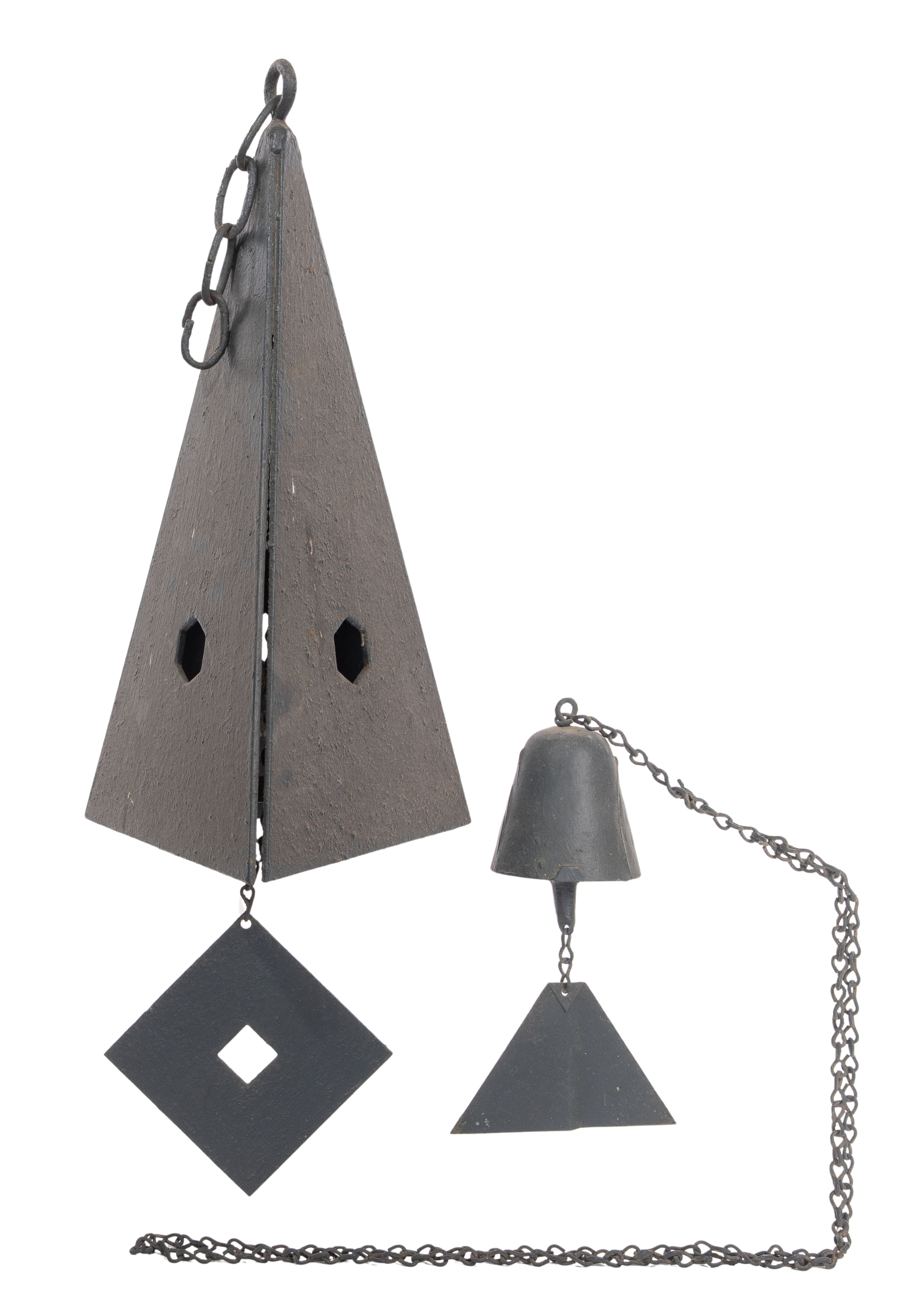 (2) total items including a Cosanti wind bell having clapper and sheet copper fin; together with an unmarked triangular wind chime