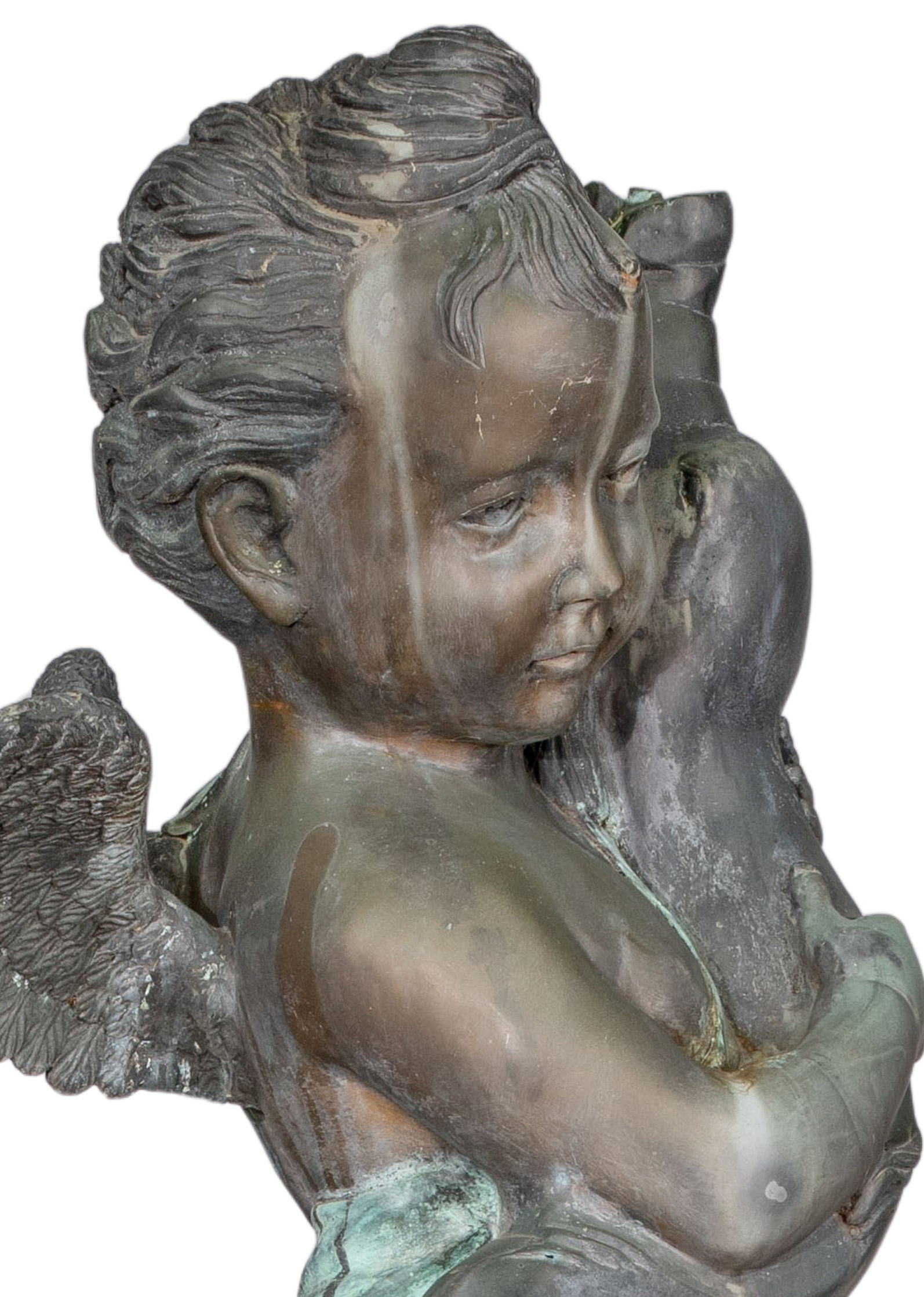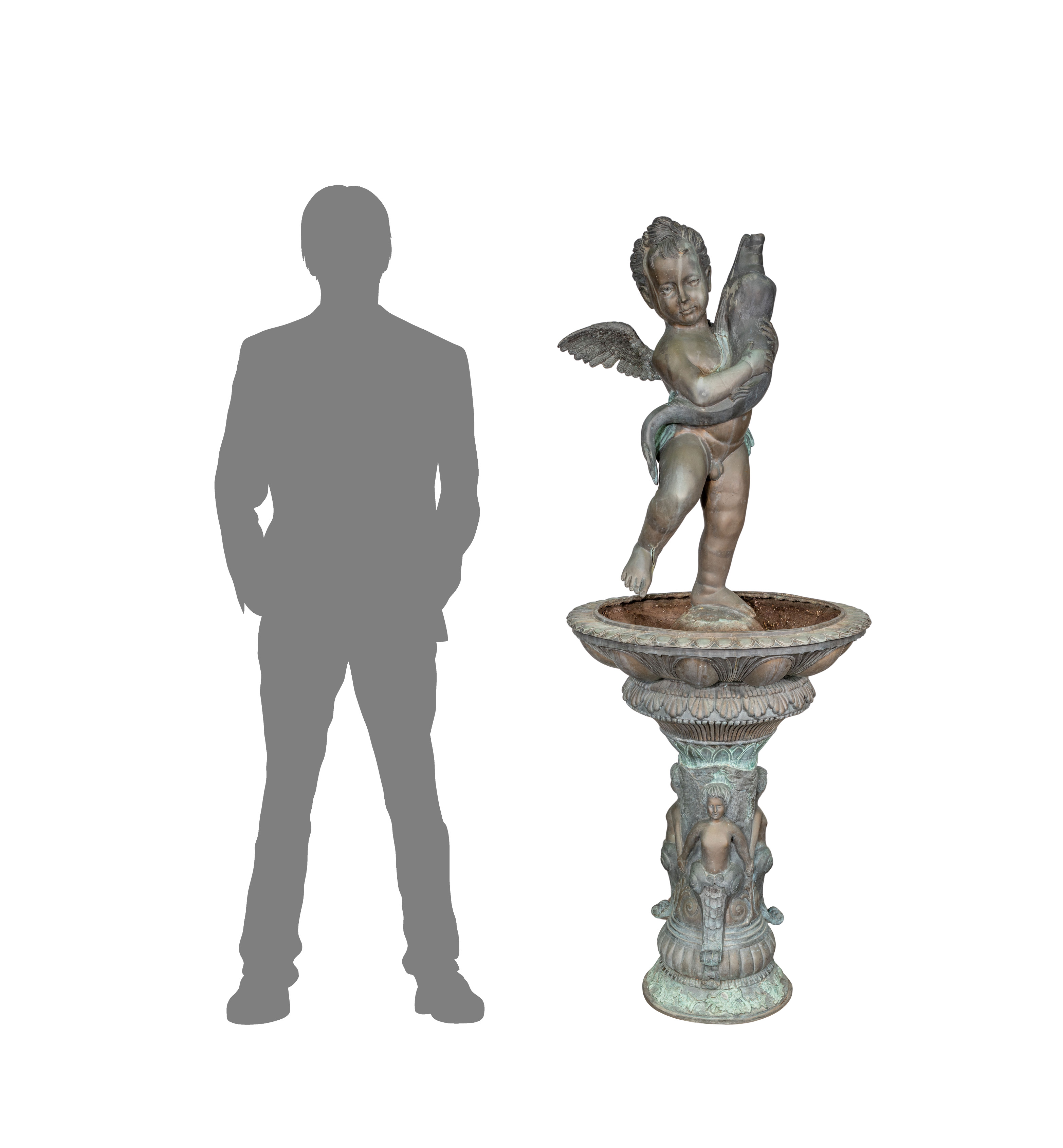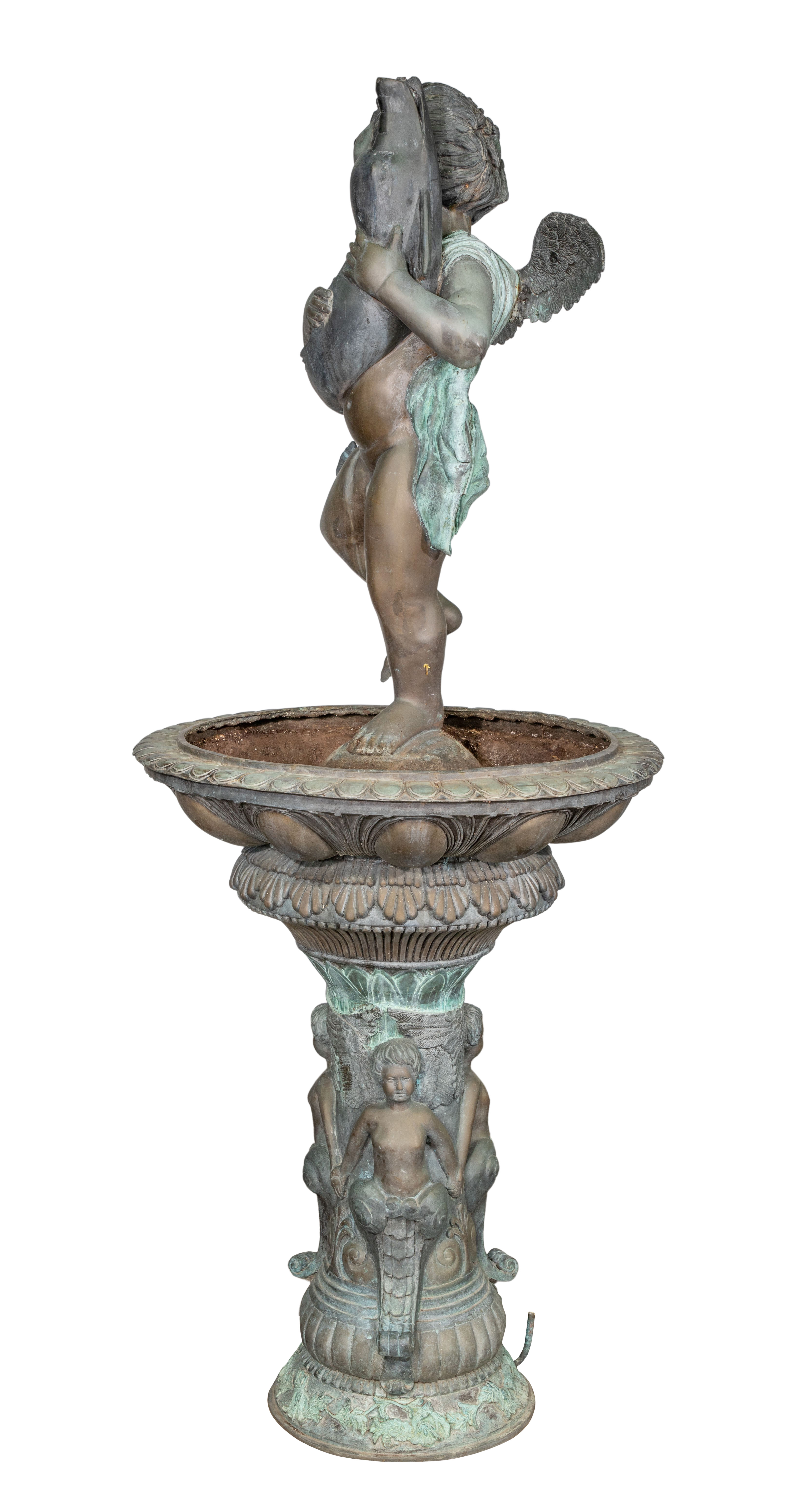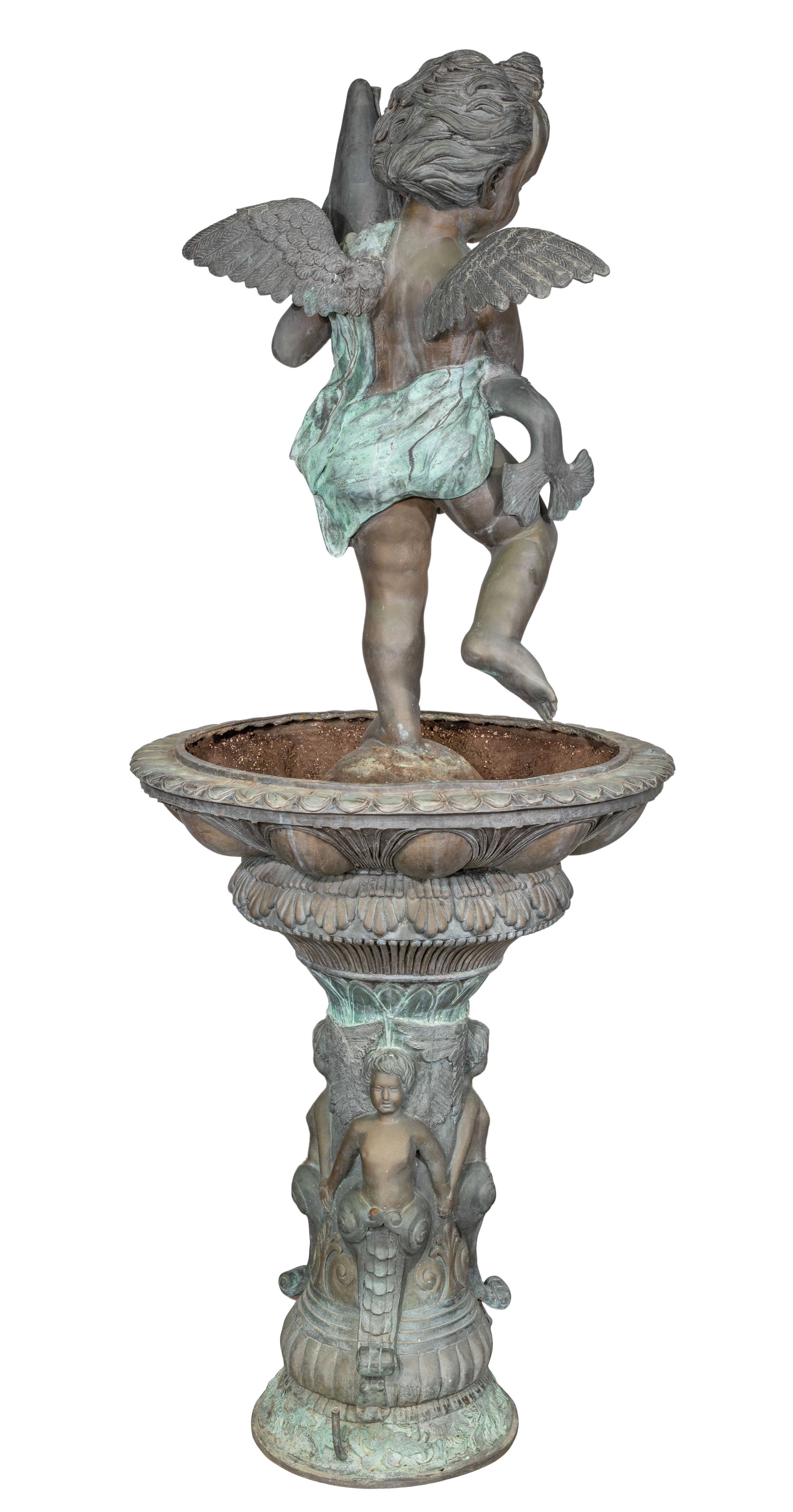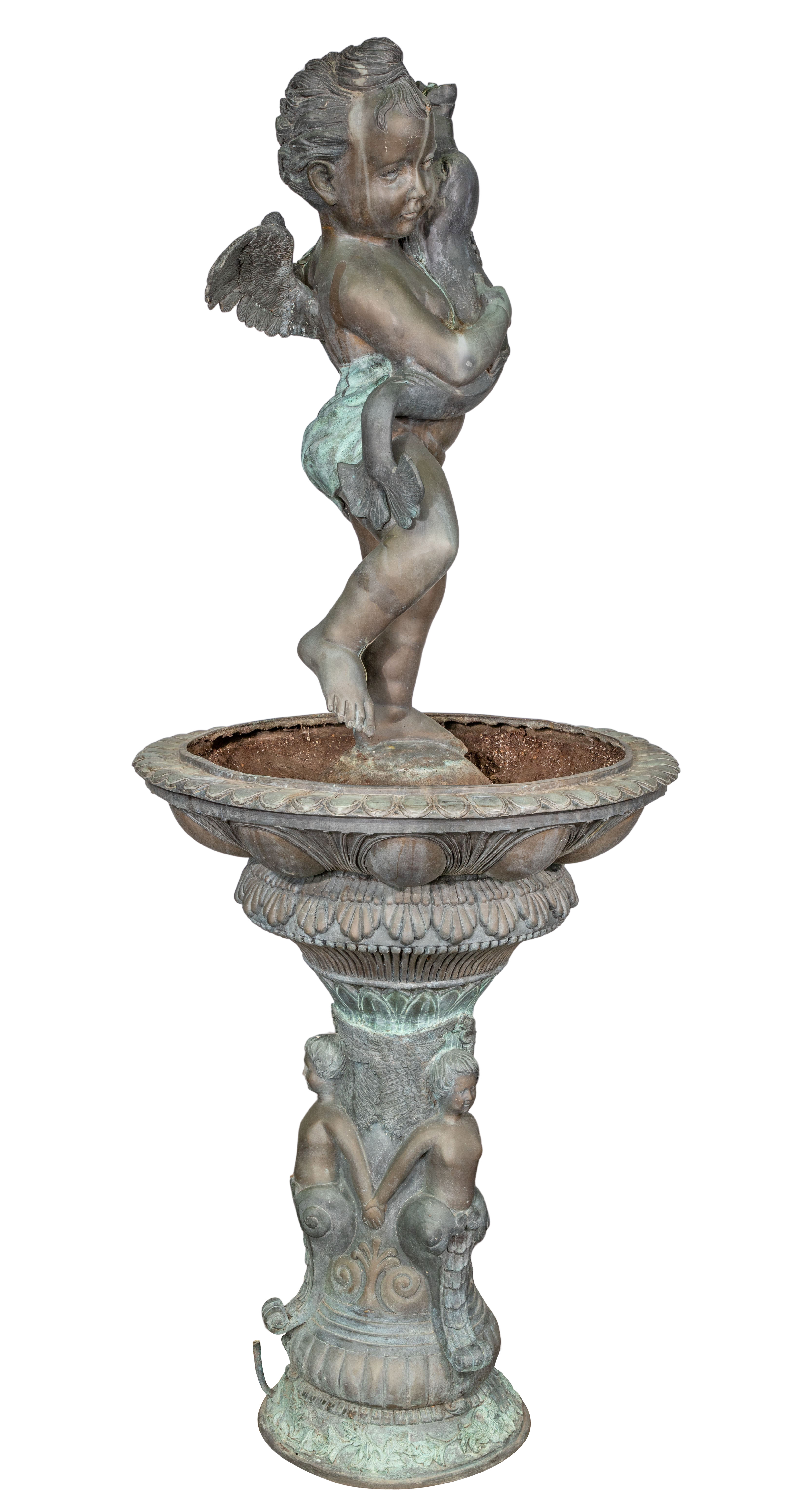 A cherub holding a dolphin with the fountain nozzle in its mouth, standing in a basin supported on a pedestal having cherub corbels, an uneven weathered green patina throughout