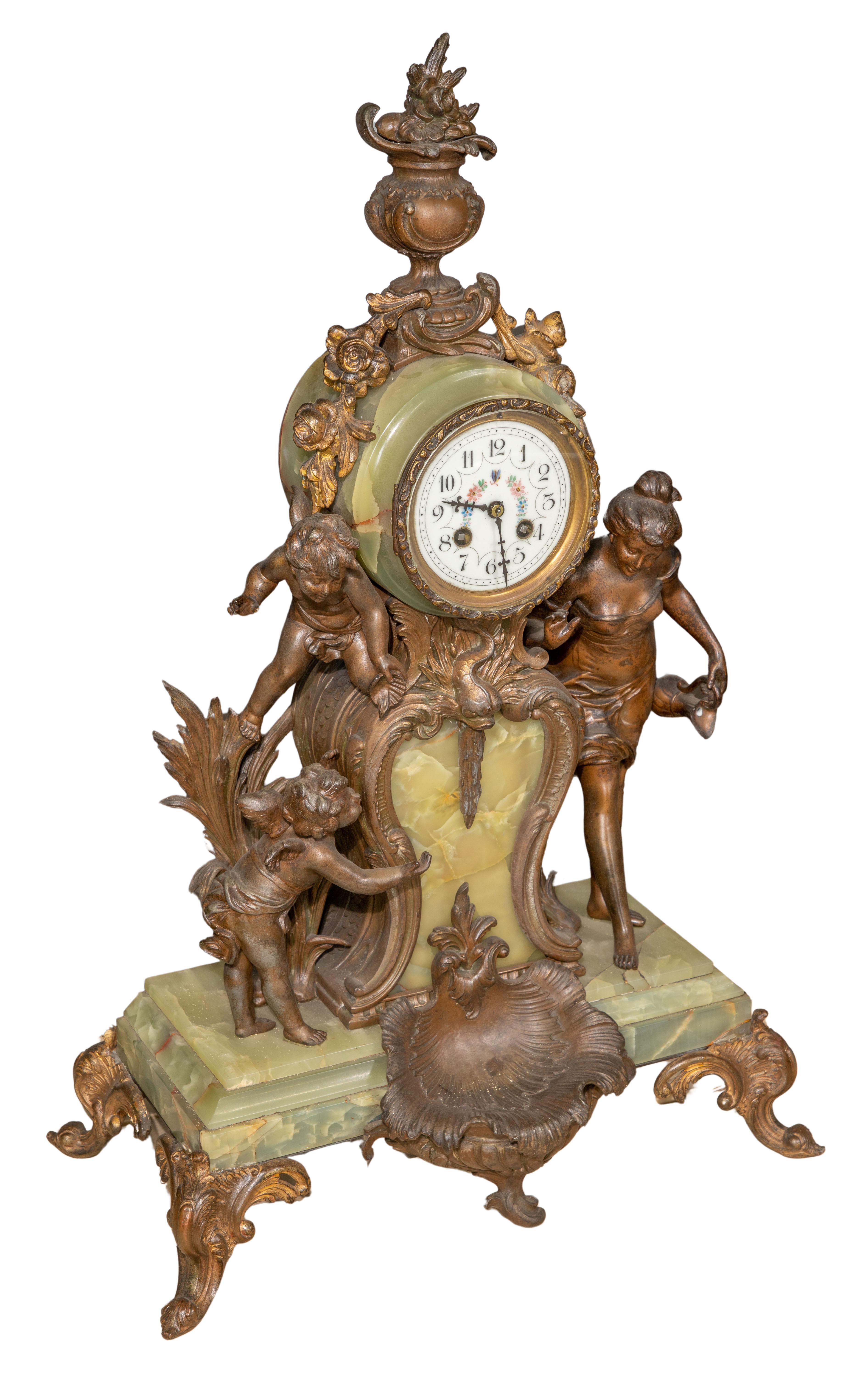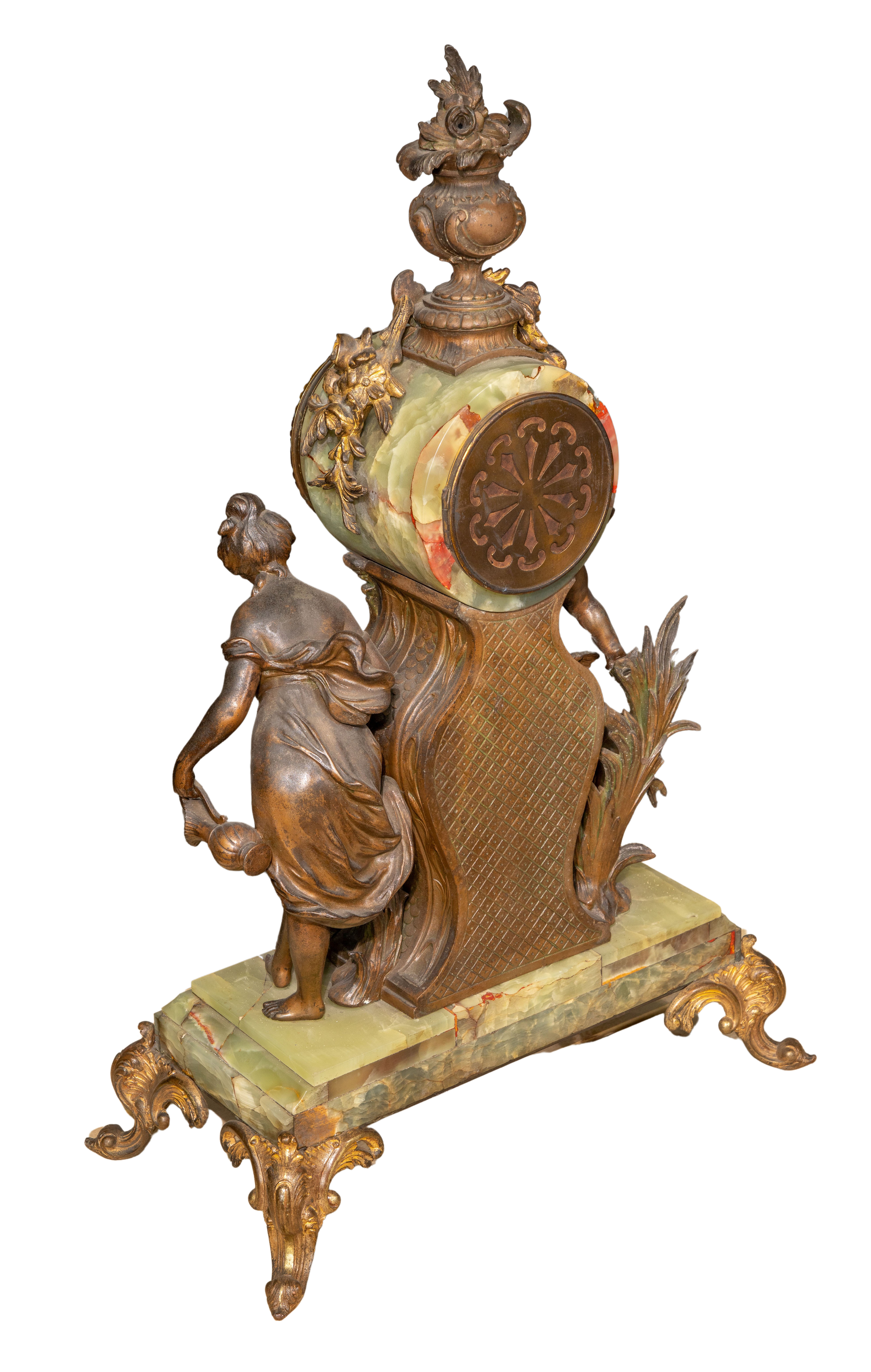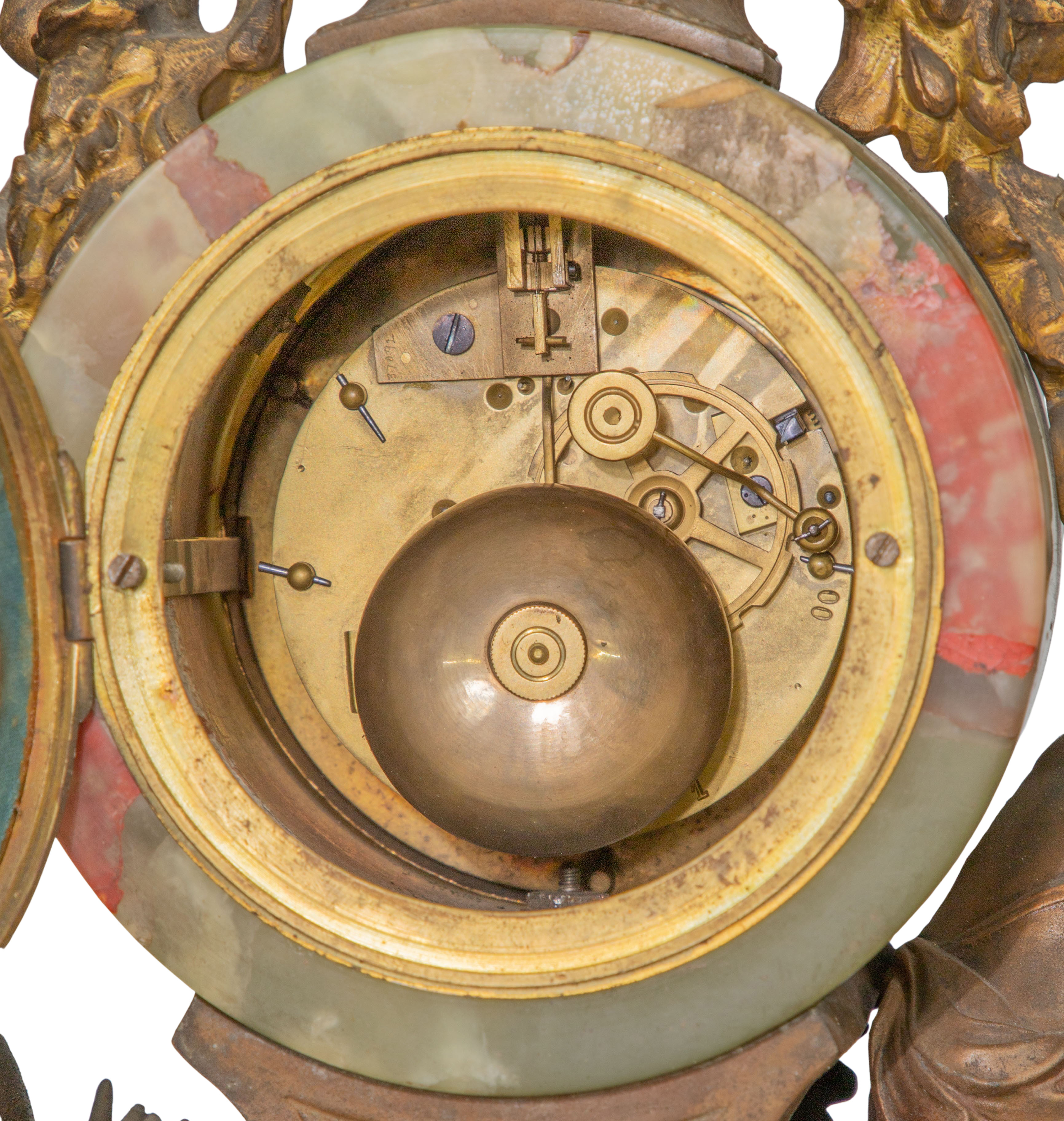 Having an unmarked white enamel Arabic numeral dial with floral decoration and two key ports, unmarked brass movement and bell chime in the metal mounted pale green alabaster cylinder supported on the lyre-shaped, alabaster faced pedestal flanked by allegorical figures on a stepped alabaster plinth on metal bracket feet