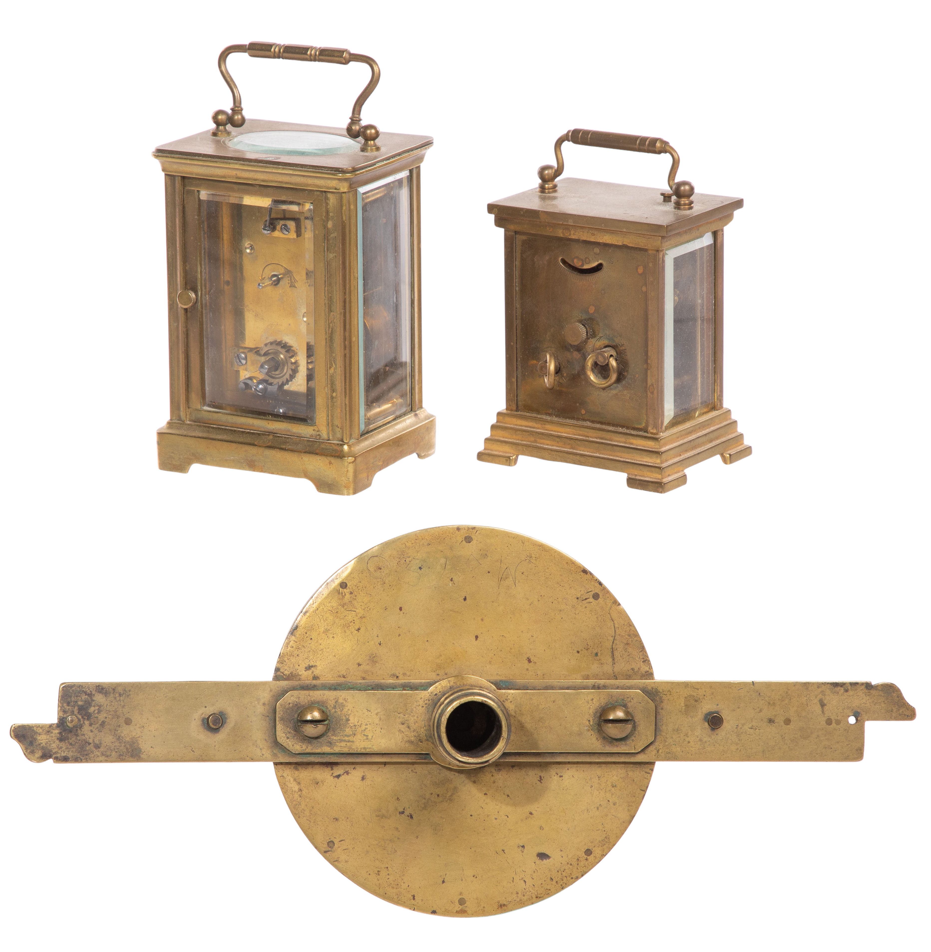 (3) items including (2) carriage clocks by C.R. Smith & Son and Waterbury Clock Co. and a brass surveying compass