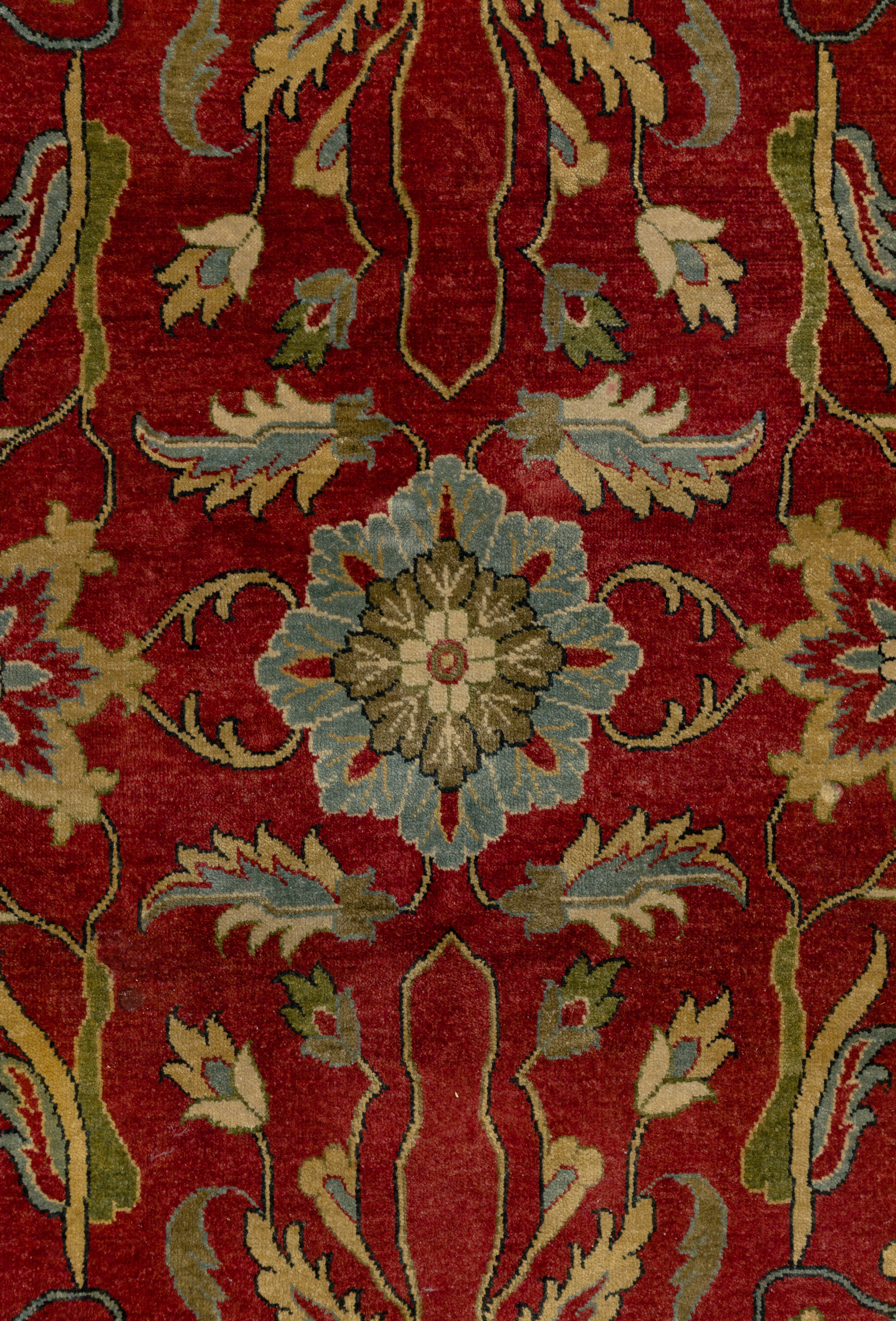 Having an abstract floral design in hues of navy, green and tan on a red field, retaining original label
