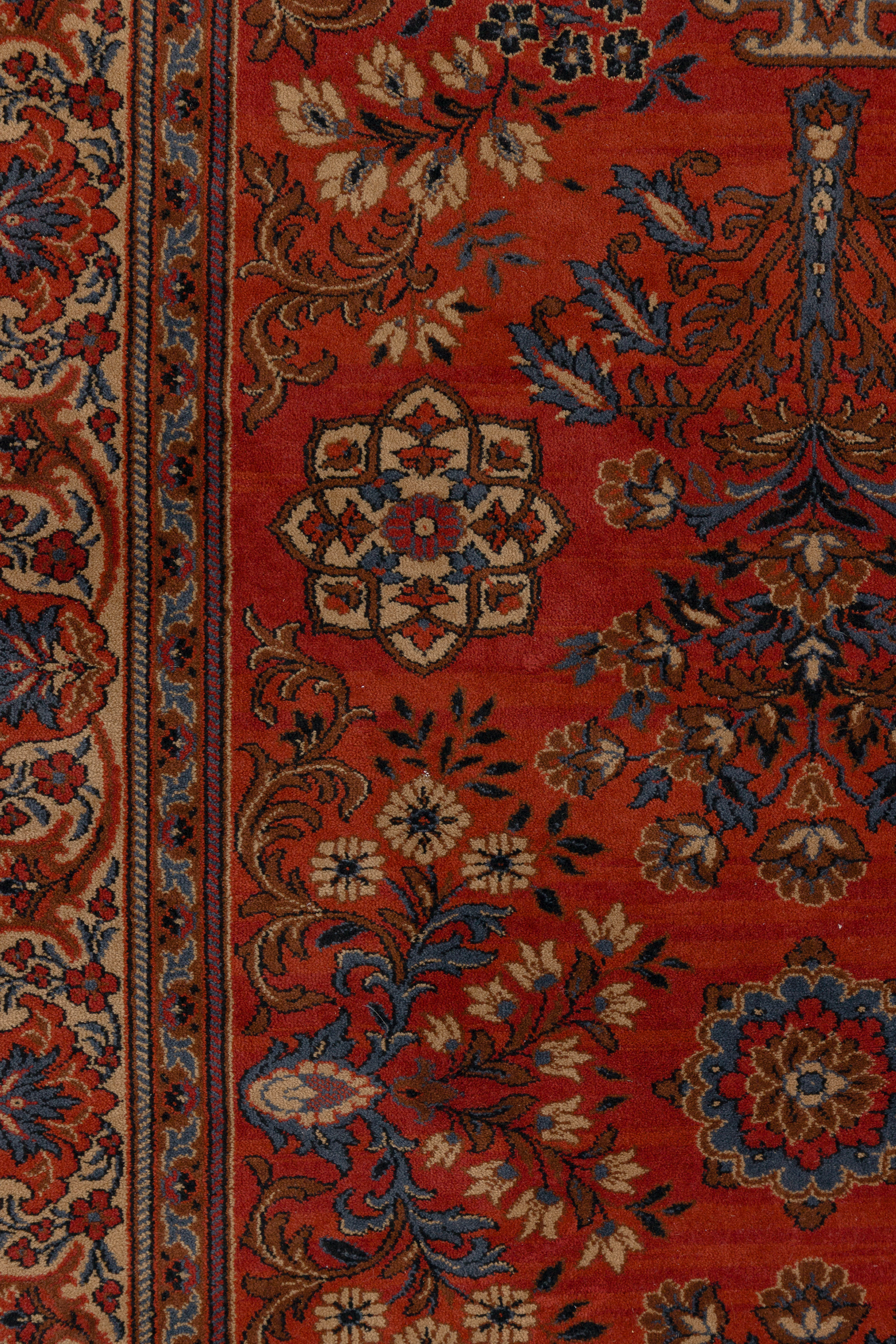 Having an abstract floral design in hues of blue, tan and navy on a red field, retaining original label