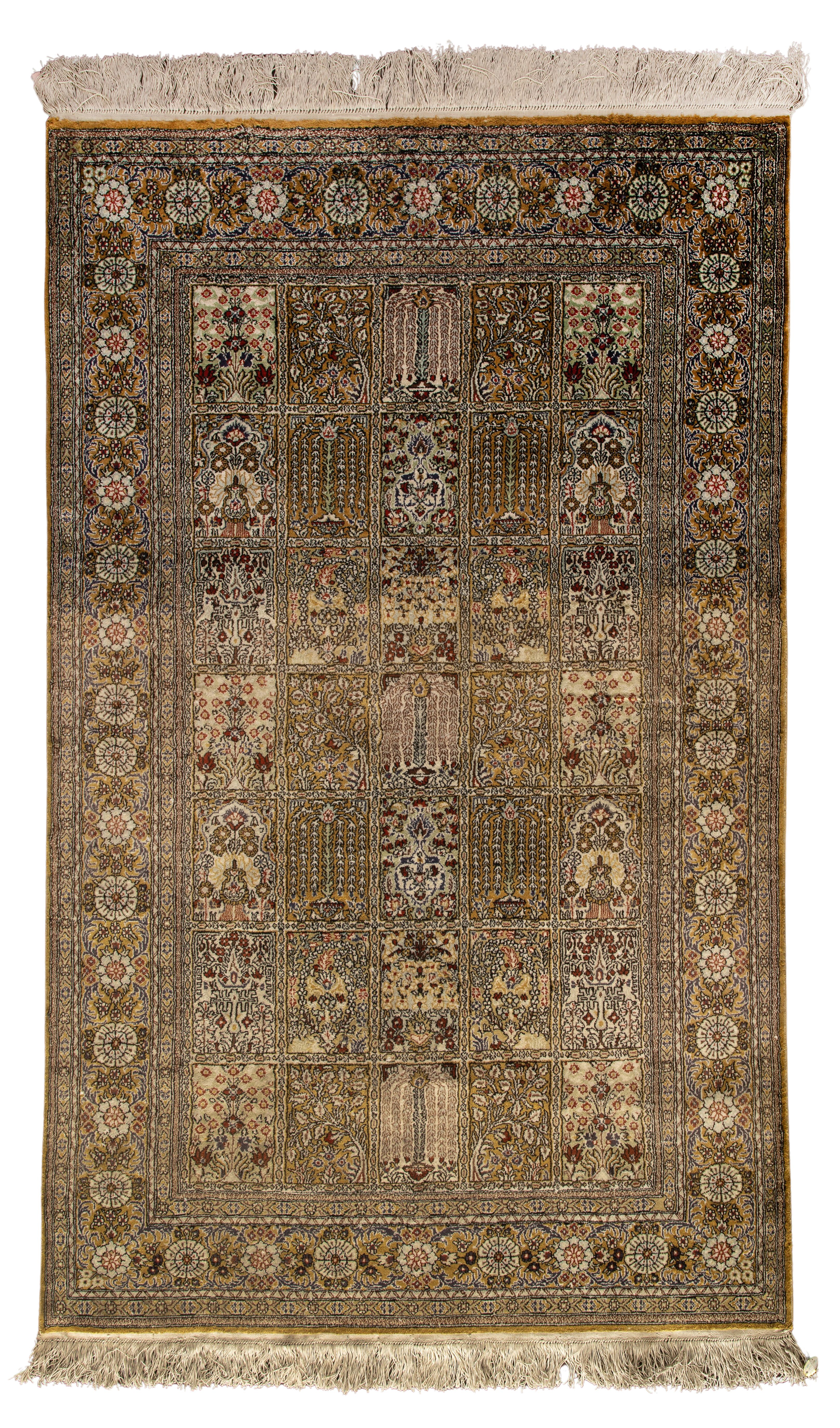 Hand knotted having a garden design in hues of green, ivory, blue, red, brown, gold, rust and mauve on a tan field, tag attached to fringe