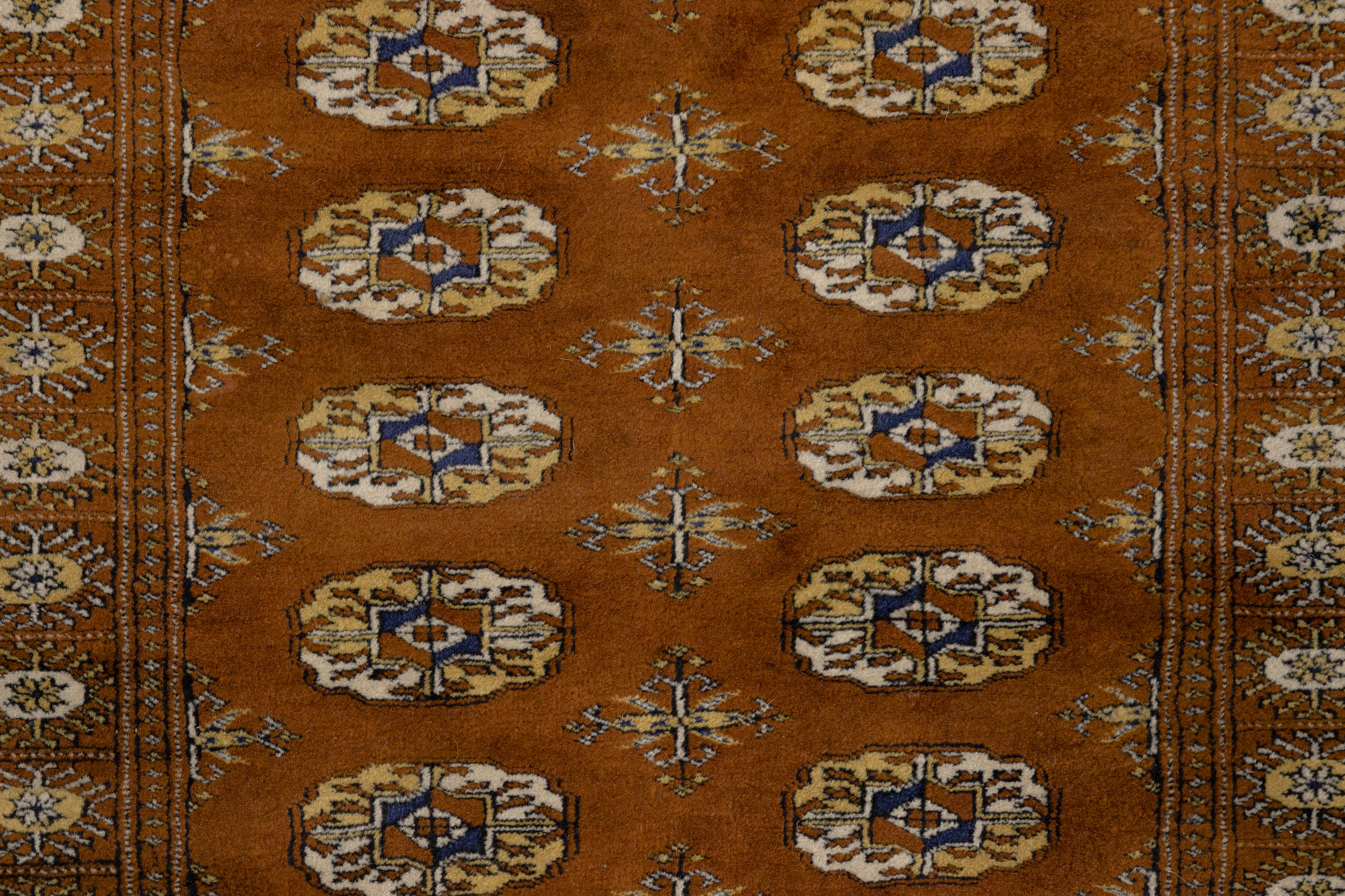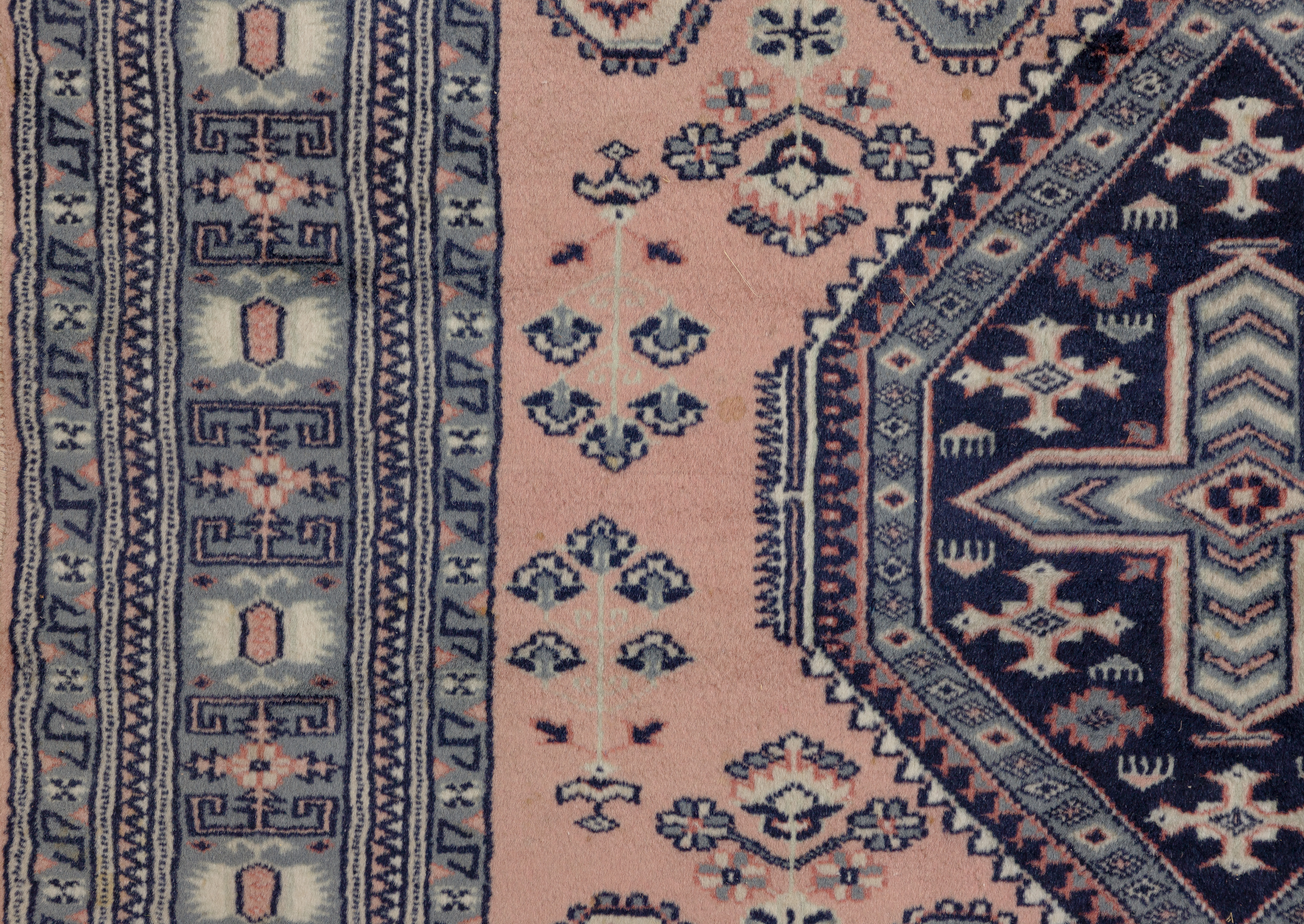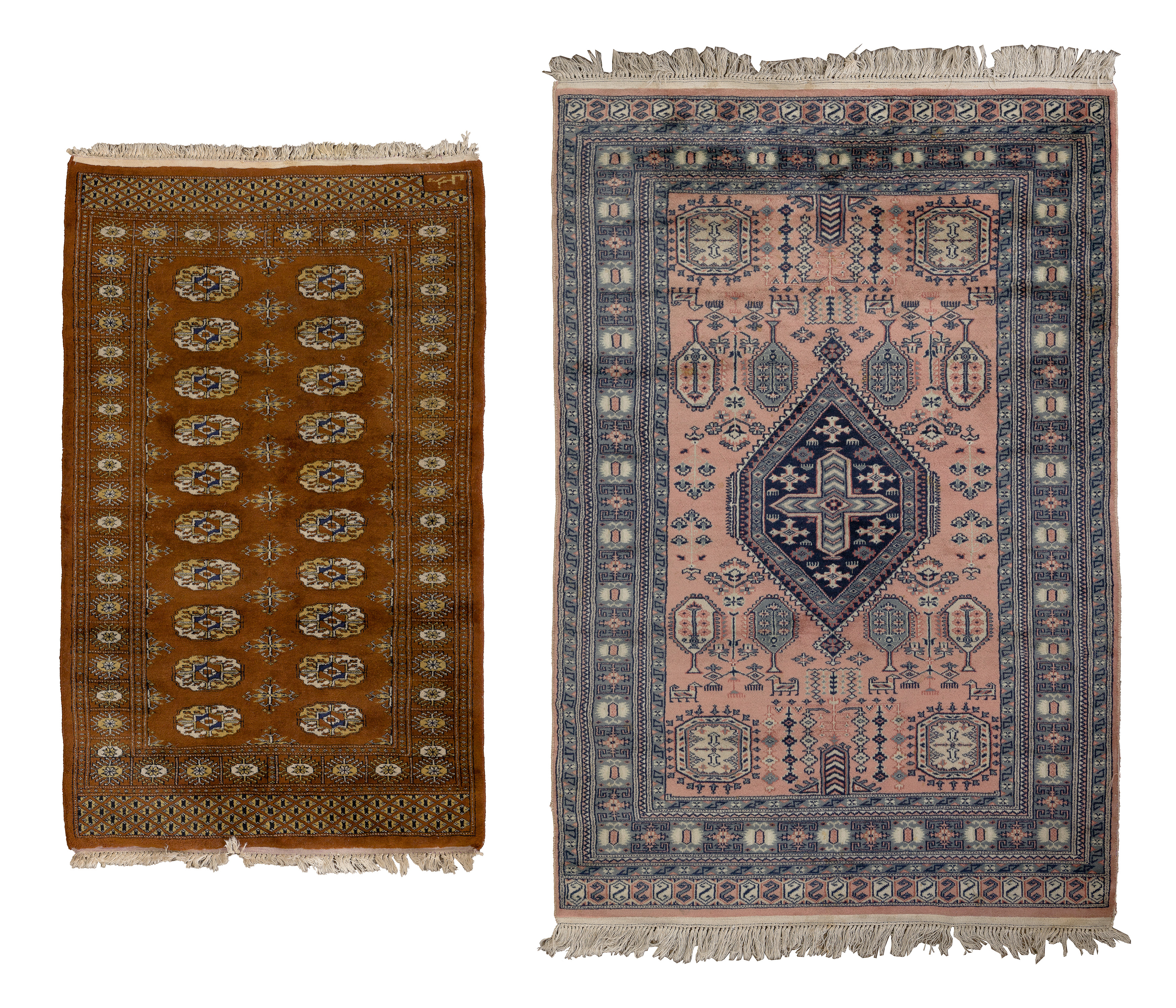 (2) items including an abstract floral in hues of blue, white and black on a pink field and an abstract geometric in hues of white, gold-tone and black on a brown field (5 ft x 3.5 in.)