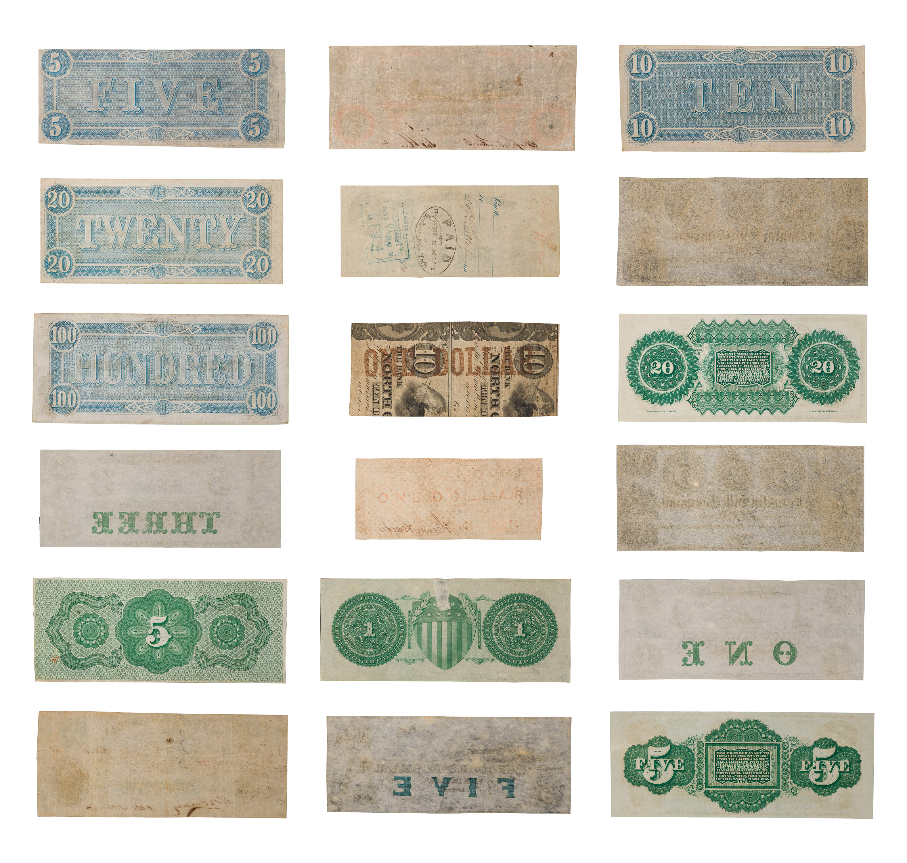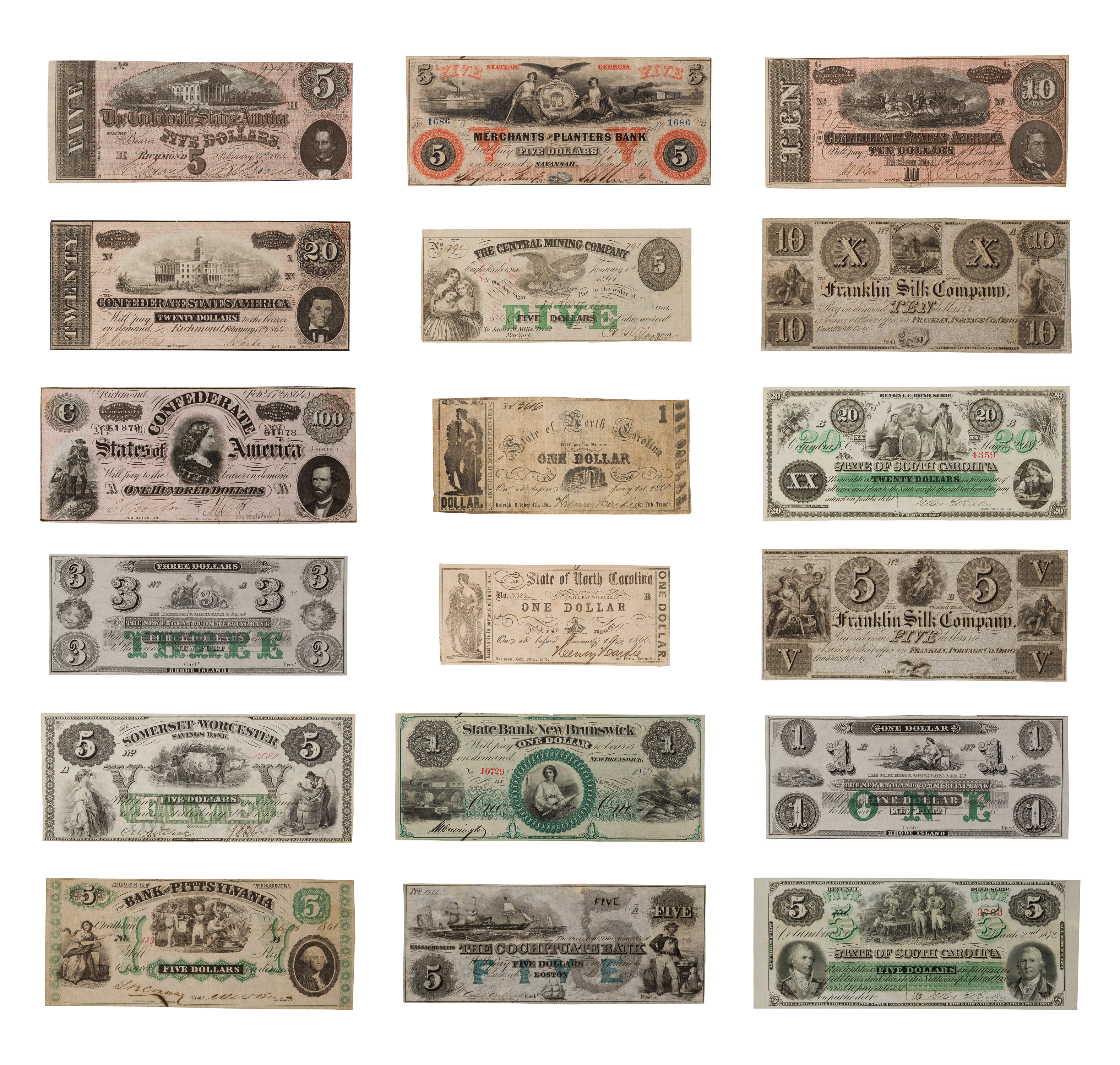 (18) banknotes from various regions including New England, South Carolina, The Confederate States, Virginia, Massachusetts, Ohio, New York and New Jersey, in heavy plastic sleeves