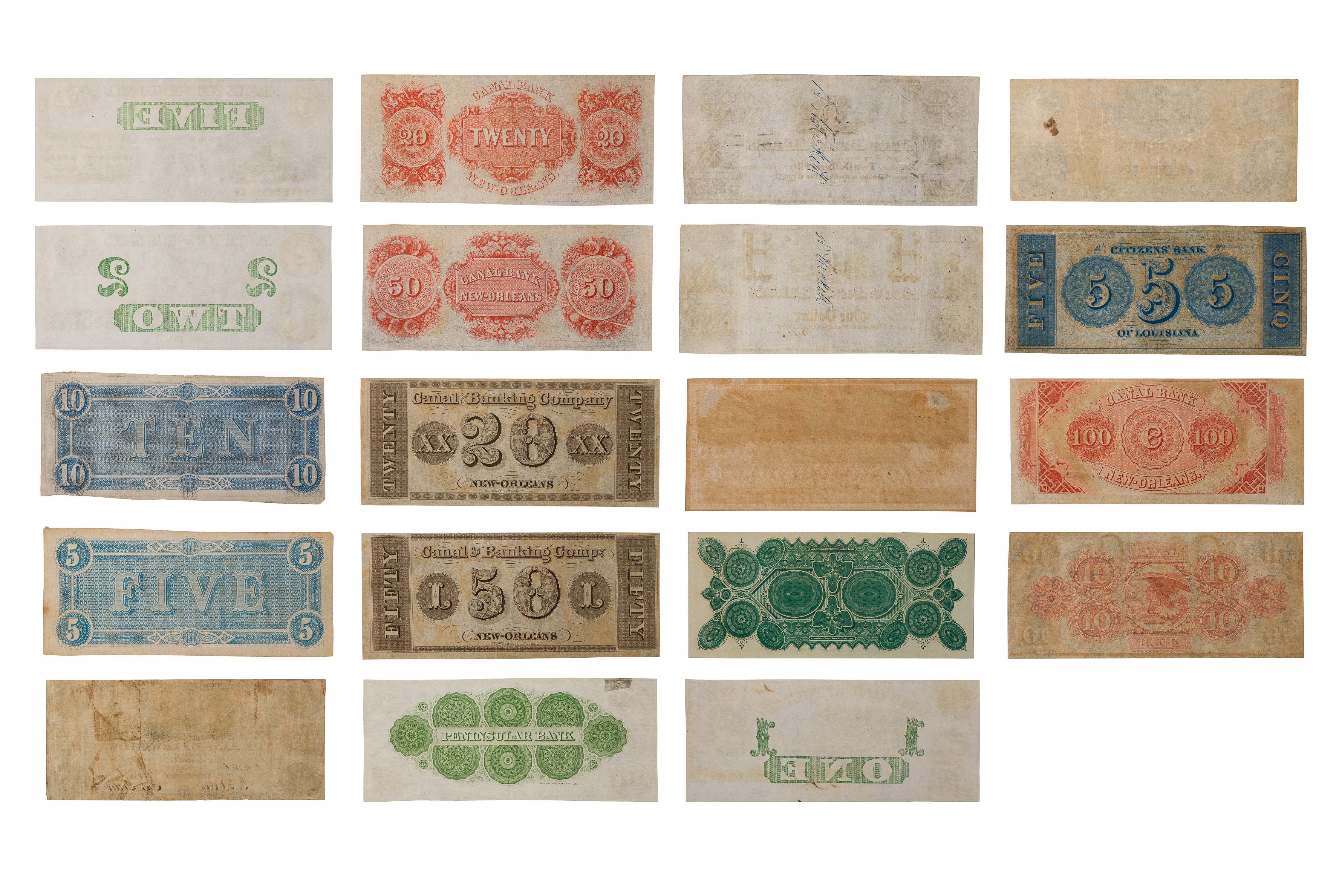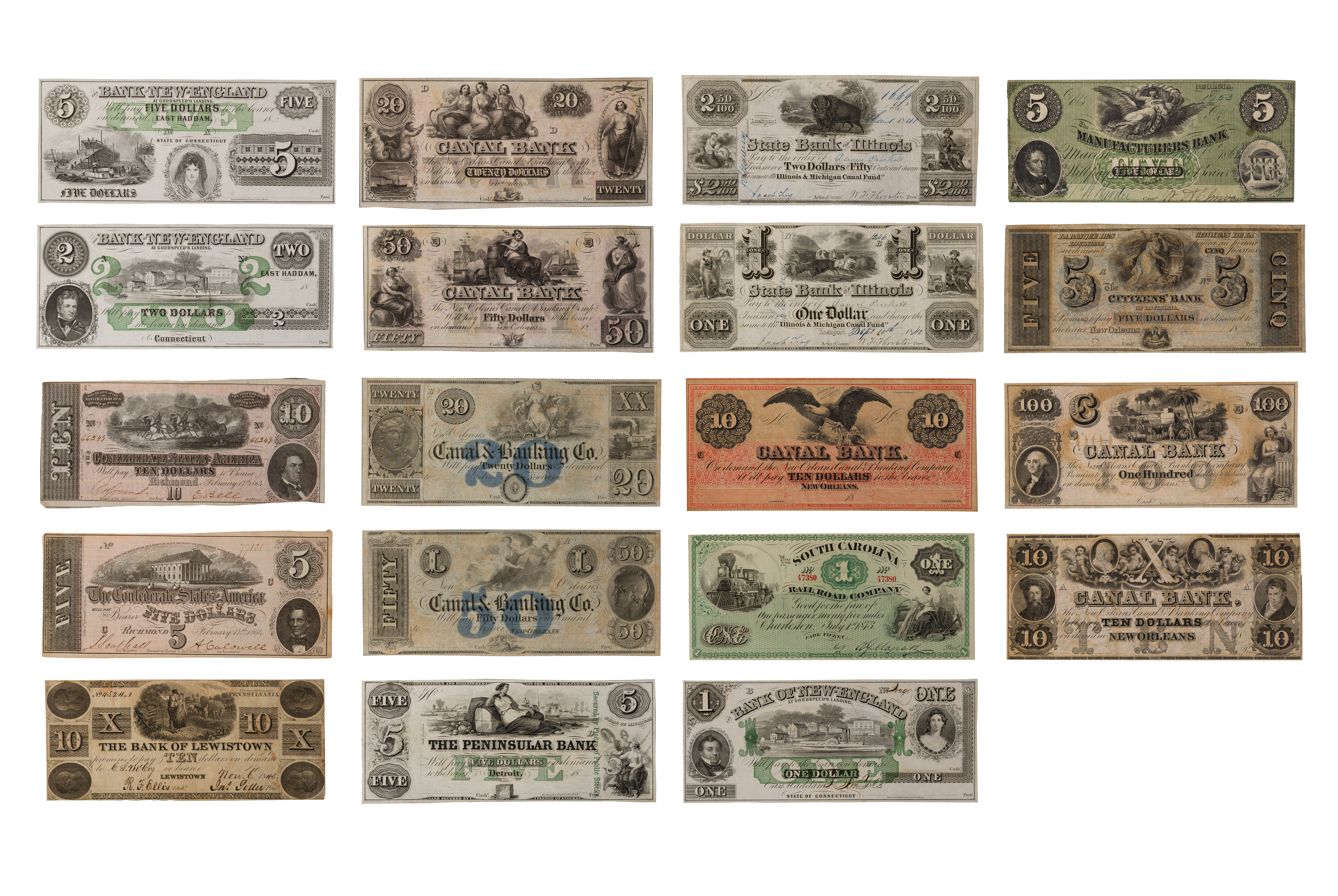 (19) banknotes from various regions including New England, Lewistown PA, the Confederate States, Canal Bank of New Orleans, South Carolina and Illinois, in plastic sleeves