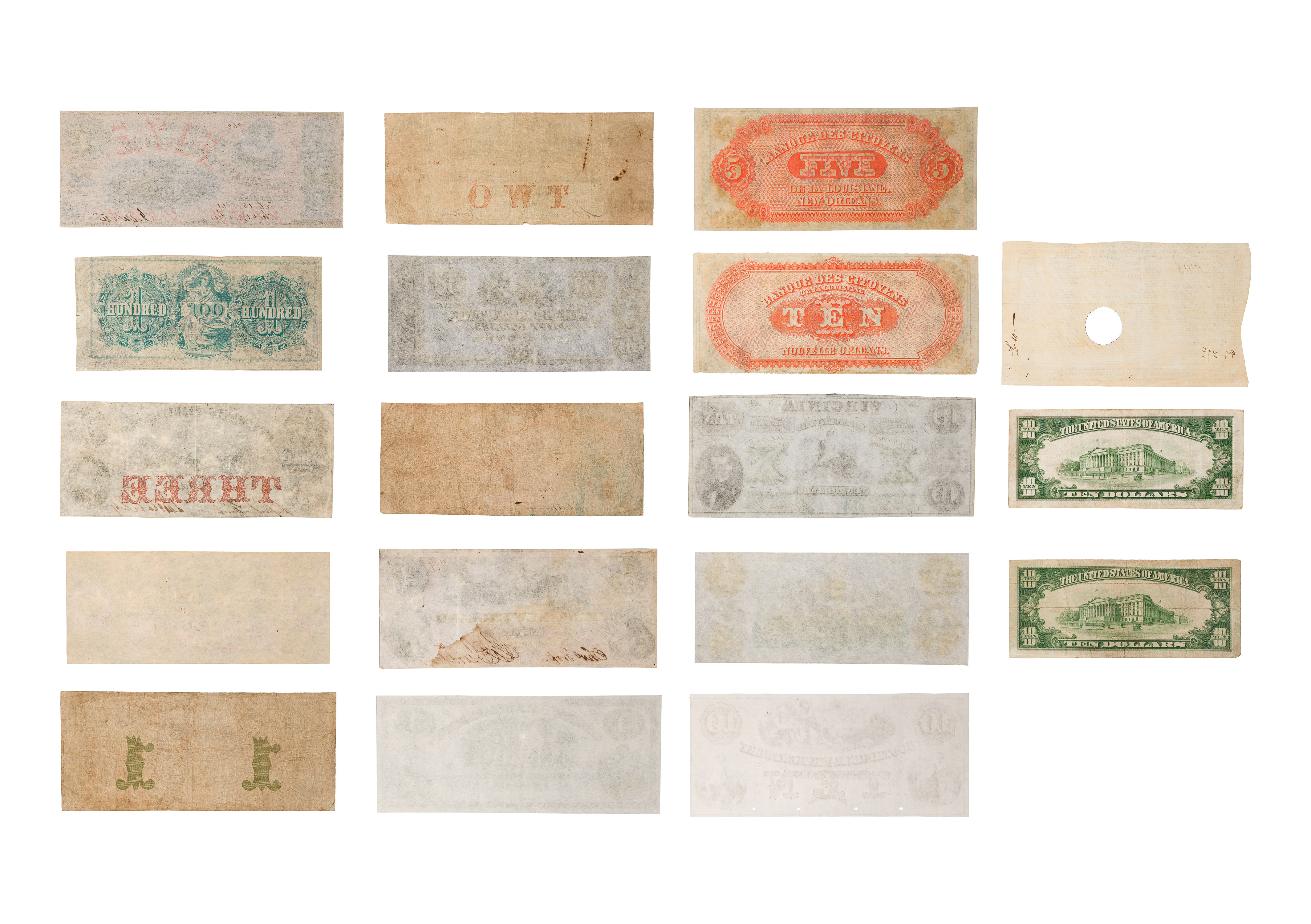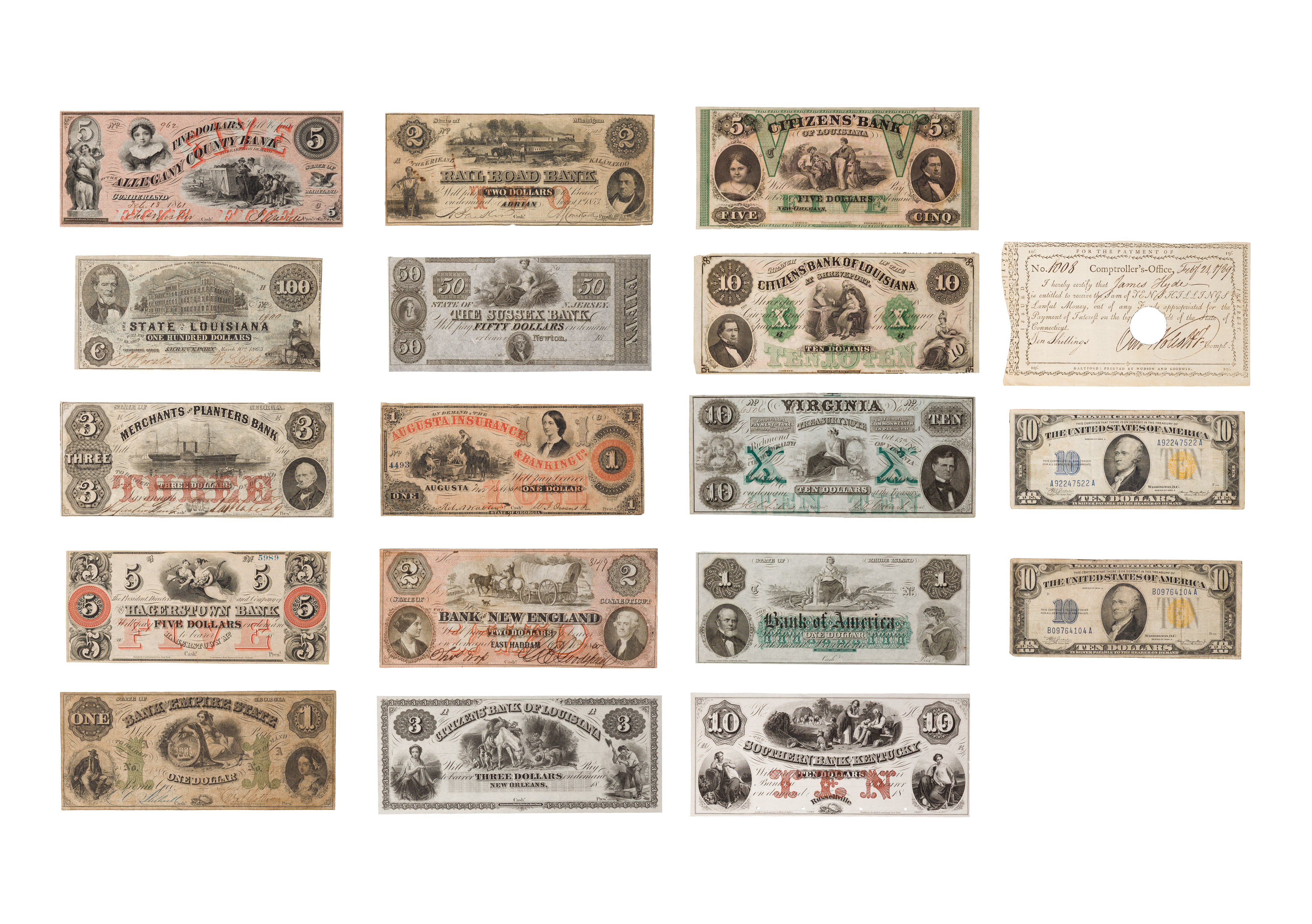 (18) banknotes including (6) notes from banks including Bank Of America, Virginia, Louisiana, New Jersey, New England, Rail Road as well as (2) series 1934A blue seal $10 silver certificates, in plastic sleeves