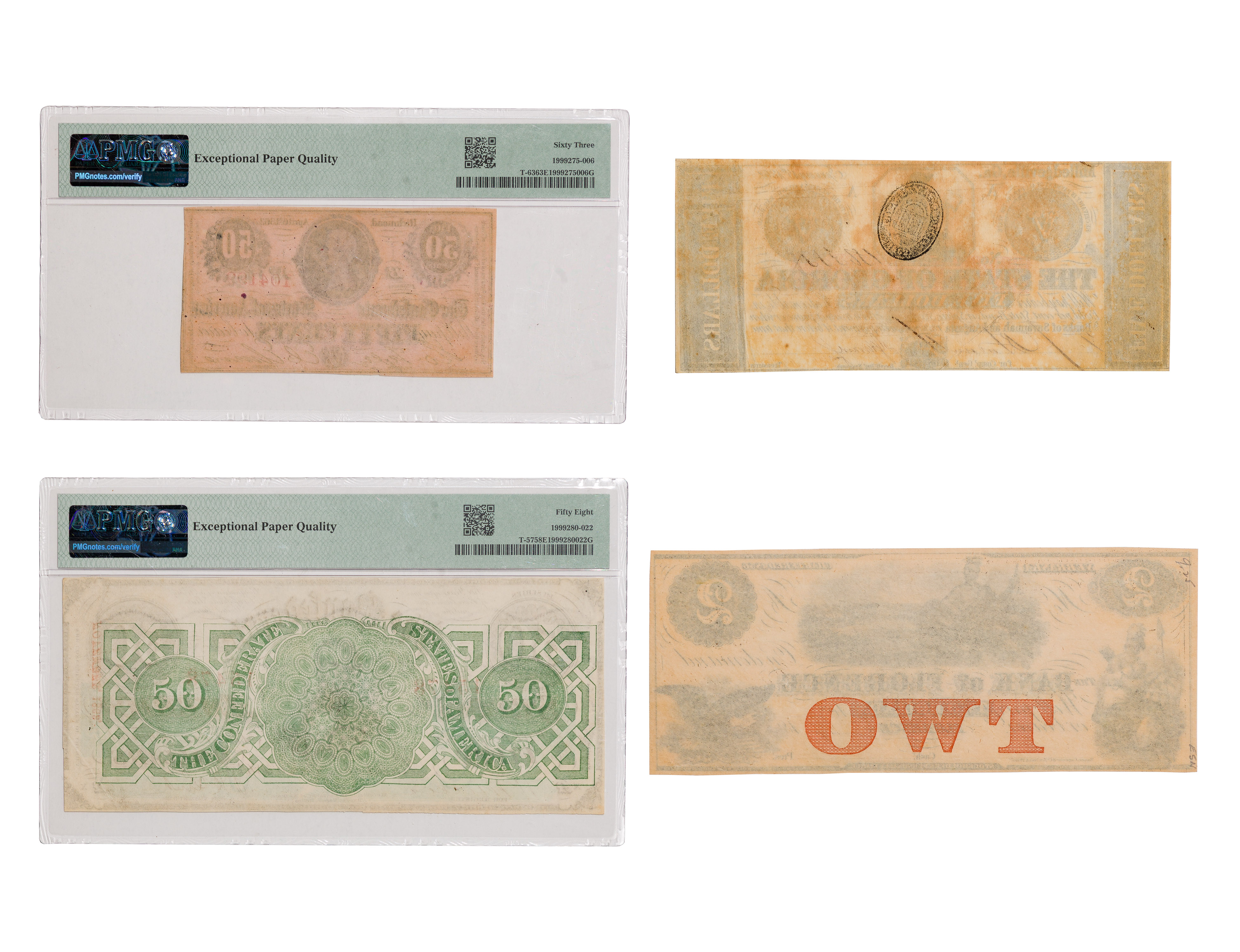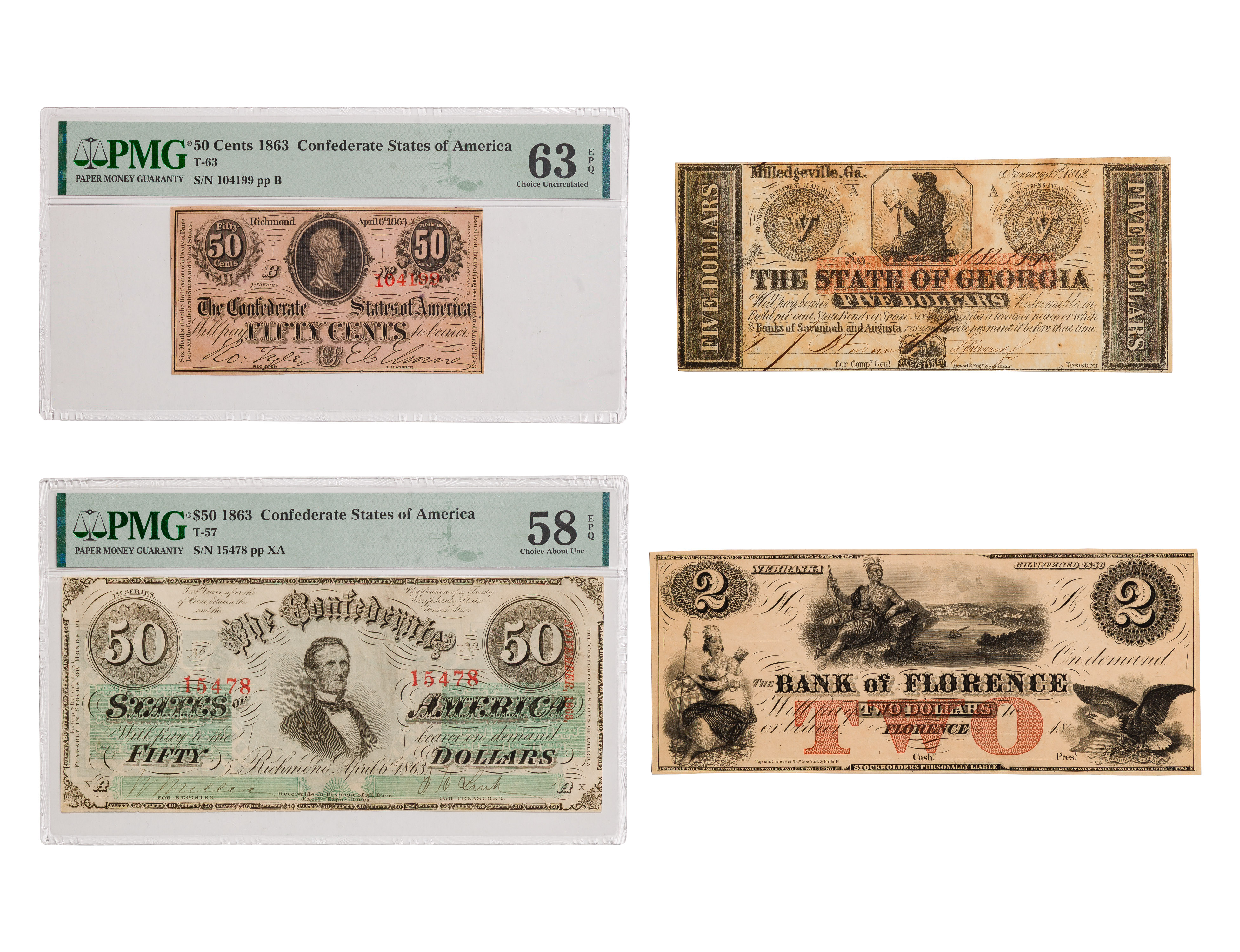 (4) items including 1863 Confederate States of America including a 50C, T63 #S / N 104199ppB PMG and a $50 T57, #S / N 1547ppXA PMG, both having PMG holograms as well as a Nebraska Bank of Florence $2 note and a State of Georgia $5 note, stored in plastic sleeves