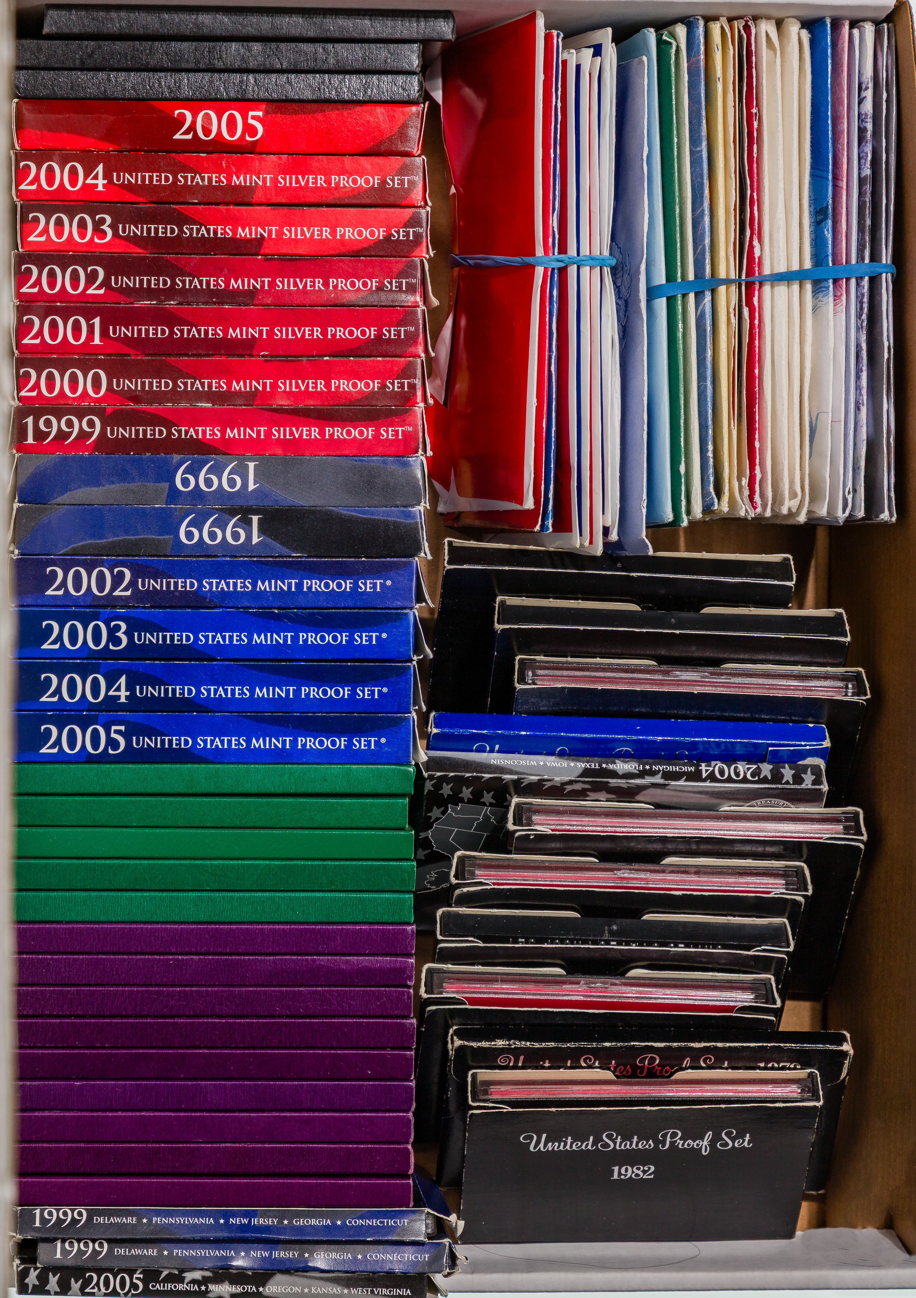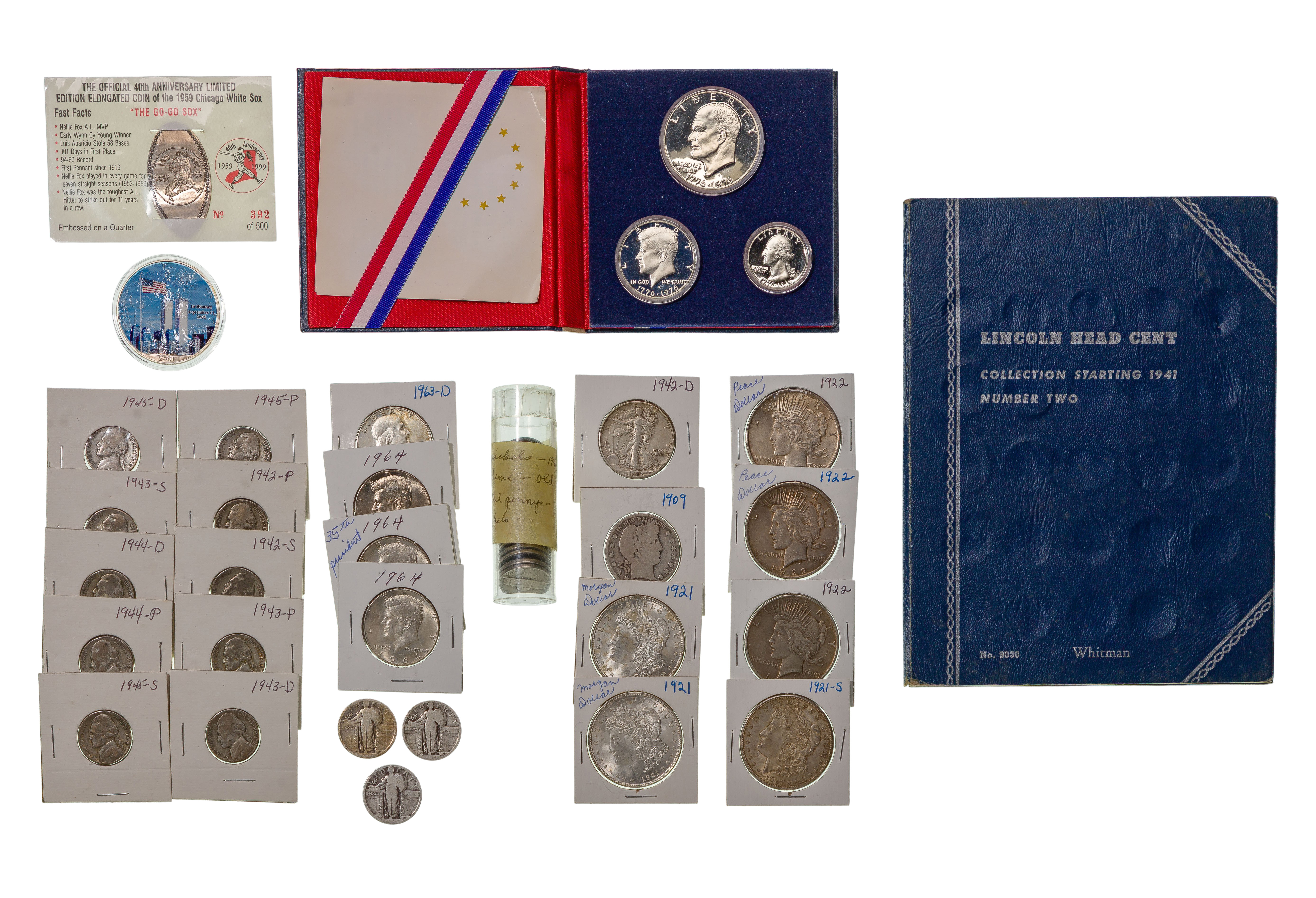 $9.25 face US 90% silver including (3) Morgan $1, (3) Peace $1, a 1909 Barber 50c, a 1942-D Walking Liberty 50c, a 1963-D Franklin 50c, (3) Kennedy 50c, (3) Standing Liberty 25c and (2) Roosevelt 10c as well as (12) war nickels, (3) Buffalo 5c, (6) Jefferson 5c, (2) Indian 1c, a partial wheat 1c album and (5) wheat 1c, proof sets including 1979, (4) 1981, (4) 1982, 1983, 1984-1998, (2) 1999 and 2002 to 2005, mint silver proof silver sets including 1992 to 1994, (2) 1996, 1999 to 2005, uncirculated sets including 1980, (3) 1981, 1987, 1988, 1990-1994, 1997, 1998, (2) 1999, (3) 2001, 2002, (2) 2003 and (2) 2004, a 1999 Susan B. Anthony uncirculated set, state quarter sets including (2) 1999, 2004 and 2005, a 2001 September 11th commemorative, a 1976 silver bicentennial proof set and a 1999 Chicago White Sox 40th anniversary commemorative elongated coin
