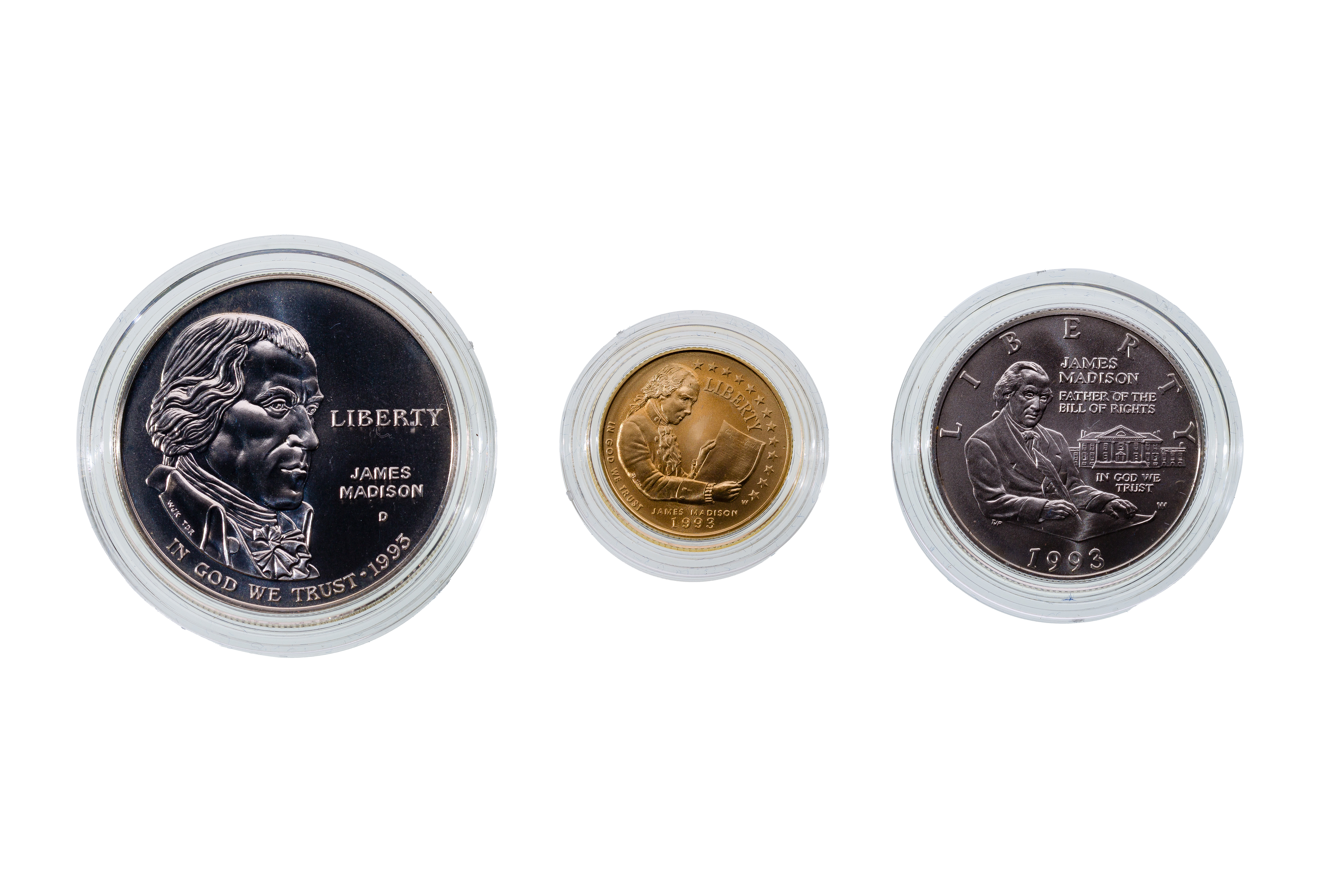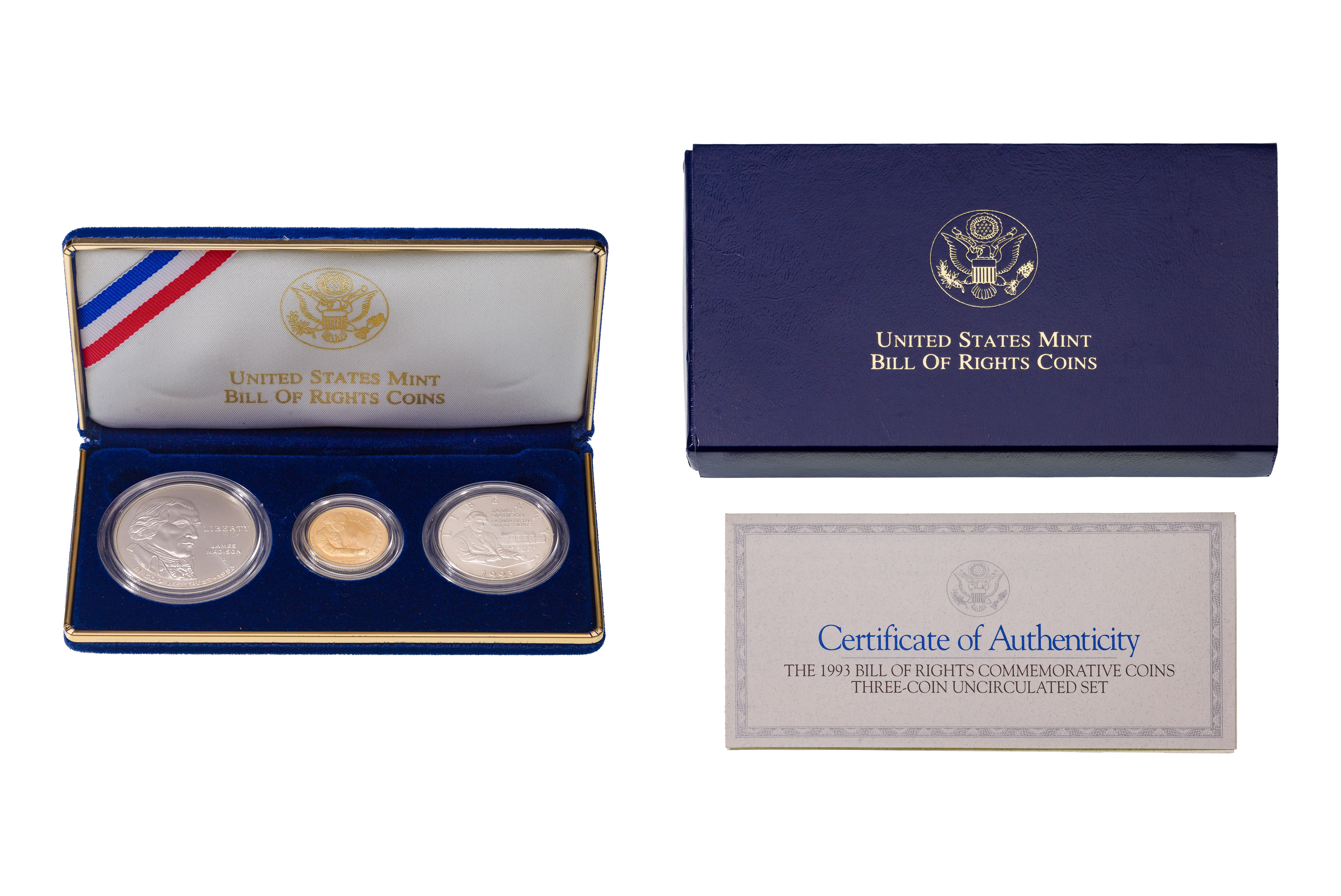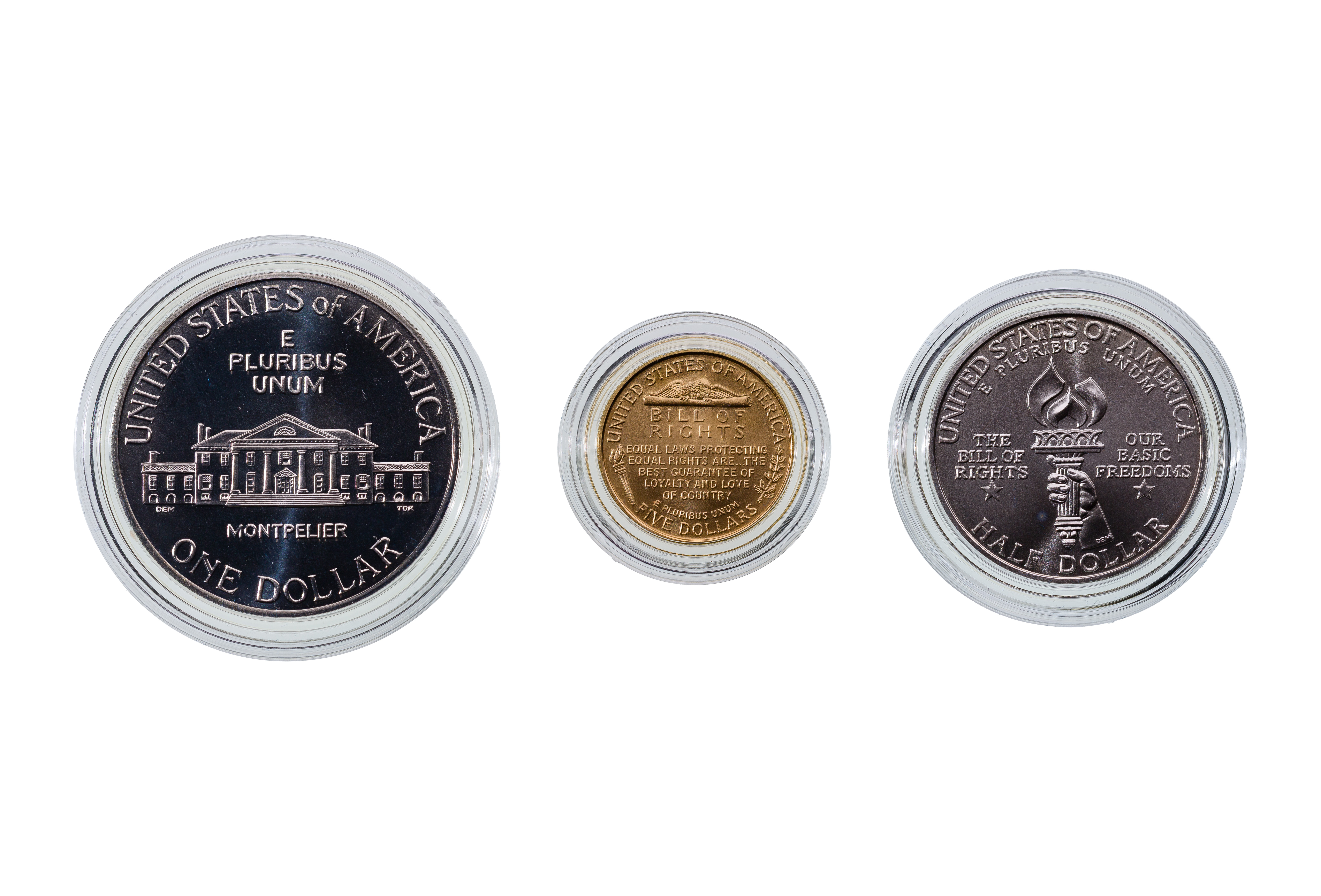 Three-piece set including a gold $5, a silver $1 and a silver 50c, having original packaging and paperwork