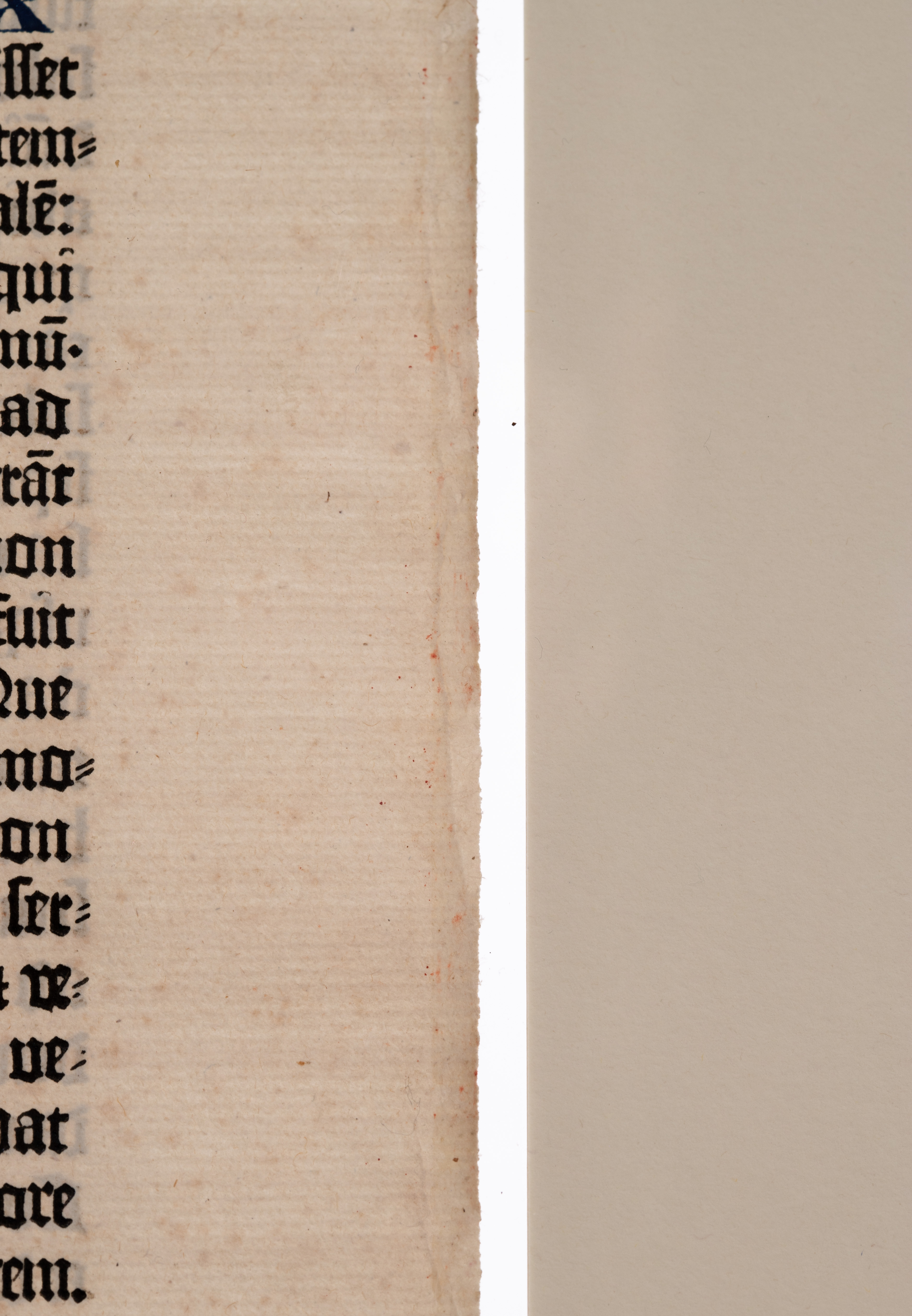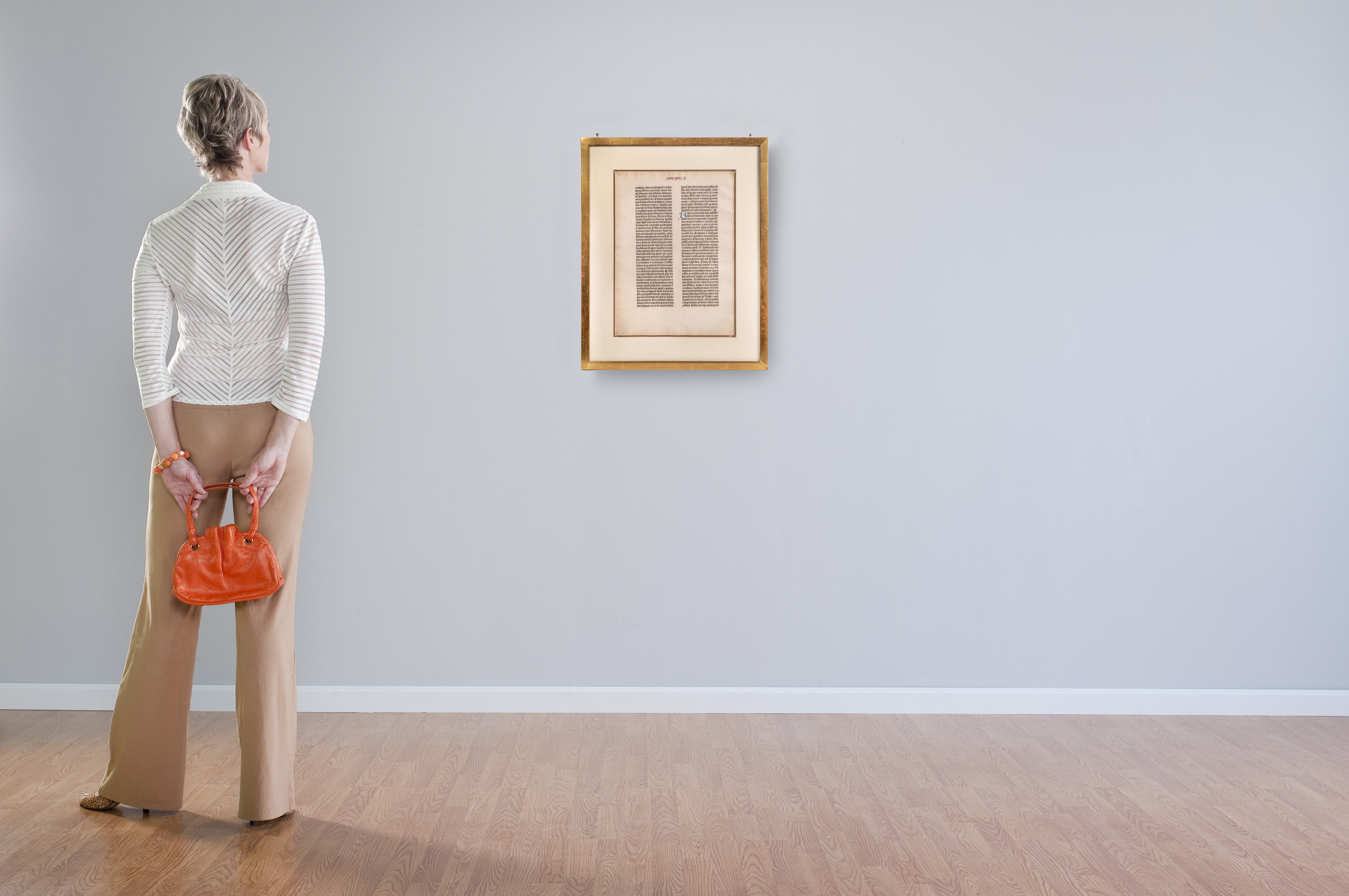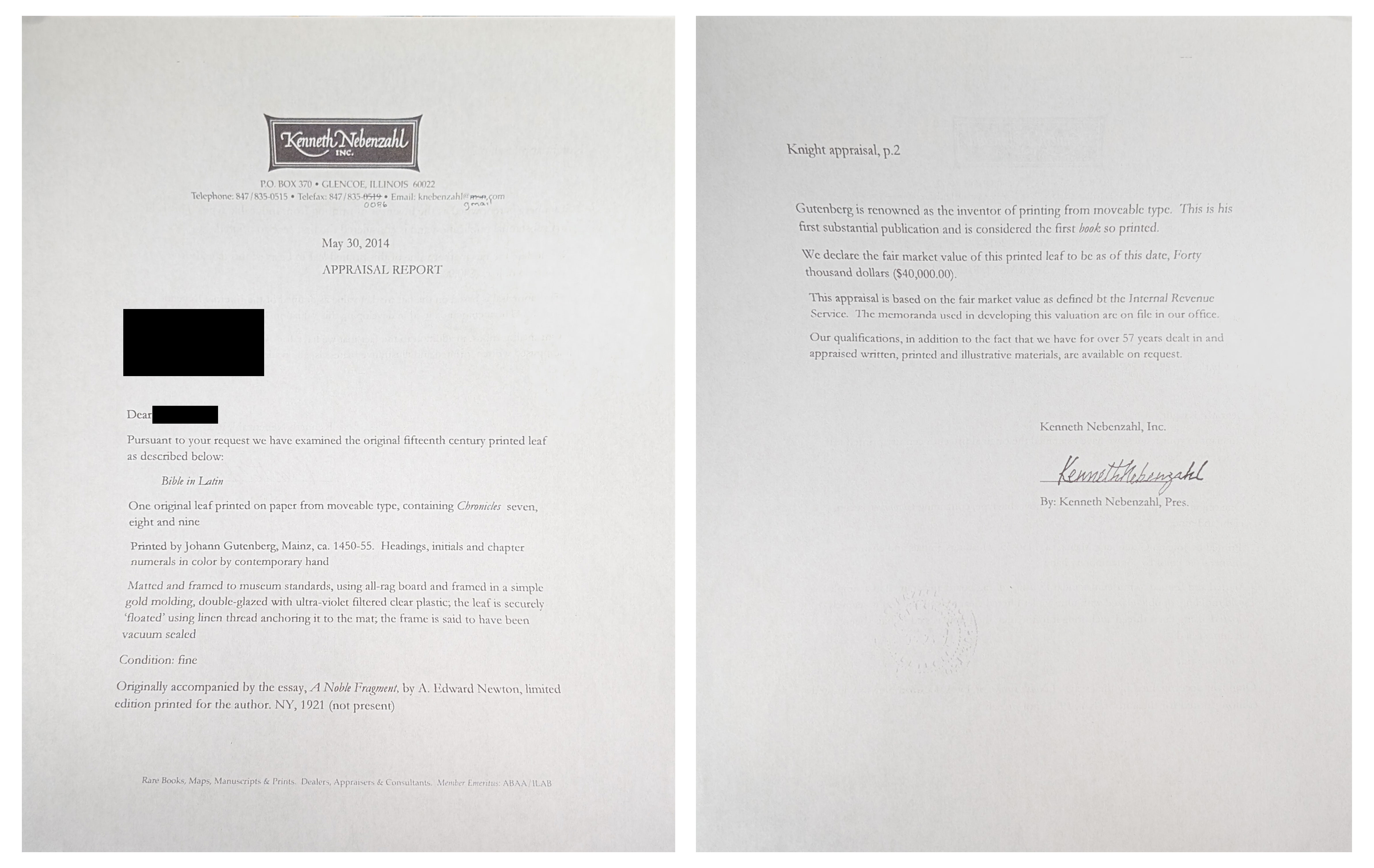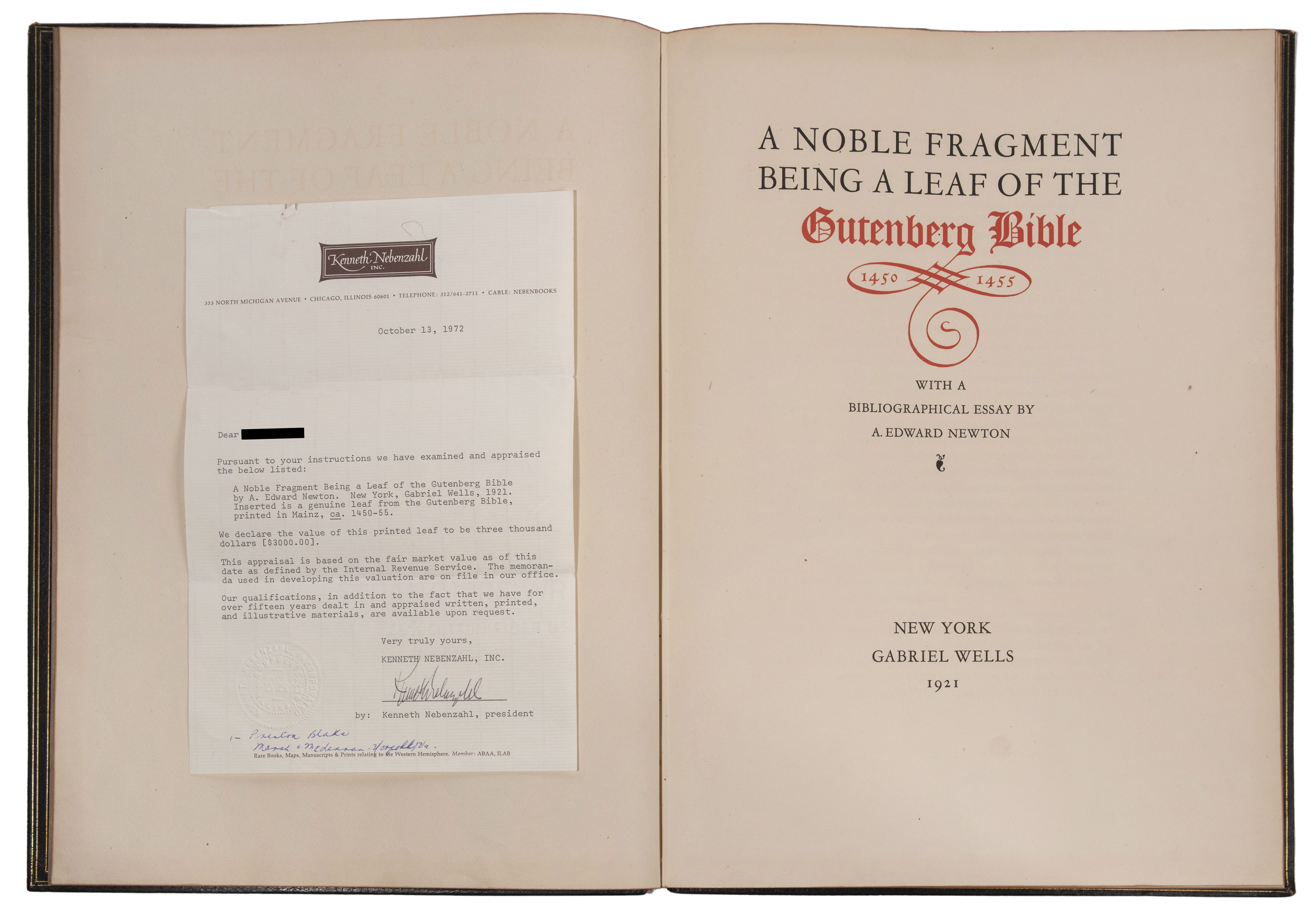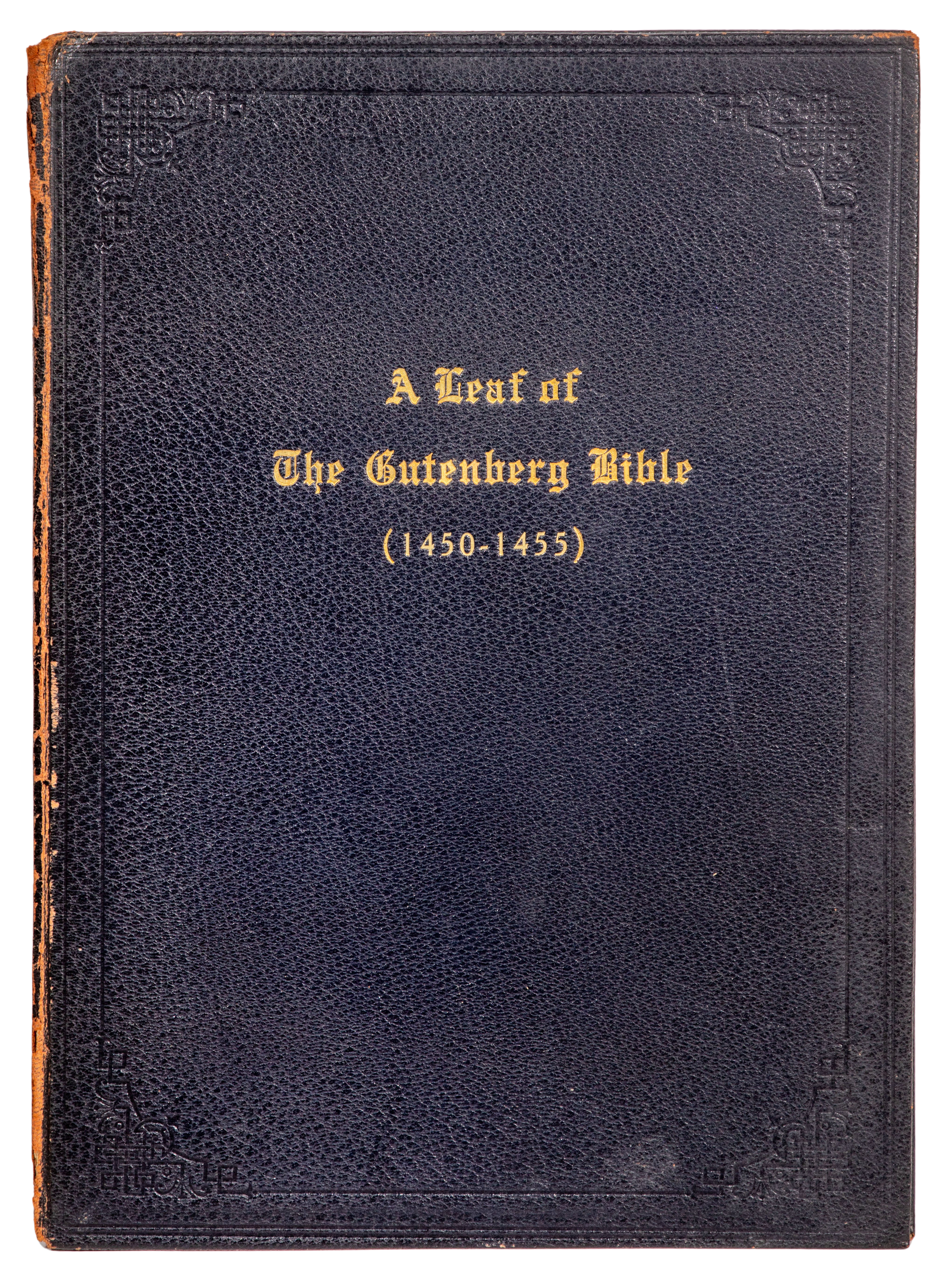 1450-1455, mounted floating in a double-sided gilt wood frame under acrylic, with archival materials and said to have argon gas sealed within, together with leather folio containing ‘A Noble Leaf’ essay by A. Edward Newton, published by Gabriel Wells, New York, 1921 and appraisals by Kenneth Nebenzahl from 1972 and 2014