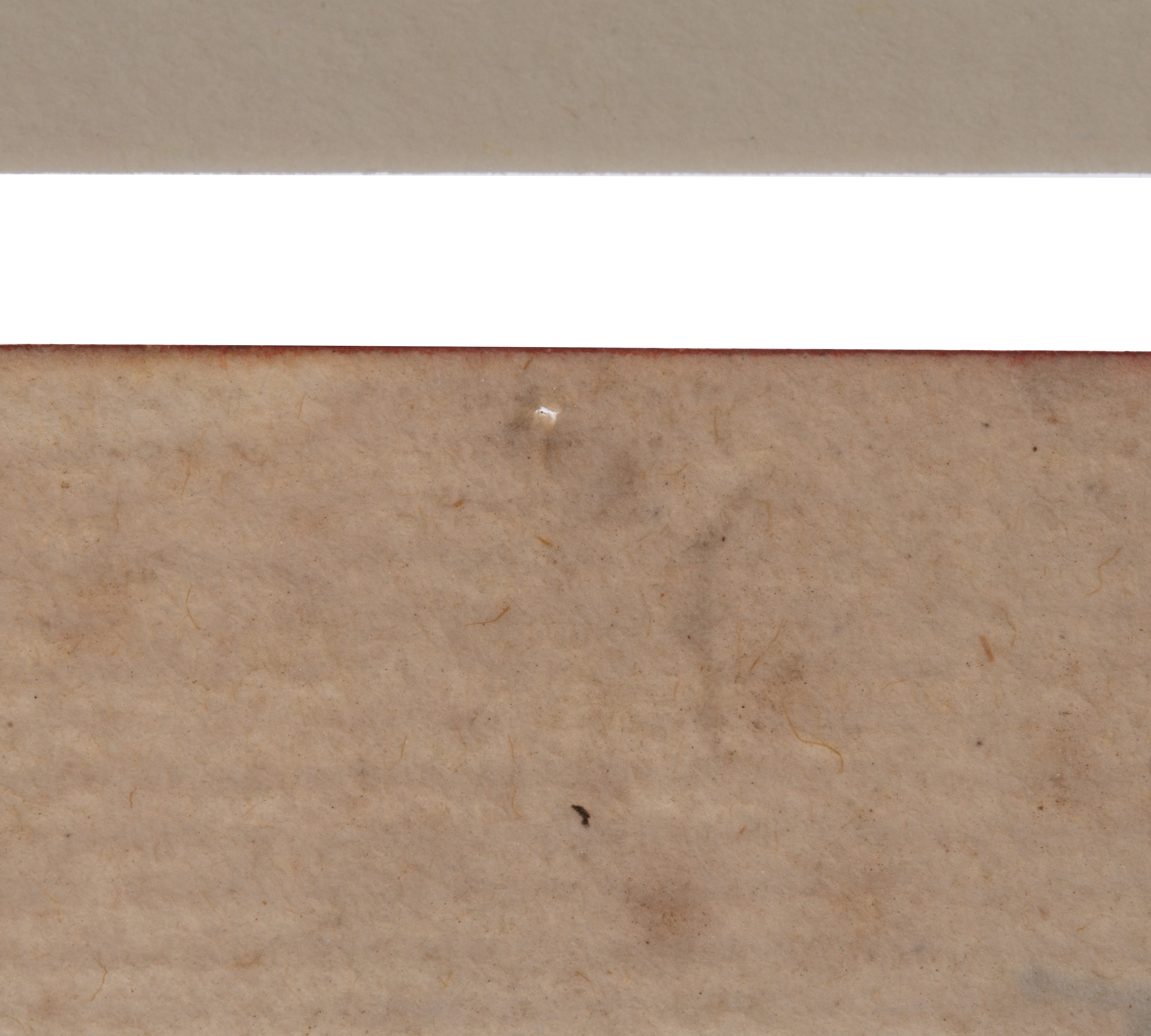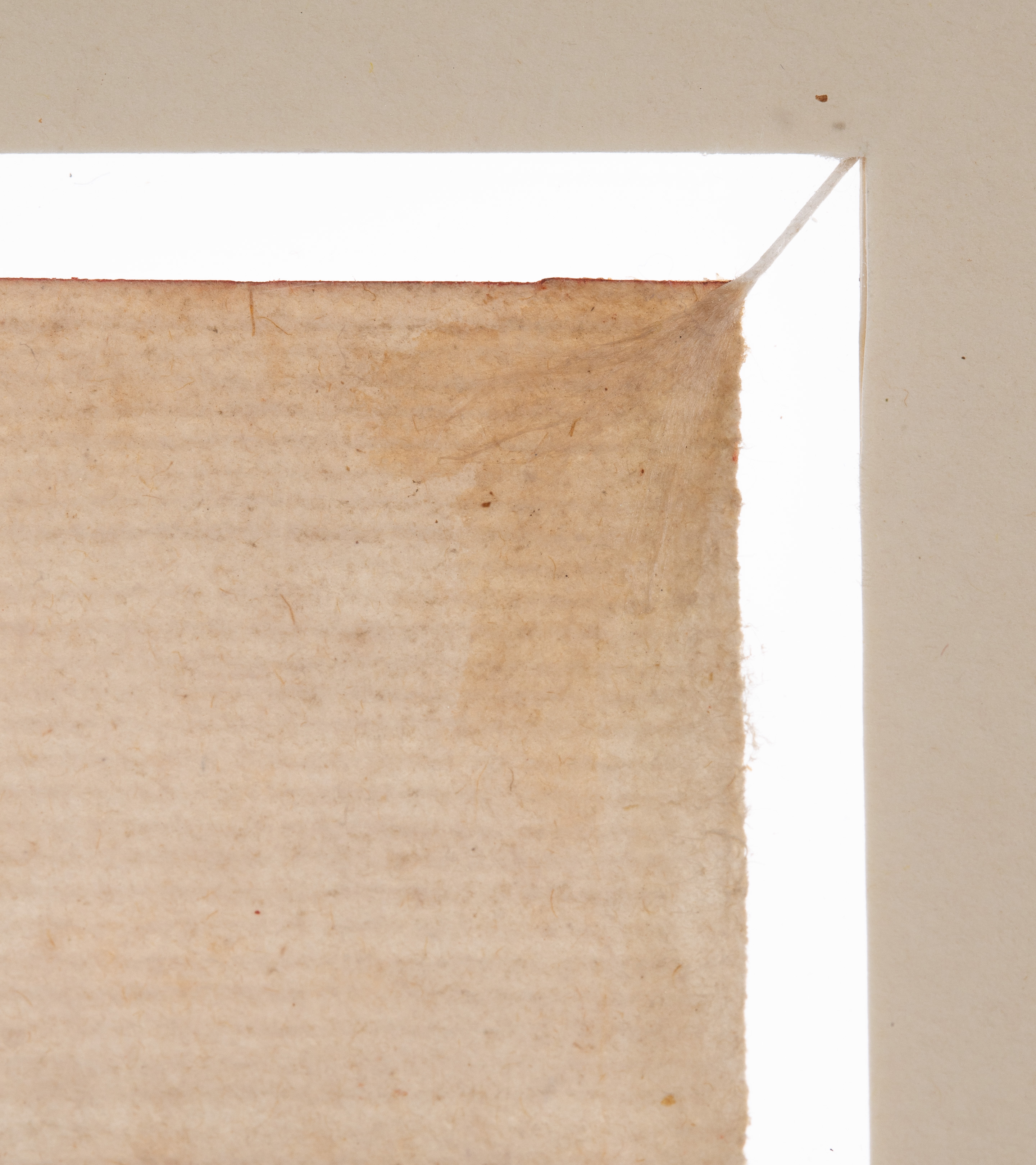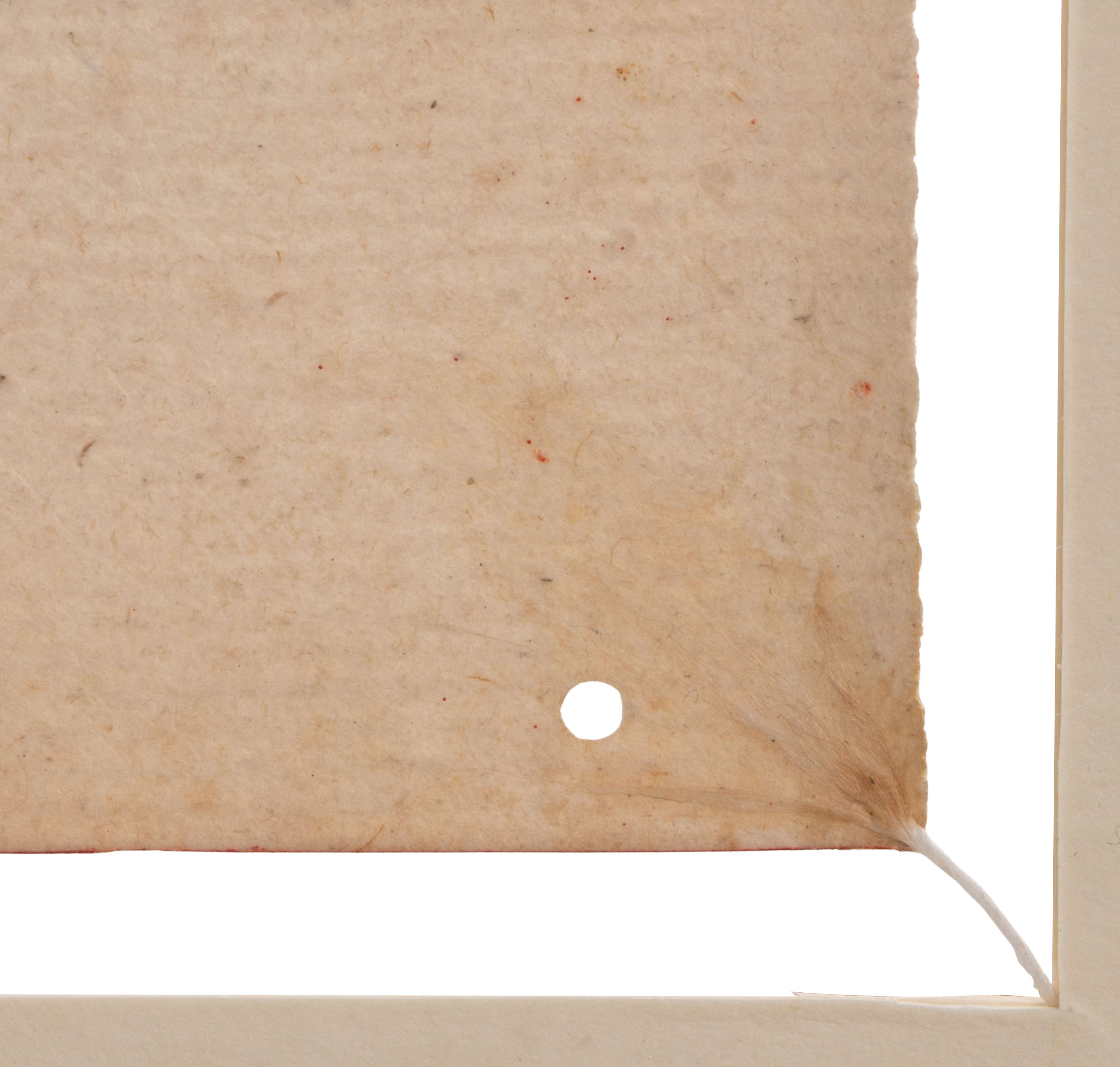 leaf lightly toned at edges, a worm hole and a spot of discoloration lower right of recto, very light incipient foxing throughout, slight discoloration at corners, verso, where mounting threads attach, a pencil mark between the columns of type verso, frame having light wear