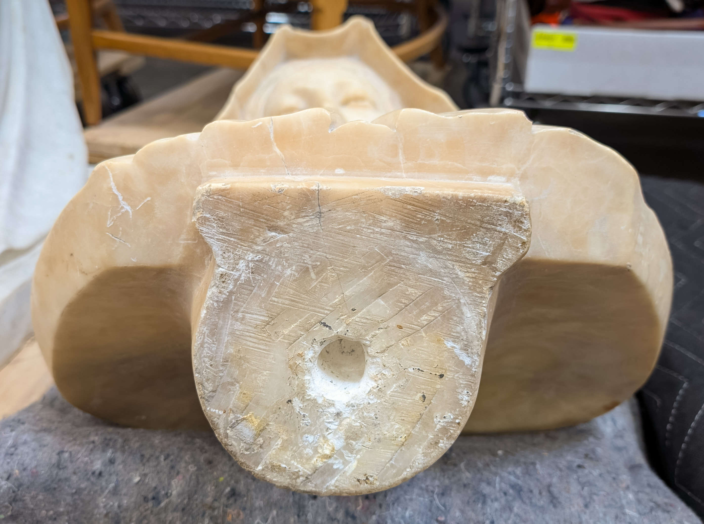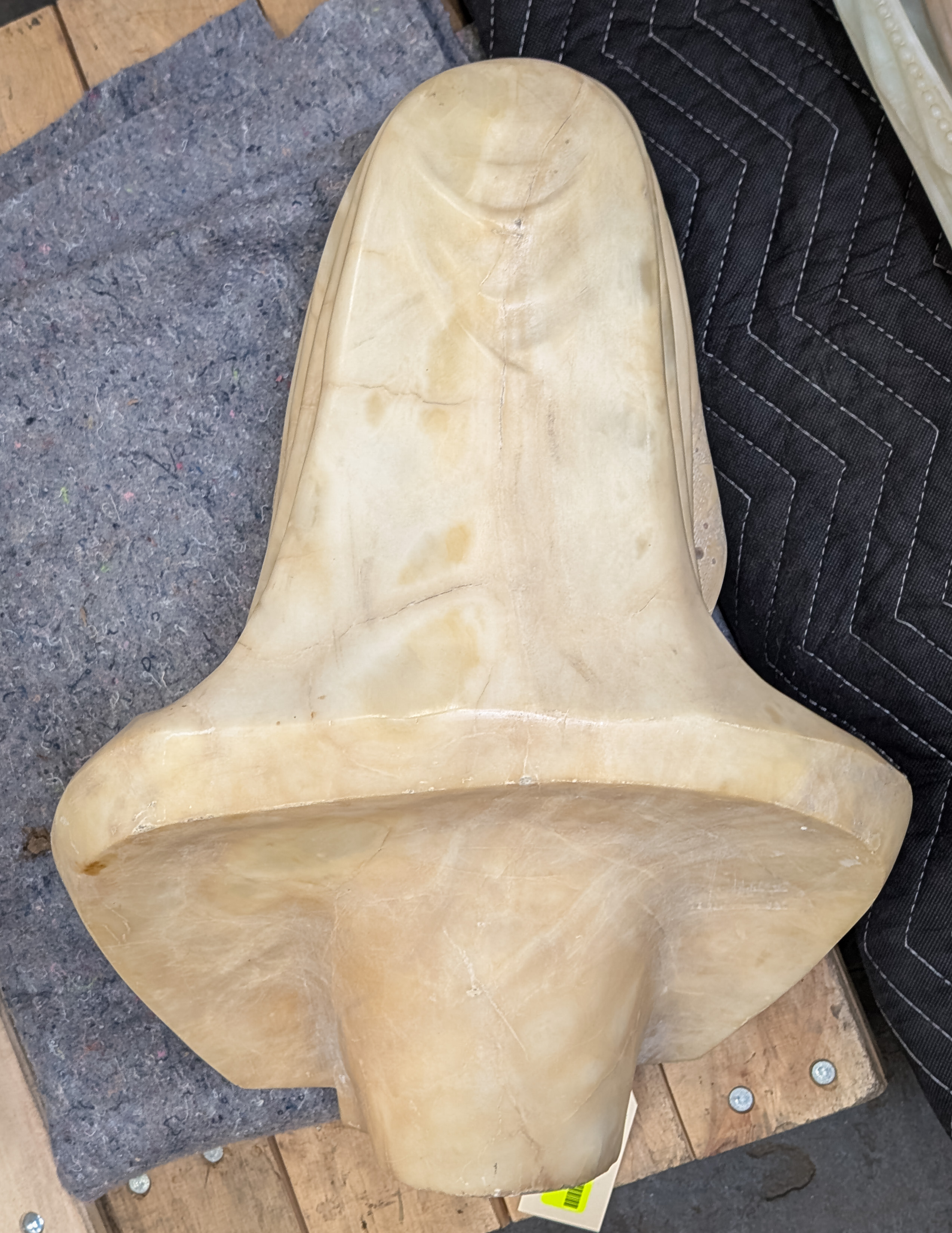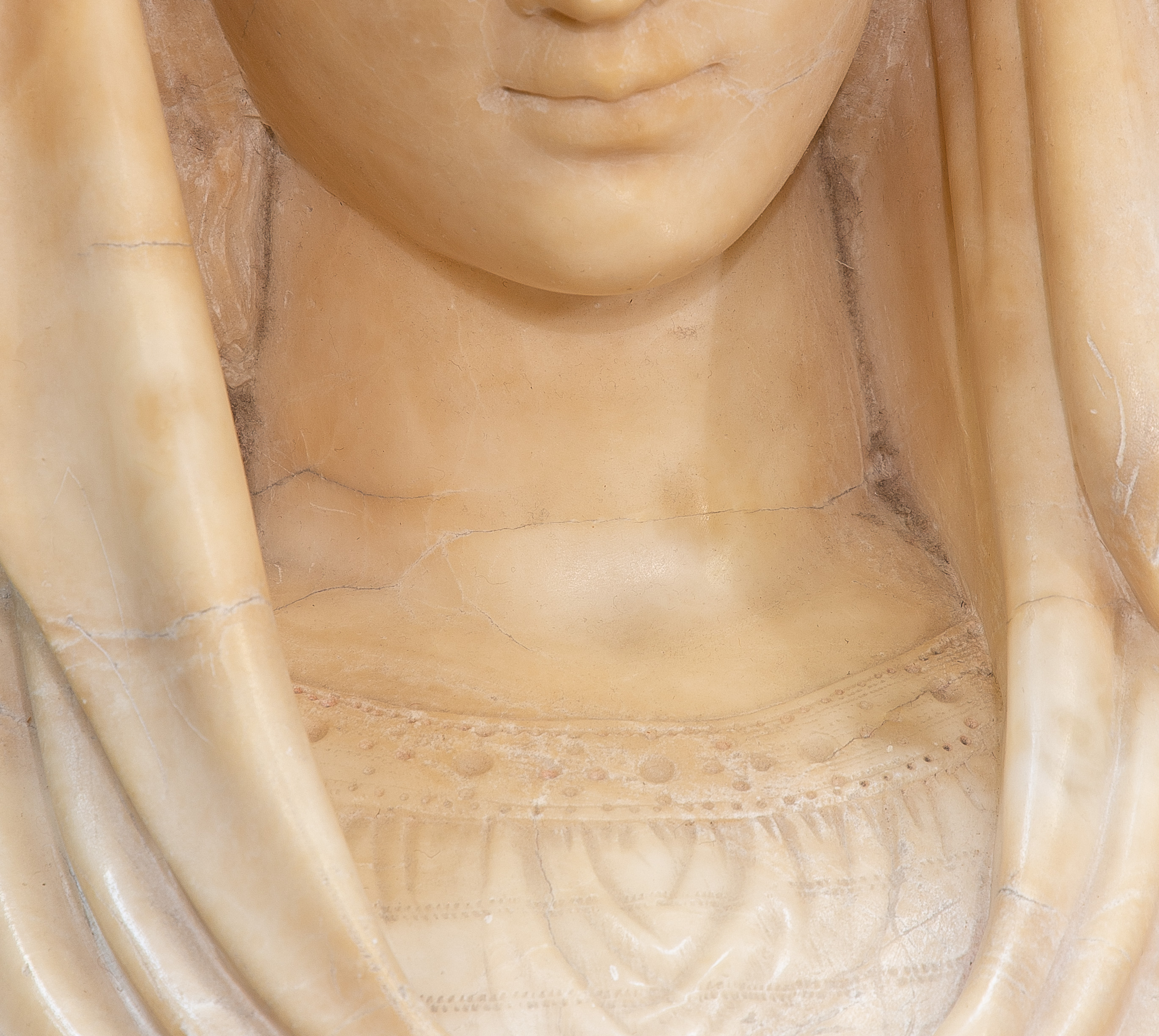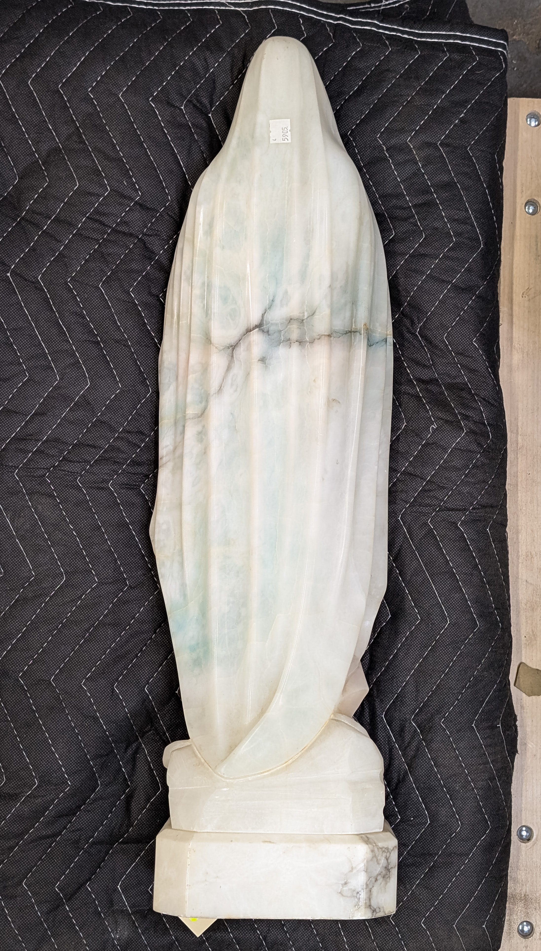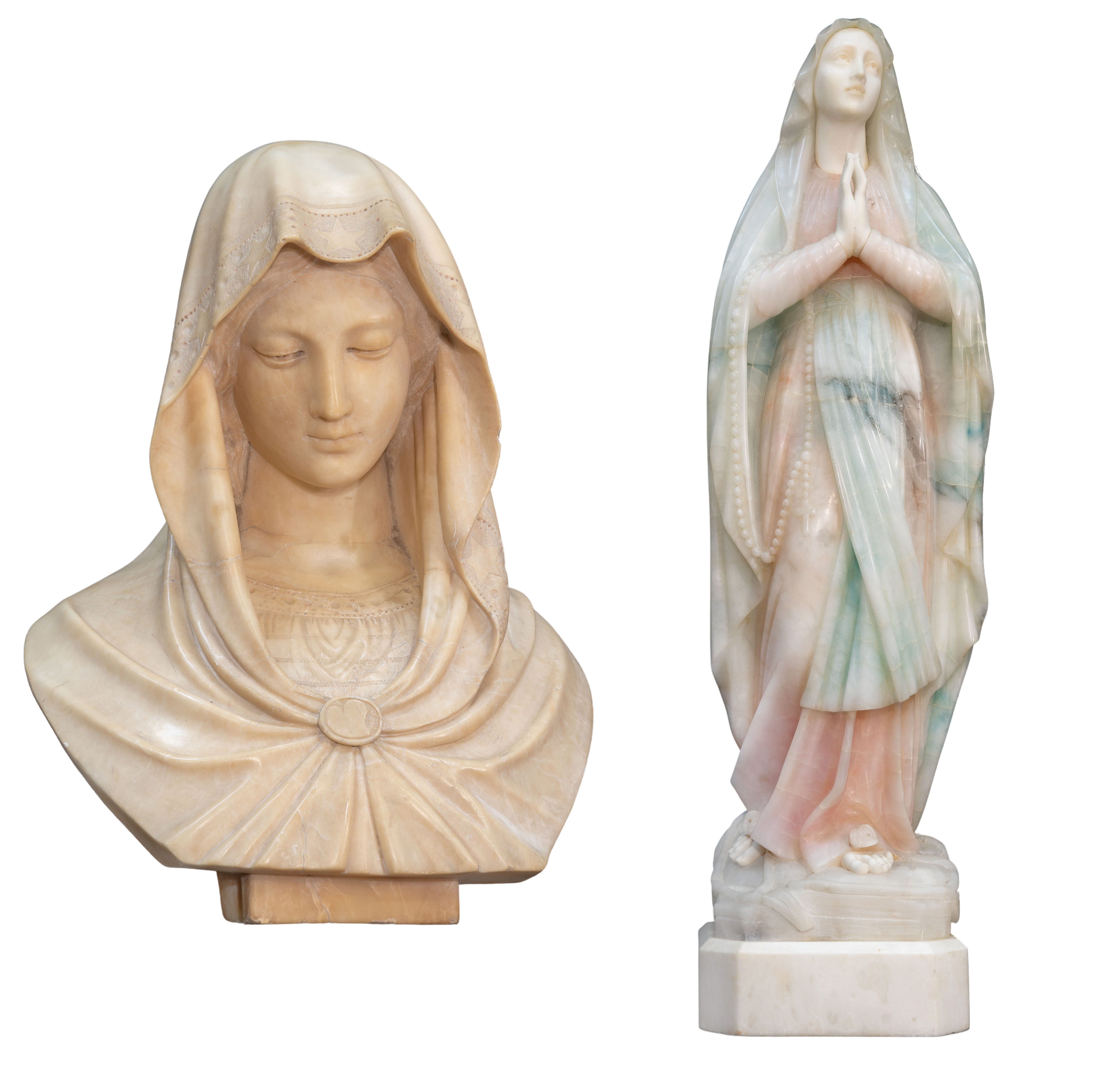 (2) items, both representing a depiction of the Virgin Mary, including a marble bust and a color enhanced alabaster full length having praying hands and rosary