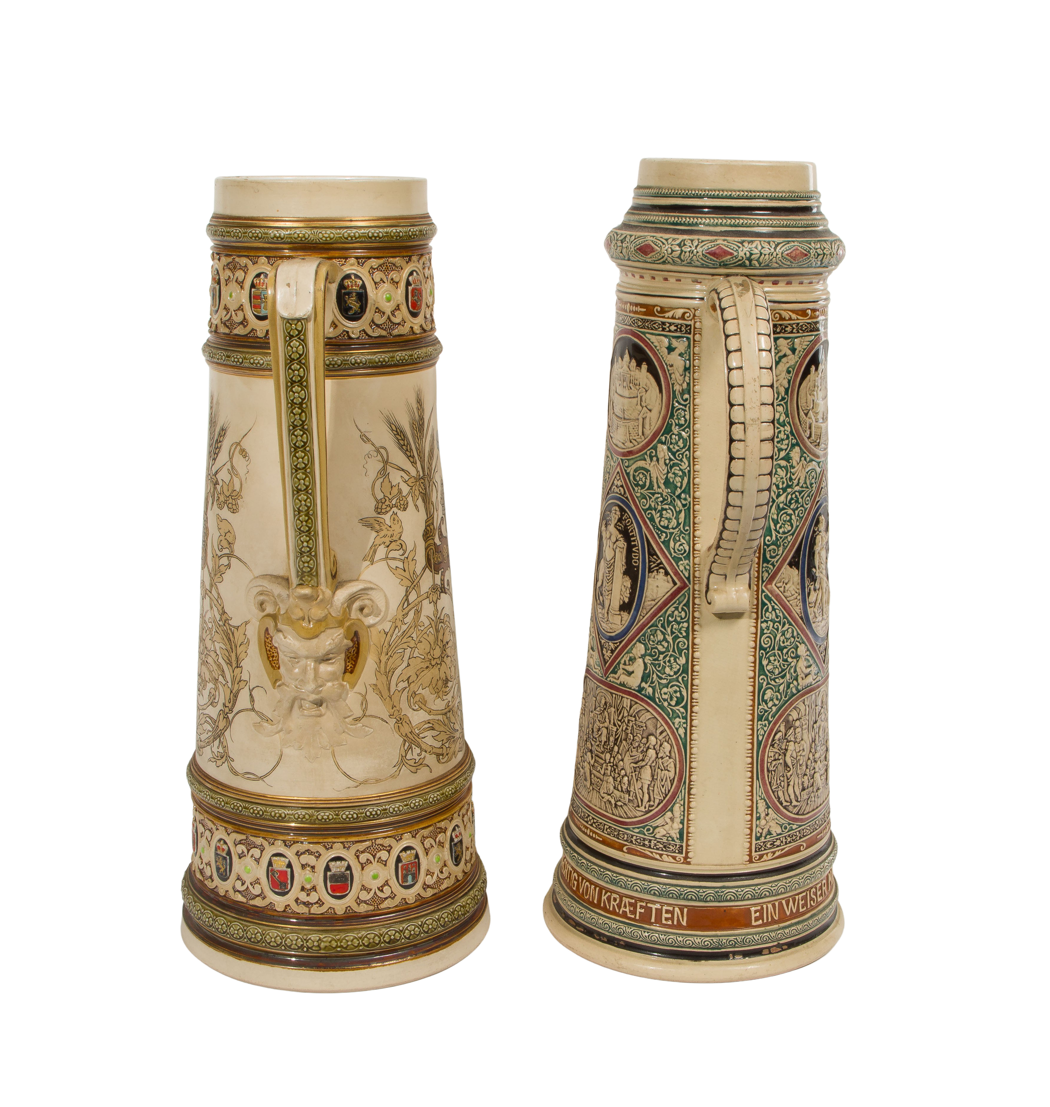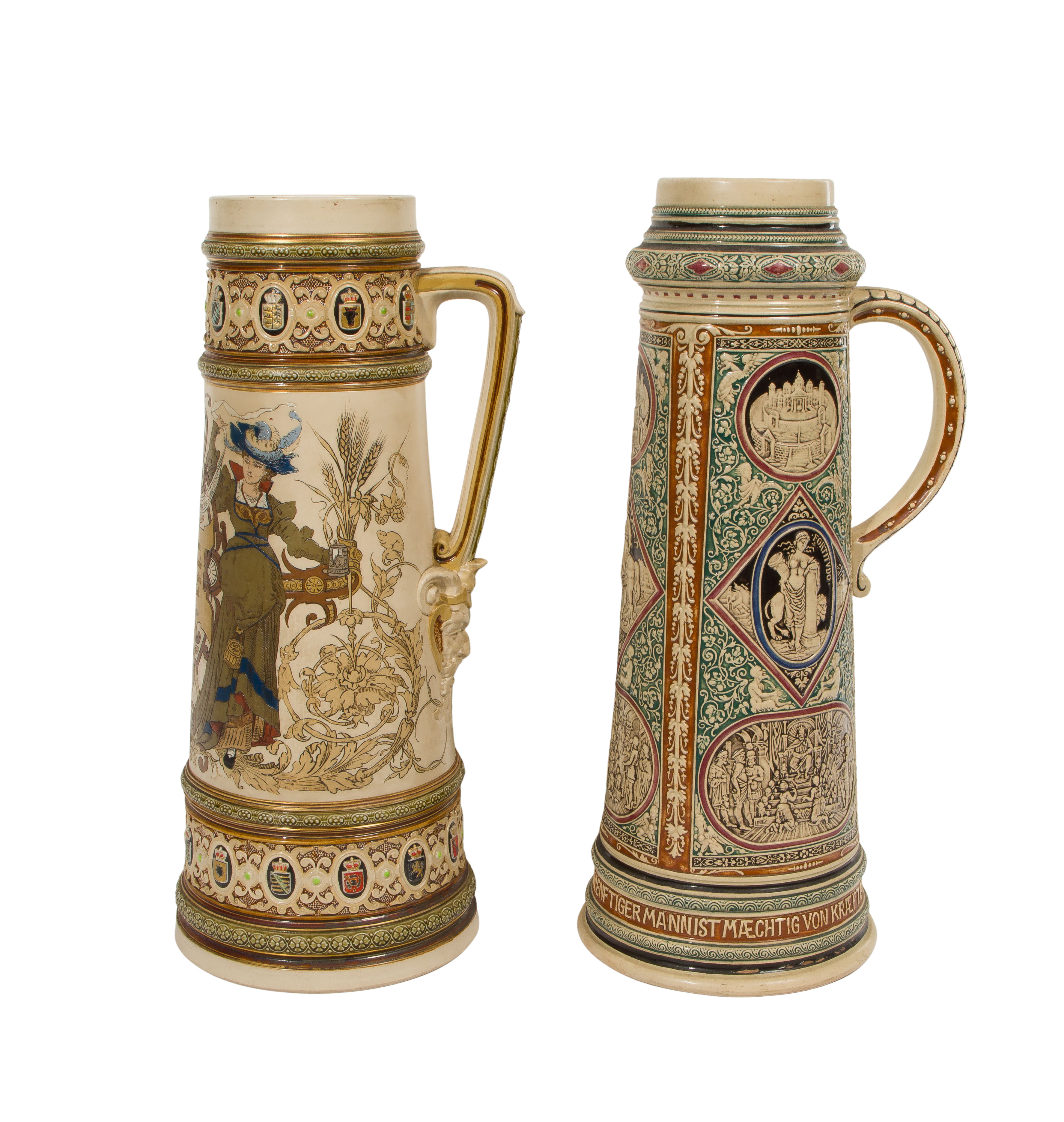 (2) total items including a seven liter Mettlach with stamped maker mark to the underside, depicting two figures; together with a German seven liter stein marked ‘355’ on the underside