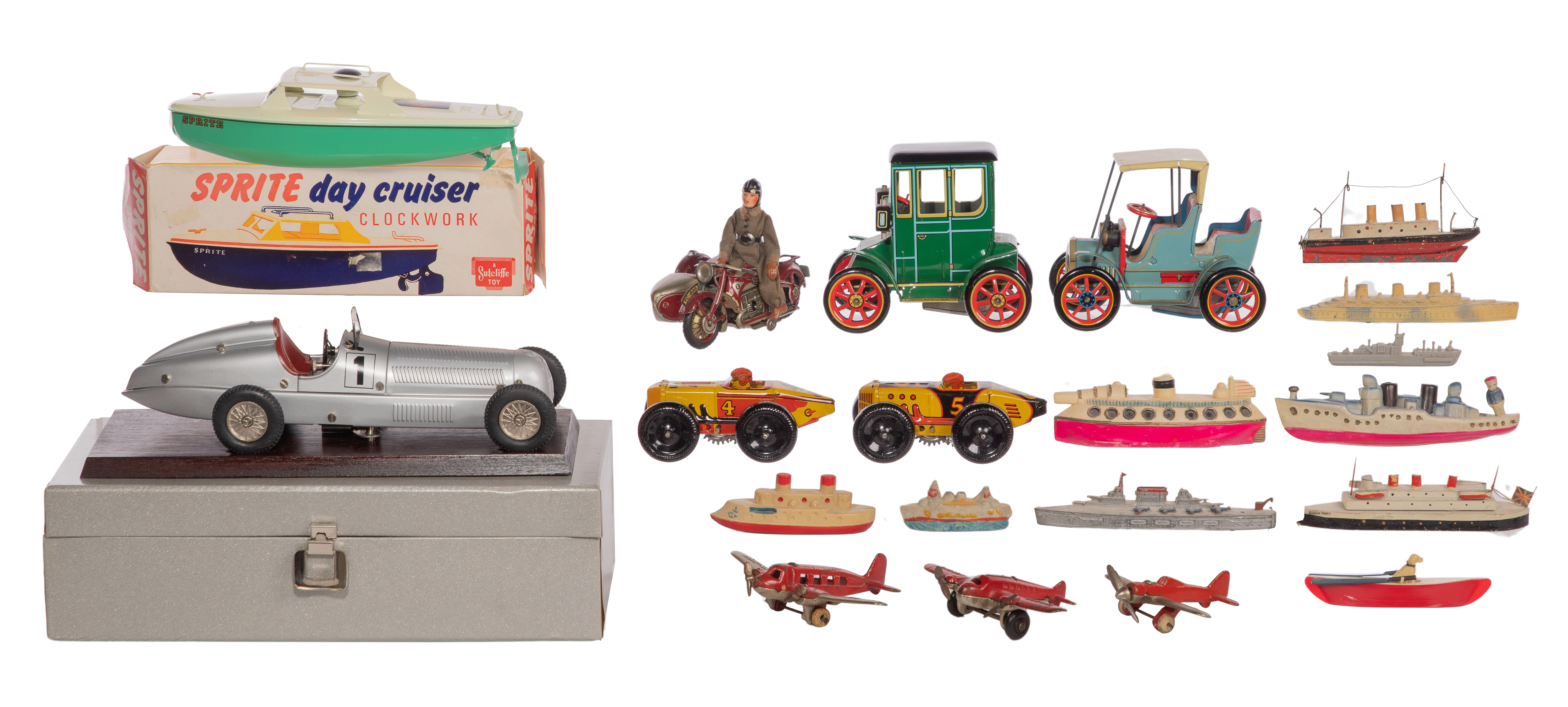 (19) total items including a pre-war German Tippco TC 698 motorcycle having detachable sidecar and rider, (2) Marx race cars (#4 and #5) and (2) Japanese Modern Toys lever action cars, all of tin litho as well as injection molded plastic bodied Marklin #1097 Mercedes-Benz W25 Silver Arrow race car having wood display base and key (still attached to base) in the original fitted box and a Sutcliffe Sprite Day Cruiser boat having key and original box; together with (9) model boats including die-cast and blow molded as well as (3) die-cast planes