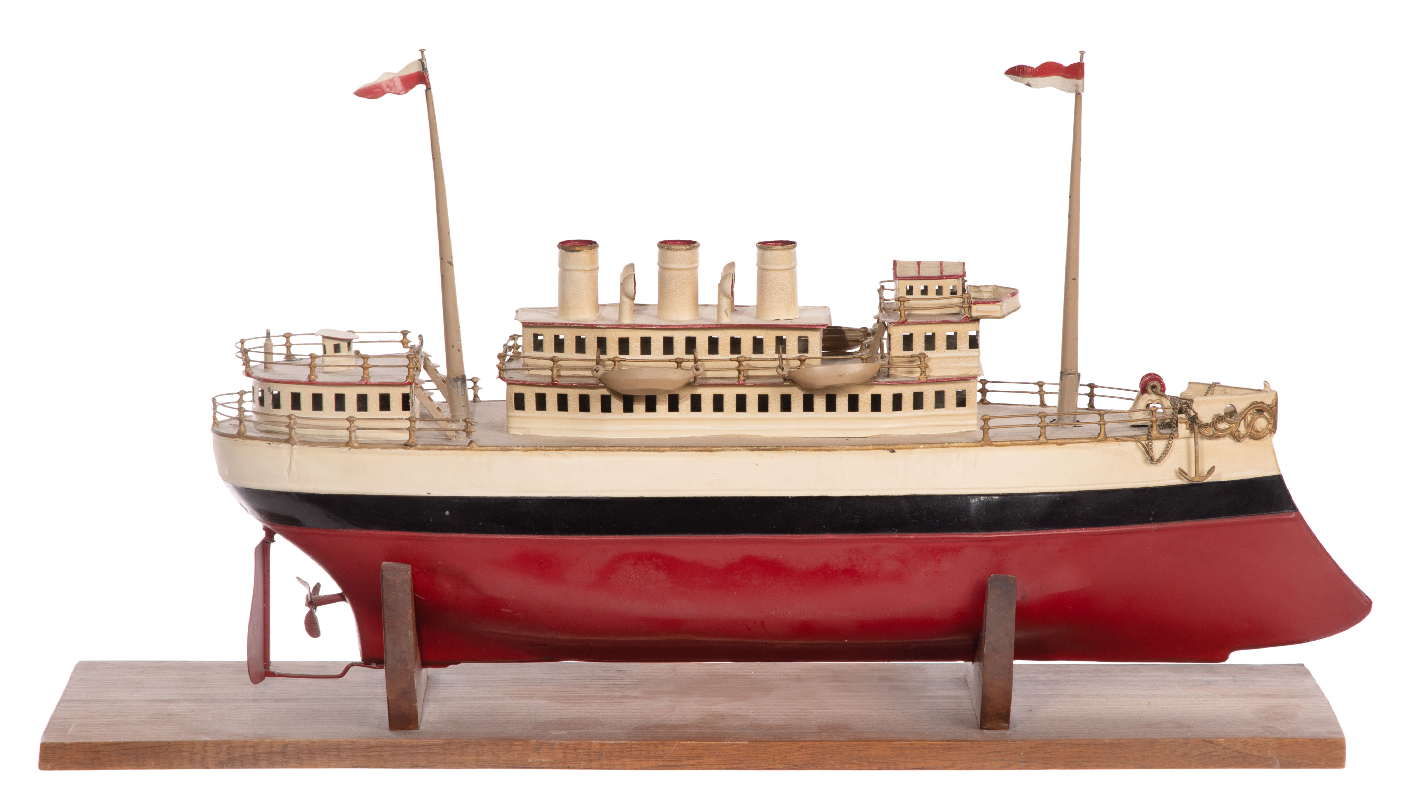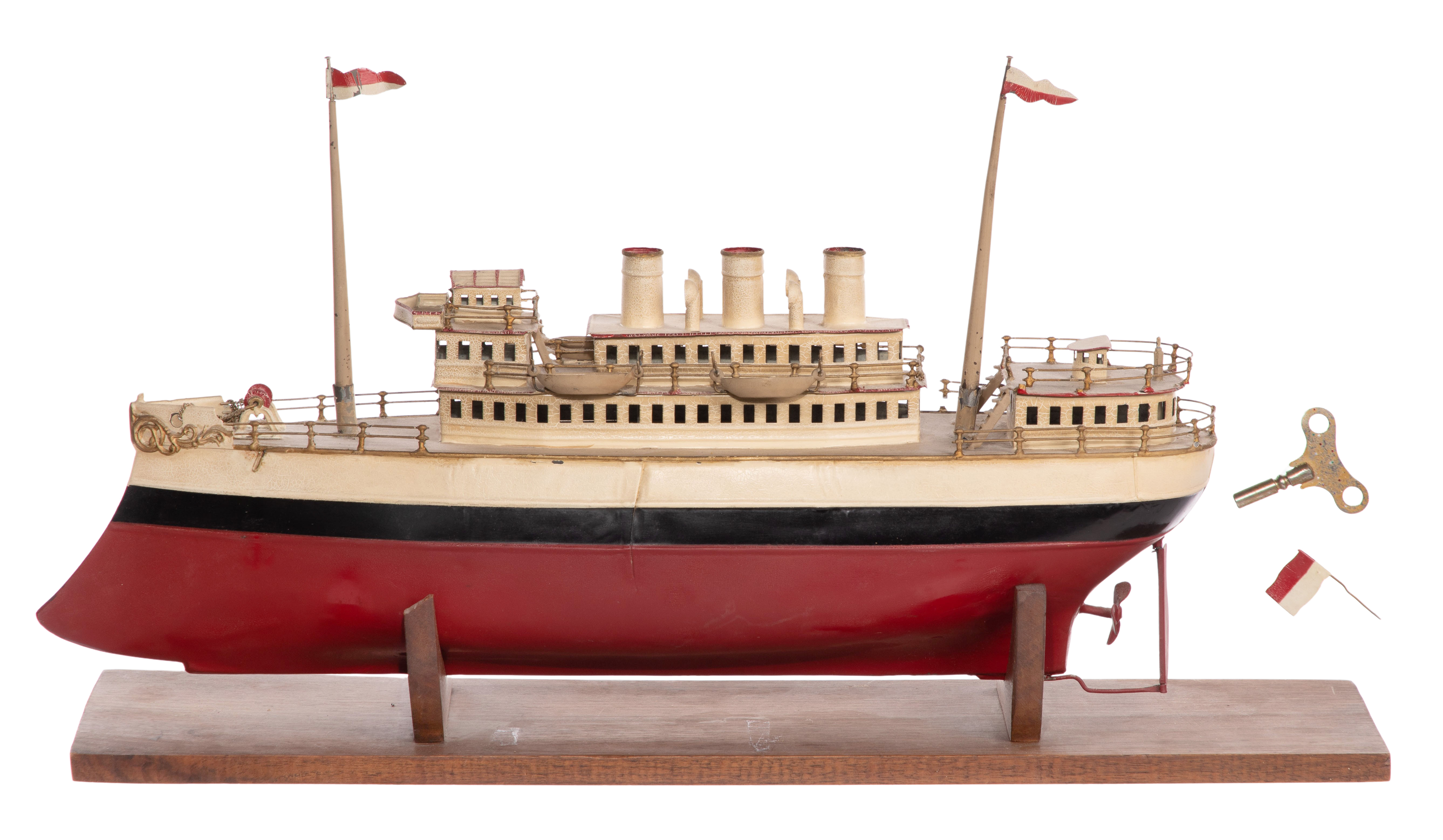 Condition: overall light to moderate wear consistent with normal use, occasional small losses to paint, cream colored paint having crazing, hull possibly repainted, a deck railing having a break at rear starboard, clockwork working weakly when tested (propeller shows slight intermittent motion), stand having light wear