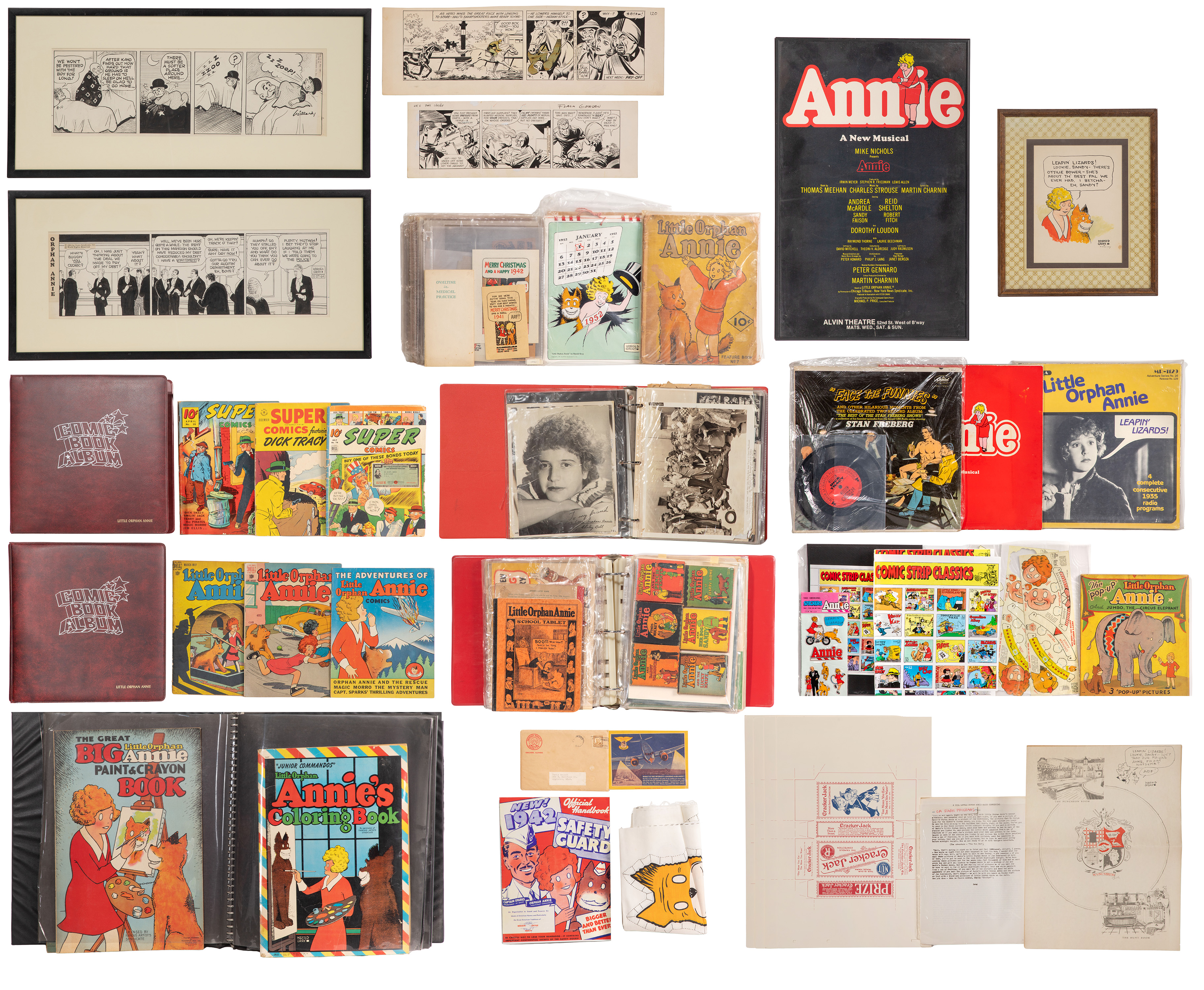Approximately (125) items including (5) binders of comic books, coloring books, Valentines, calendars, posters, mail, radio recordings, written commercials, comic strip proofs and puzzles; together with comic strips proofs from ‘Flash Gordon’ 1965, ‘The Flash’ 1965 and ‘Moon Mullins’ 1956