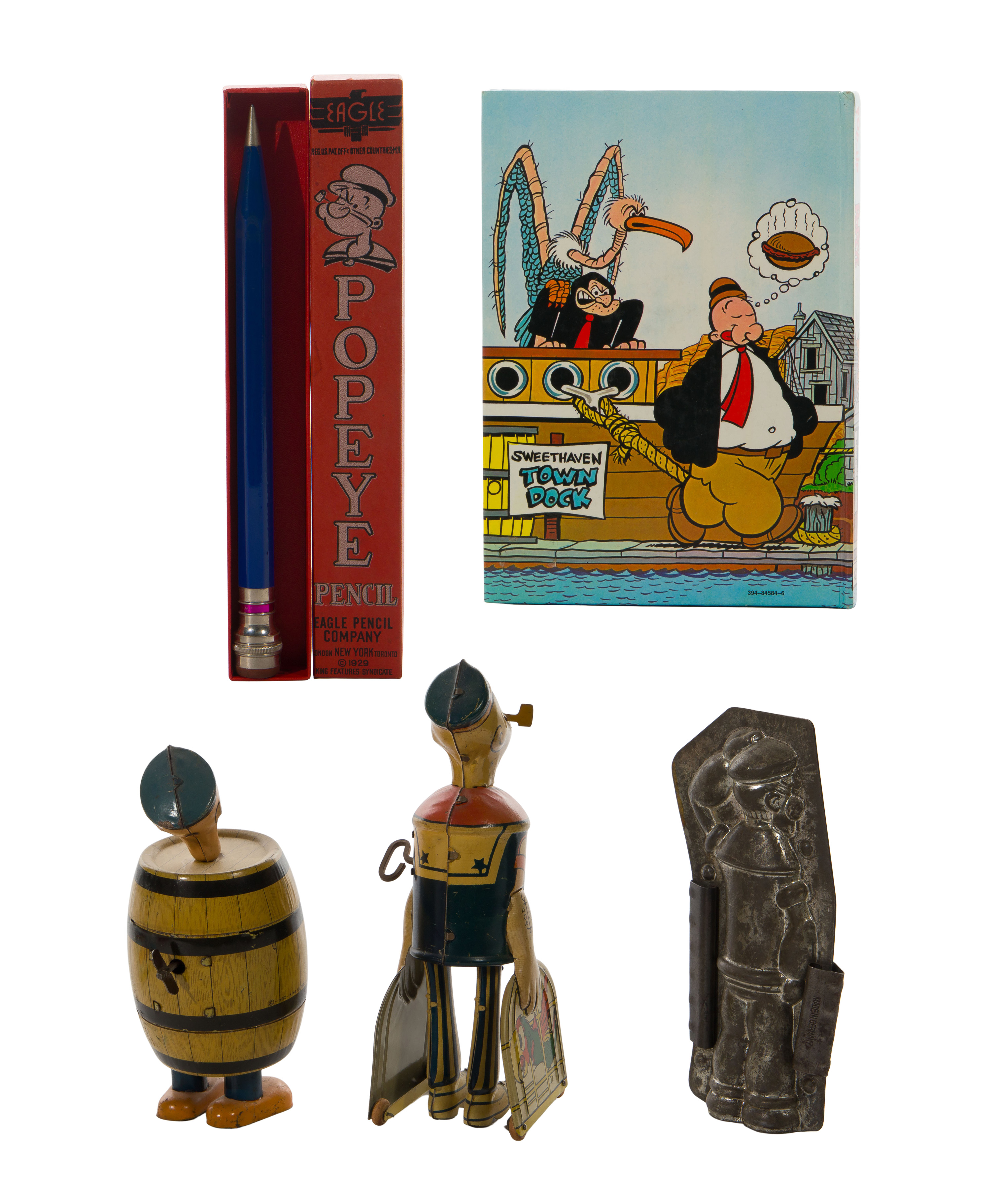 (5) items including a Marx tin litho wind-up, walking carrying caged parrots, a J. Chein tin litho wind-up walker in a barrel, an Eagle Pencil Company Popeye mechanical pencil in original box, a figural chocolate mold and a 1981 Random House pop-up book