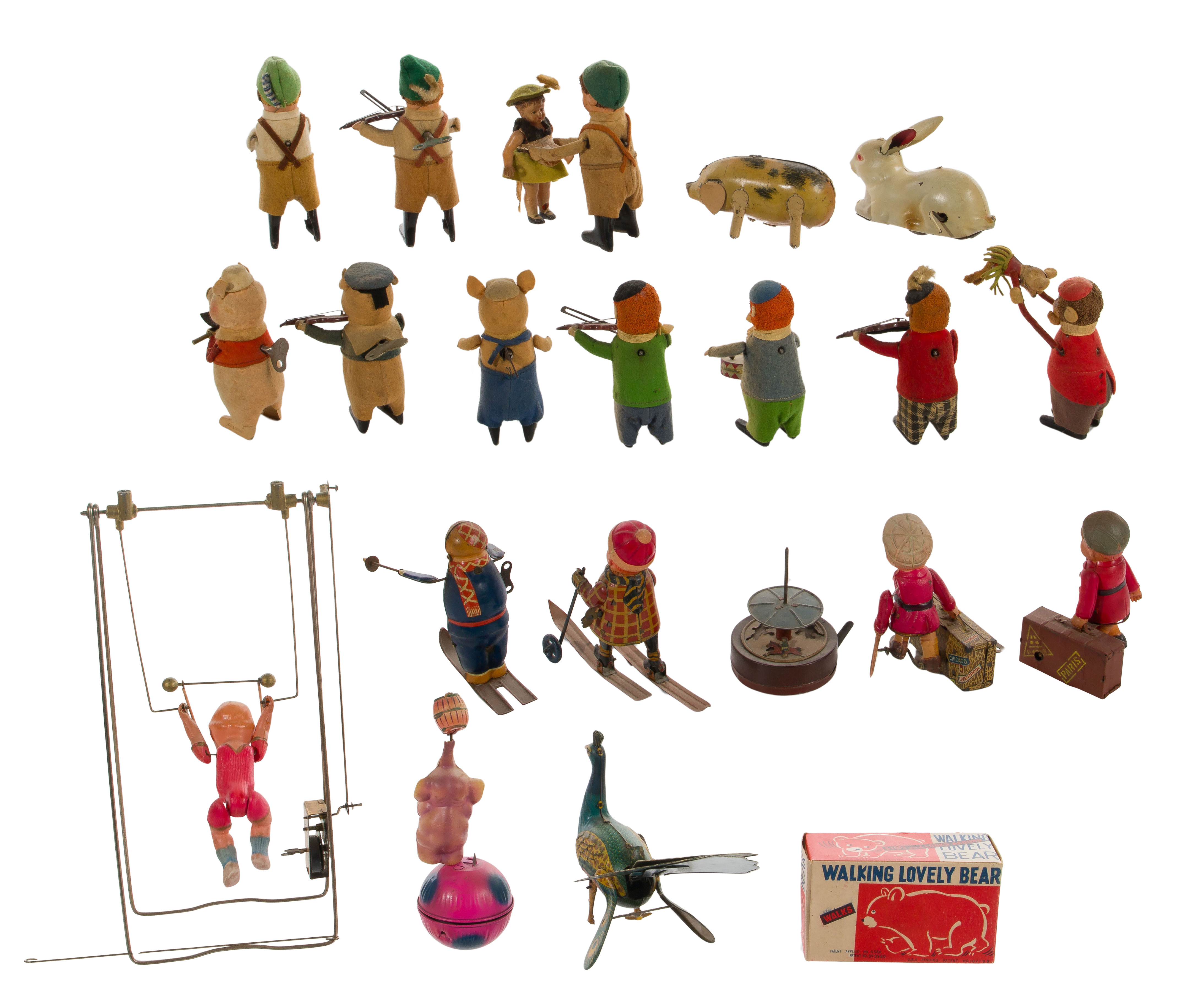 (21) items including, from Germany, a set of (3) musical pigs, a set of (3) musical clowns, a musical monkey, a Tyrolean violinist, a Tyrolean beer drinker and a Tyrolean lifting a girl over his head, all of fabric covered tin litho and celluloid by Schuco, from Japan, a tin litho peacock and (2) celluloid and tin litho suitcase walkers by Alps, (2) skiers by Nikko and an unmarked celluloid acrobat on metal rig, a pig, a rabbit, a celluloid and tin litho balancing elephant; together with an empty Modern Toys box and a lever-action carousel