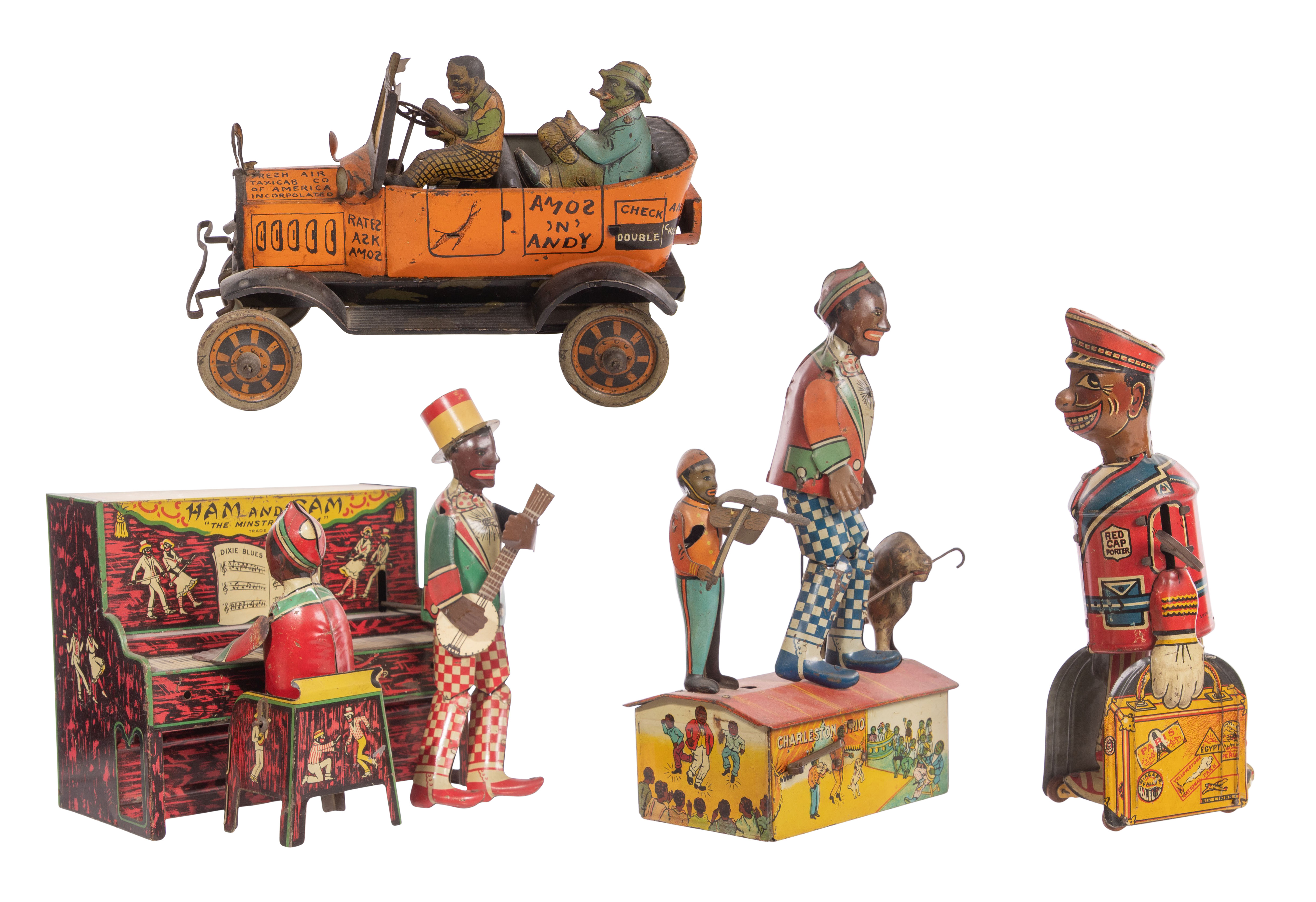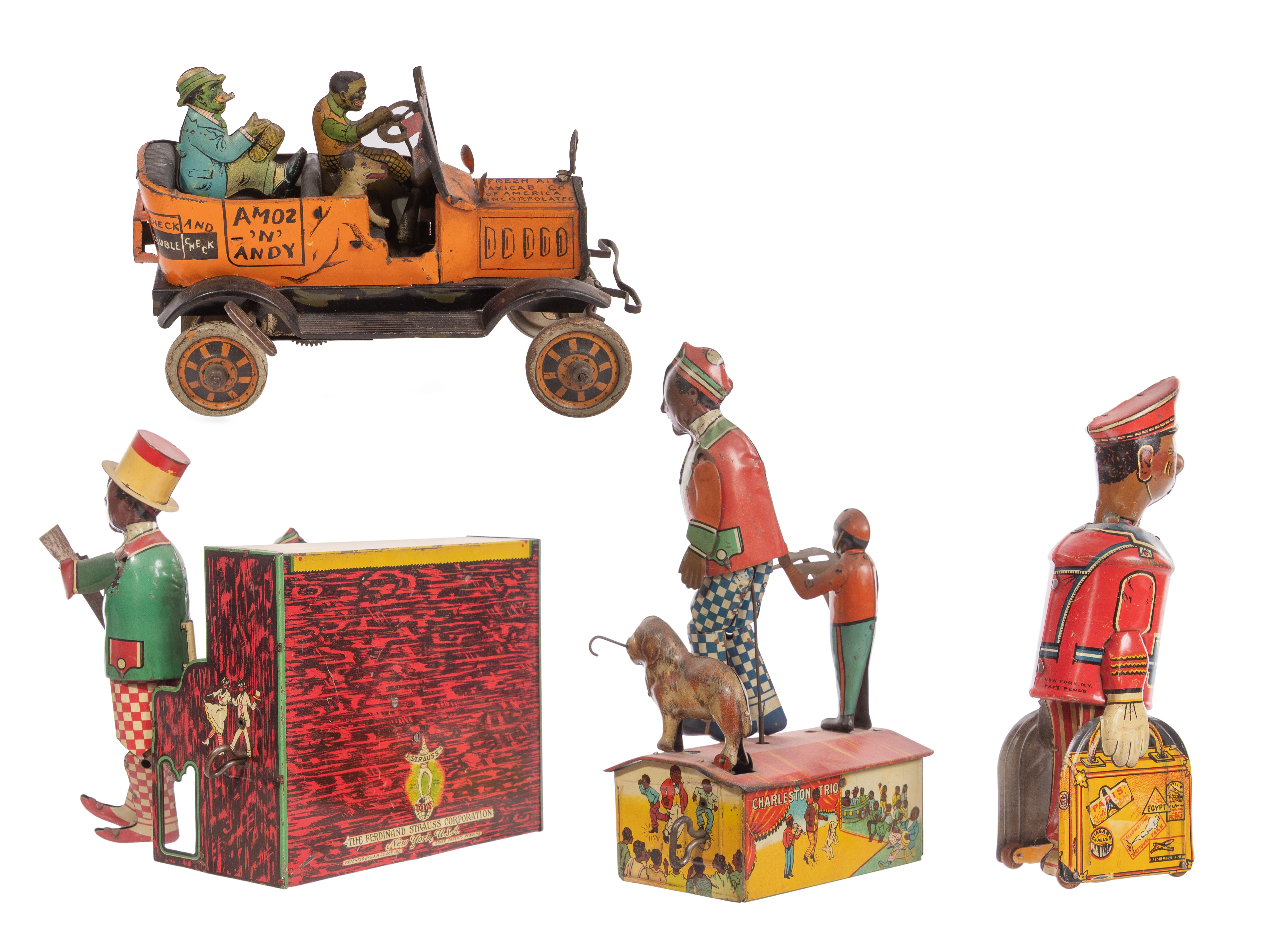 (4) items including a c.1930 Amos and Andy with a white dog in an open air taxi, a c.1920 Charleston Trio roof dancing toy, a Red Cap Porter carrying luggage, all marked ‘Marx’; together with Ham and Sam playing music marked ‘Ferdinand Strauss Corporation’
