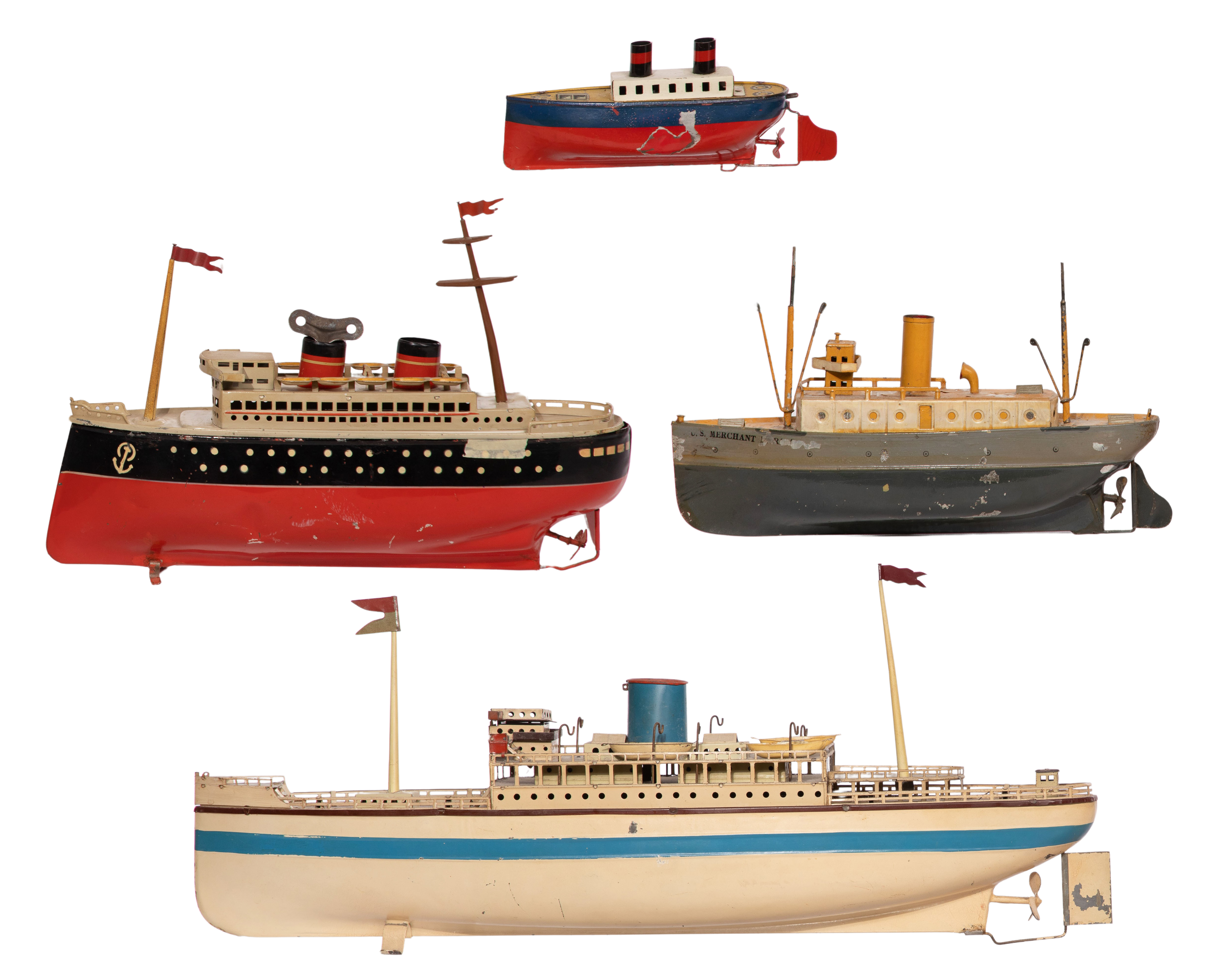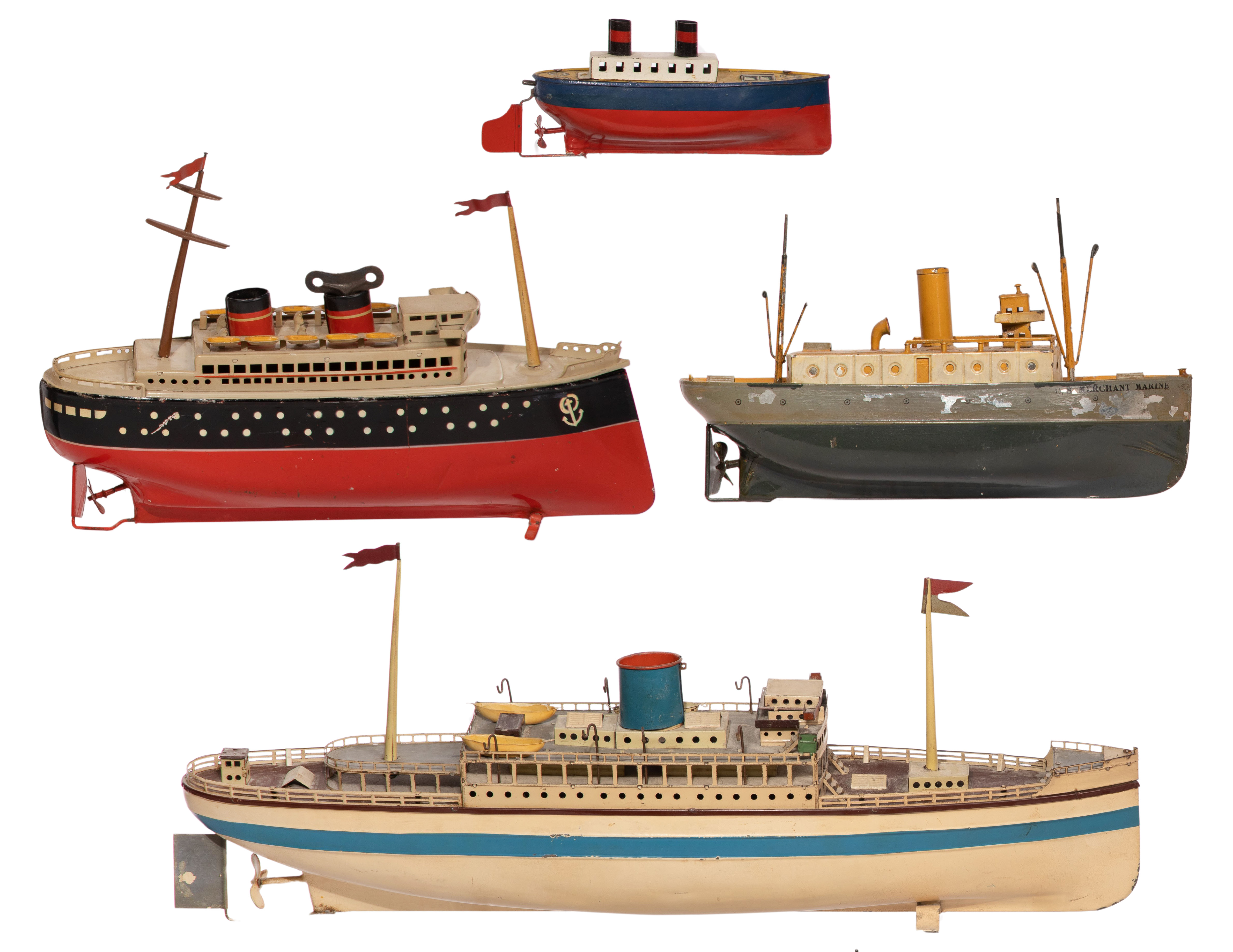 (4) items including a red two-stack ocean liner, a cream one-stack having removable life boats, a U.S. Merchant Marine and a smaller two-stack having lithographed deck, marked ‘W. Germany’, one key