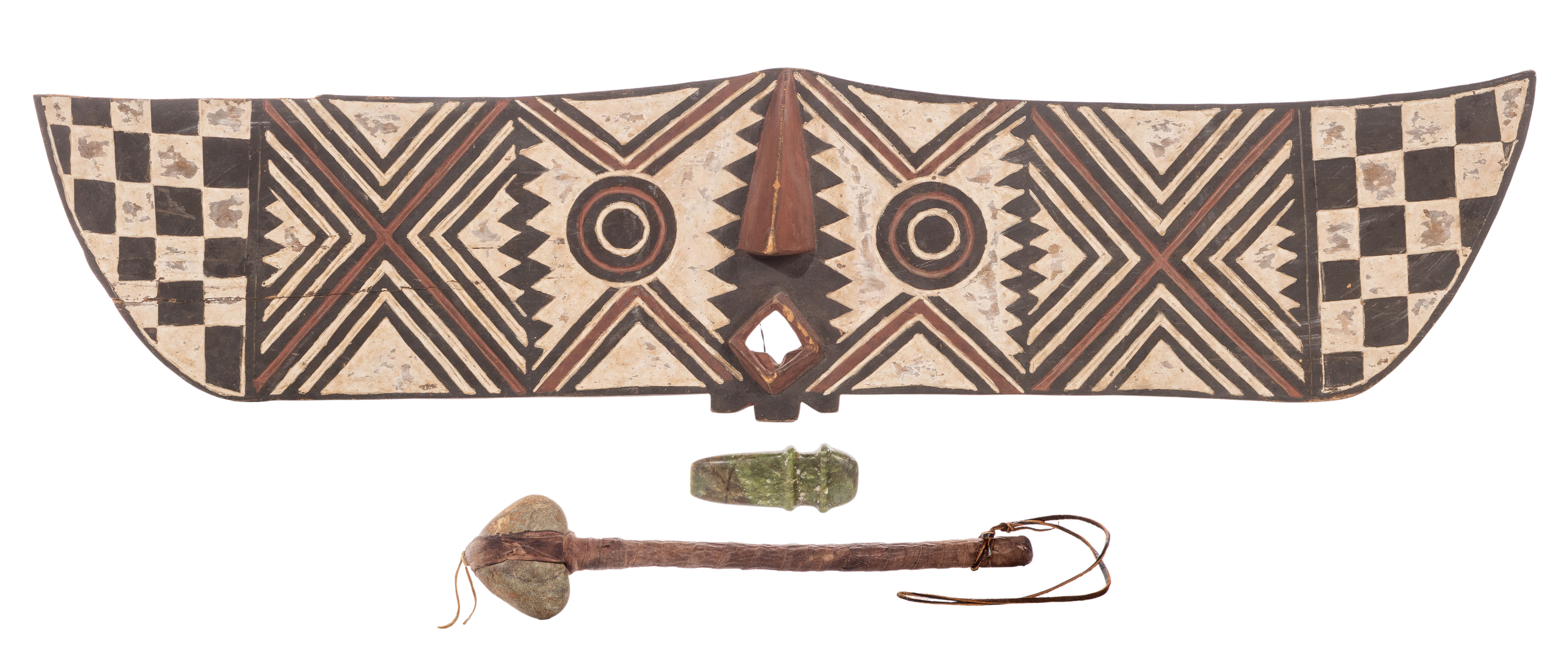 Condition: overall light to moderate wear consistent with normal use, axe head appearing polished, the hammer having a new leather strap, mask having splits along grain and loss to upper edge of left wing
