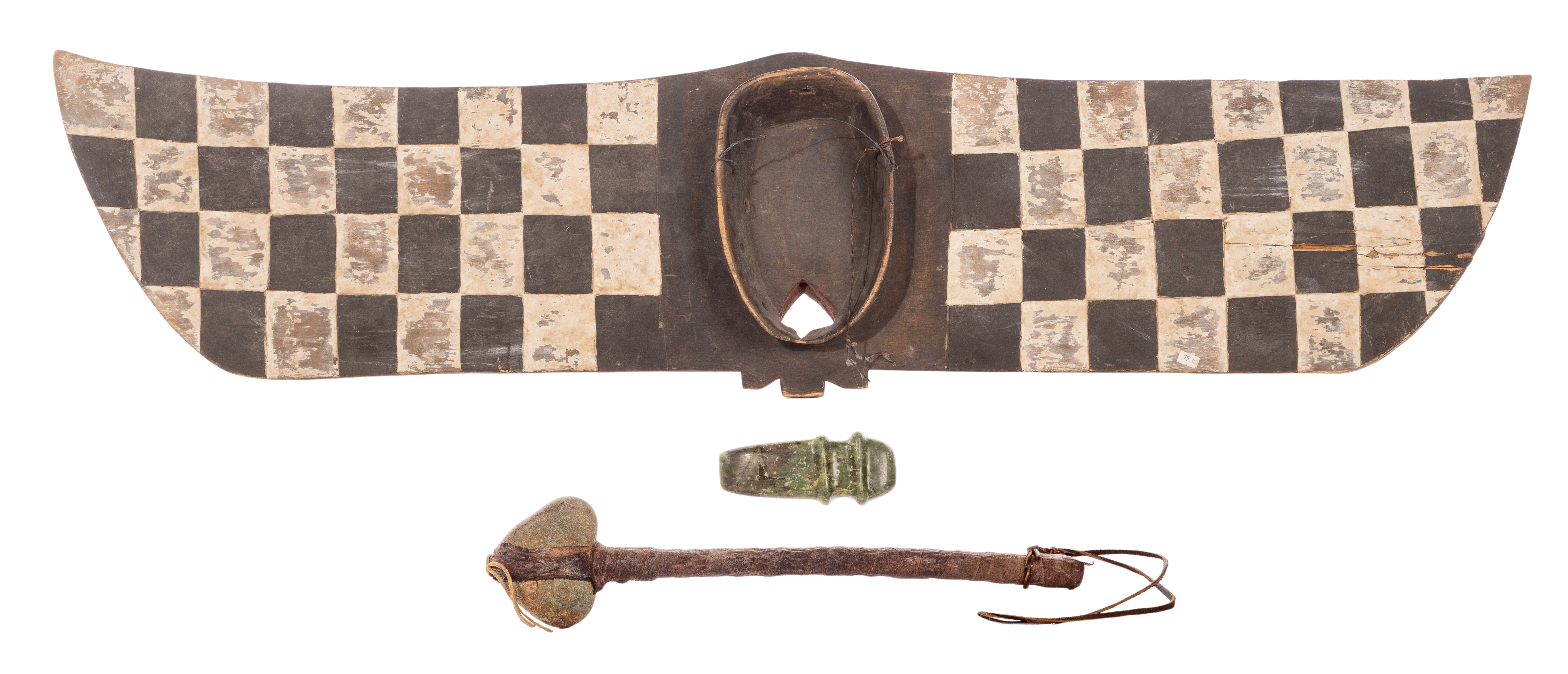(3) items including a Native American full-groove stone axe head having raised ridges flanking the groove, a Native American hammer stone hafted to the wood handle using rawhide and an African Bobo plank mask representing a butterfly from Burkina Faso