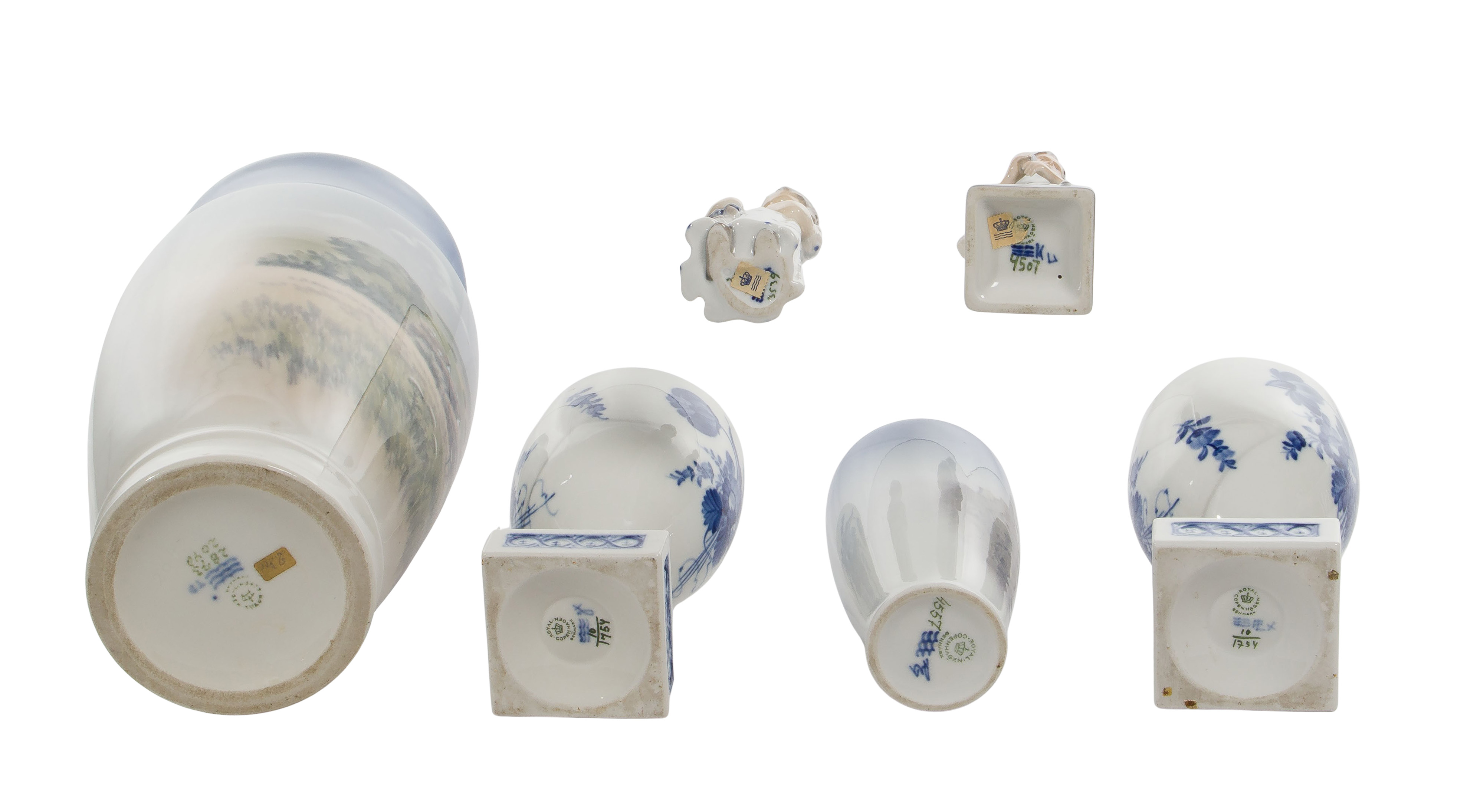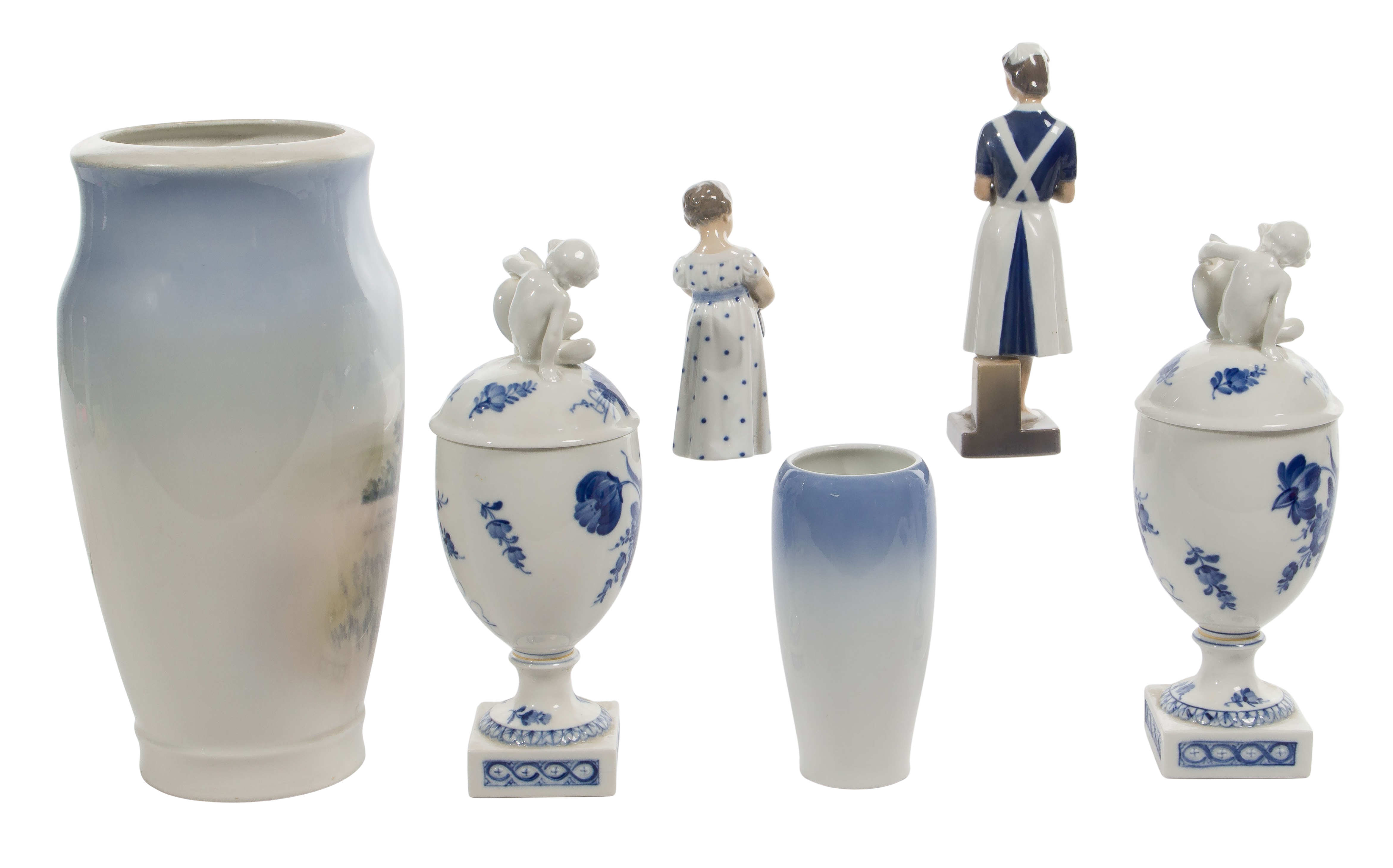 (5) items including (2) vases, (2) figurines and a pair of covered urns, all marked on underside