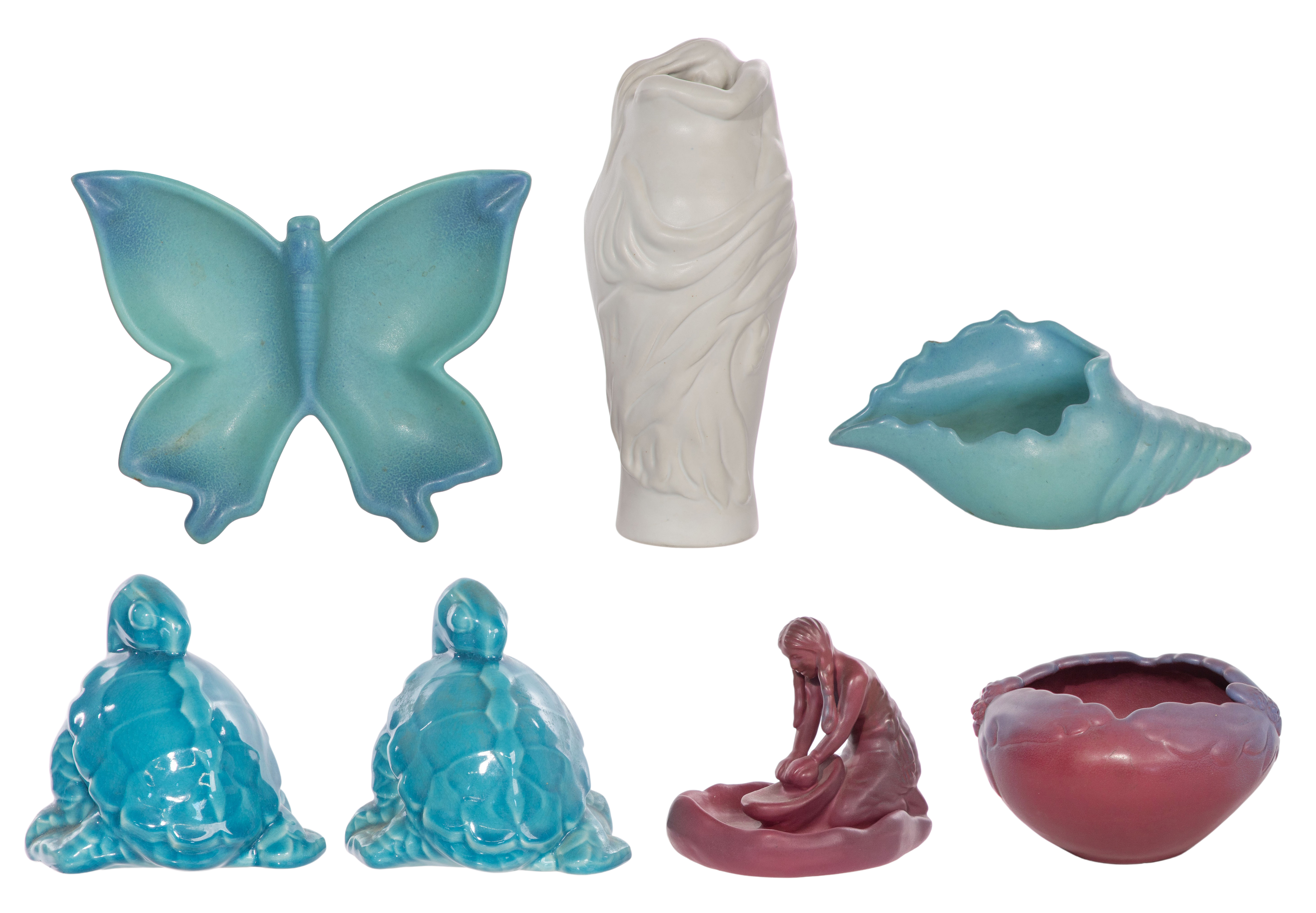 (7) total items including a Lorelei vase, a conch shell vase, an acorn vase, a corn grinding Hopi maiden and a butterfly ash receptacle, all having incised marks underside; together with a pair of Kenton Hills Porcelain turtle bookends having impressed marks underside and retaining foil labels to backs